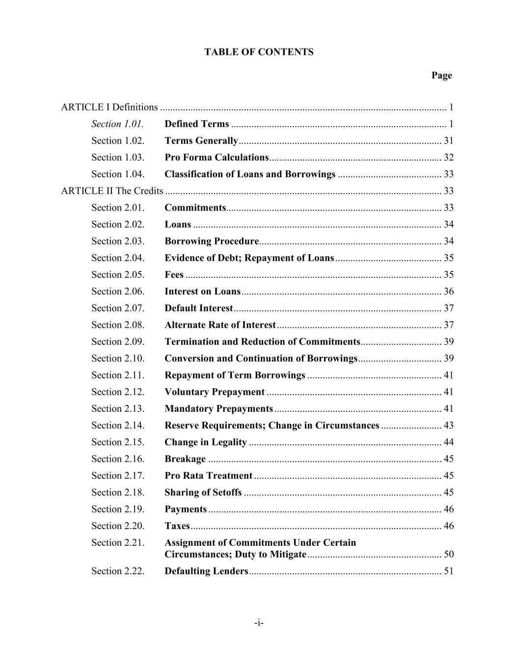 TABLE OF CONTENTS Page -i- ARTICLE I Definitions ................................................................................................................. 1 Section 1.01. Defined Terms ..................................................................................... 1 Section 1.02. Terms Generally ................................................................................ 31 Section 1.03. Pro Forma Calculations .................................................................... 32 Section 1.04. Classification of Loans and Borrowings ......................................... 33 ARTICLE II The Credits ............................................................................................................. 33 Section 2.01. Commitments..................................................................................... 33 Section 2.02. Loans .................................................................................................. 34 Section 2.03. Borrowing Procedure........................................................................ 34 Section 2.04. Evidence of Debt; Repayment of Loans .......................................... 35 Section 2.05. Fees ..................................................................................................... 35 Section 2.06. Interest on Loans ............................................................................... 36 Section 2.07. Default Interest .................................................................................. 37 Section 2.08. Alternate Rate of Interest ................................................................. 37 Section 2.09. Termination and Reduction of Commitments ................................ 39 Section 2.10. Conversion and Continuation of Borrowings ................................. 39 Section 2.11. Repayment of Term Borrowings ..................................................... 41 Section 2.12. Voluntary Prepayment ..................................................................... 41 Section 2.13. Mandatory Prepayments .................................................................. 41 Section 2.14. Reserve Requirements; Change in Circumstances ........................ 43 Section 2.15. Change in Legality ............................................................................ 44 Section 2.16. Breakage ............................................................................................ 45 Section 2.17. Pro Rata Treatment .......................................................................... 45 Section 2.18. Sharing of Setoffs .............................................................................. 45 Section 2.19. Payments ............................................................................................ 46 Section 2.20. Taxes ................................................................................................... 46 Section 2.21. Assignment of Commitments Under Certain Circumstances; Duty to Mitigate ..................................................... 50 Section 2.22. Defaulting Lenders ............................................................................ 51