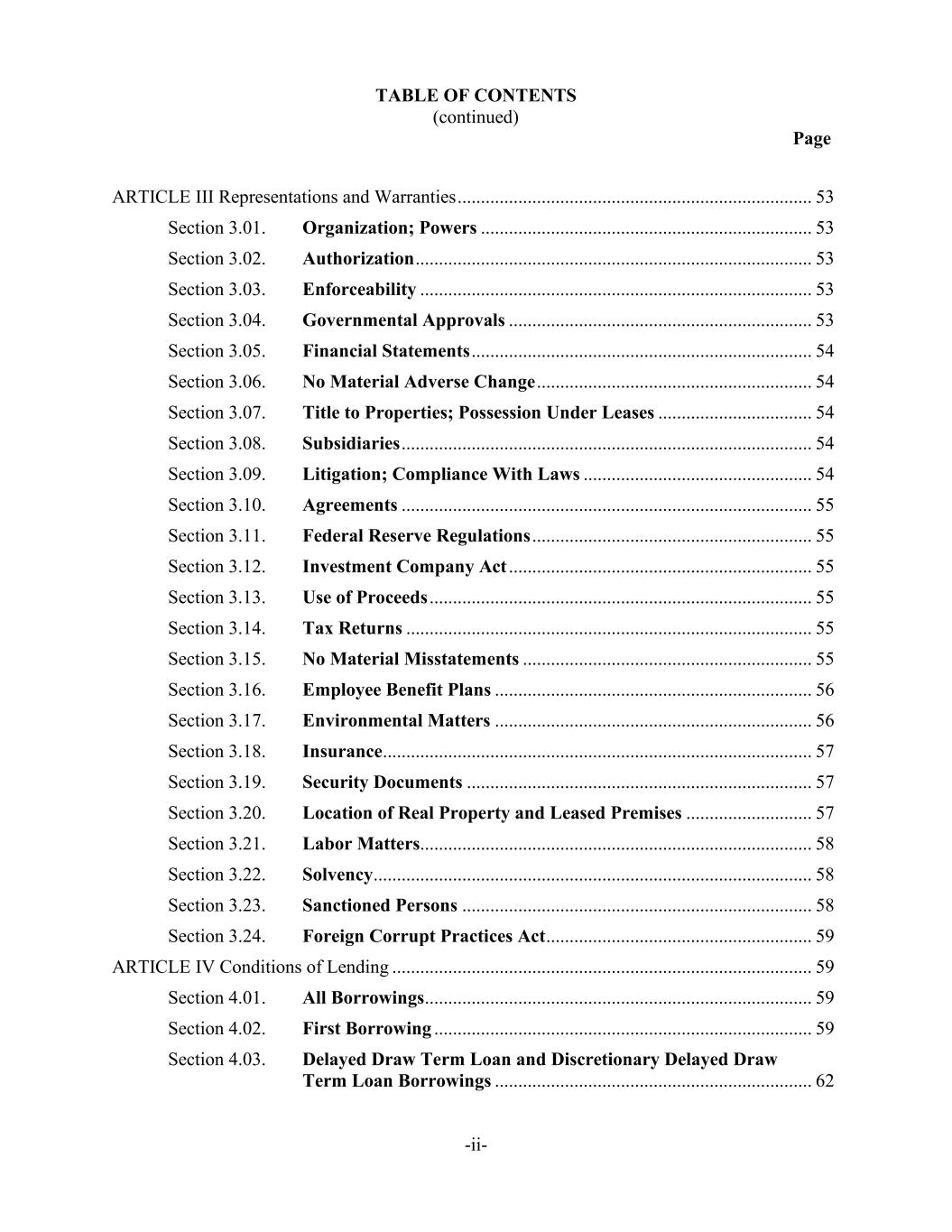 TABLE OF CONTENTS (continued) Page -ii- ARTICLE III Representations and Warranties ............................................................................ 53 Section 3.01. Organization; Powers ....................................................................... 53 Section 3.02. Authorization ..................................................................................... 53 Section 3.03. Enforceability .................................................................................... 53 Section 3.04. Governmental Approvals ................................................................. 53 Section 3.05. Financial Statements ......................................................................... 54 Section 3.06. No Material Adverse Change ........................................................... 54 Section 3.07. Title to Properties; Possession Under Leases ................................. 54 Section 3.08. Subsidiaries ........................................................................................ 54 Section 3.09. Litigation; Compliance With Laws ................................................. 54 Section 3.10. Agreements ........................................................................................ 55 Section 3.11. Federal Reserve Regulations ............................................................ 55 Section 3.12. Investment Company Act ................................................................. 55 Section 3.13. Use of Proceeds .................................................................................. 55 Section 3.14. Tax Returns ....................................................................................... 55 Section 3.15. No Material Misstatements .............................................................. 55 Section 3.16. Employee Benefit Plans .................................................................... 56 Section 3.17. Environmental Matters .................................................................... 56 Section 3.18. Insurance ............................................................................................ 57 Section 3.19. Security Documents .......................................................................... 57 Section 3.20. Location of Real Property and Leased Premises ........................... 57 Section 3.21. Labor Matters.................................................................................... 58 Section 3.22. Solvency .............................................................................................. 58 Section 3.23. Sanctioned Persons ........................................................................... 58 Section 3.24. Foreign Corrupt Practices Act ......................................................... 59 ARTICLE IV Conditions of Lending .......................................................................................... 59 Section 4.01. All Borrowings ................................................................................... 59 Section 4.02. First Borrowing ................................................................................. 59 Section 4.03. Delayed Draw Term Loan and Discretionary Delayed Draw Term Loan Borrowings .................................................................... 62