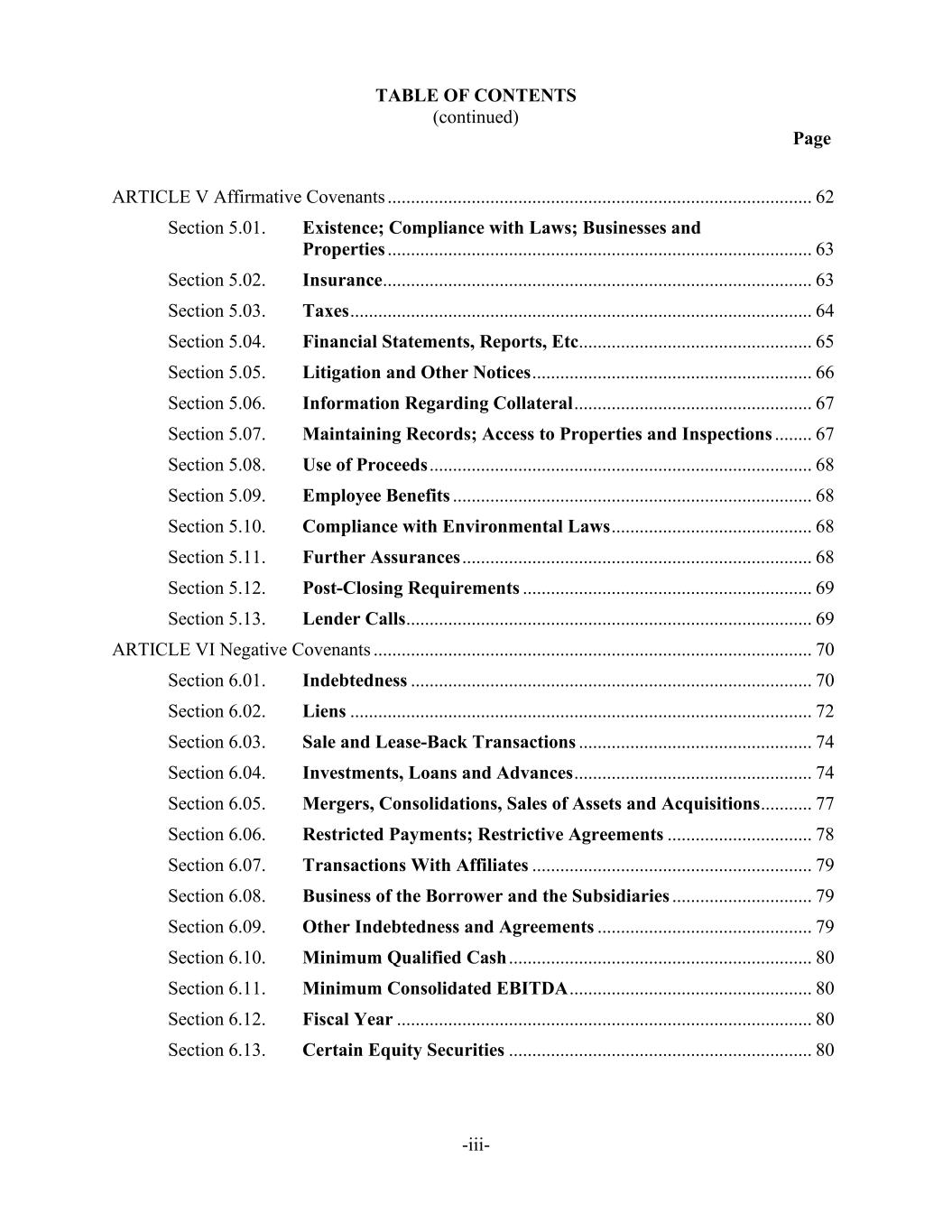 TABLE OF CONTENTS (continued) Page -iii- ARTICLE V Affirmative Covenants ........................................................................................... 62 Section 5.01. Existence; Compliance with Laws; Businesses and Properties ........................................................................................... 63 Section 5.02. Insurance ............................................................................................ 63 Section 5.03. Taxes ................................................................................................... 64 Section 5.04. Financial Statements, Reports, Etc.................................................. 65 Section 5.05. Litigation and Other Notices ............................................................ 66 Section 5.06. Information Regarding Collateral ................................................... 67 Section 5.07. Maintaining Records; Access to Properties and Inspections ........ 67 Section 5.08. Use of Proceeds .................................................................................. 68 Section 5.09. Employee Benefits ............................................................................. 68 Section 5.10. Compliance with Environmental Laws ........................................... 68 Section 5.11. Further Assurances ........................................................................... 68 Section 5.12. Post-Closing Requirements .............................................................. 69 Section 5.13. Lender Calls ....................................................................................... 69 ARTICLE VI Negative Covenants .............................................................................................. 70 Section 6.01. Indebtedness ...................................................................................... 70 Section 6.02. Liens ................................................................................................... 72 Section 6.03. Sale and Lease-Back Transactions .................................................. 74 Section 6.04. Investments, Loans and Advances ................................................... 74 Section 6.05. Mergers, Consolidations, Sales of Assets and Acquisitions ........... 77 Section 6.06. Restricted Payments; Restrictive Agreements ............................... 78 Section 6.07. Transactions With Affiliates ............................................................ 79 Section 6.08. Business of the Borrower and the Subsidiaries .............................. 79 Section 6.09. Other Indebtedness and Agreements .............................................. 79 Section 6.10. Minimum Qualified Cash ................................................................. 80 Section 6.11. Minimum Consolidated EBITDA .................................................... 80 Section 6.12. Fiscal Year ......................................................................................... 80 Section 6.13. Certain Equity Securities ................................................................. 80