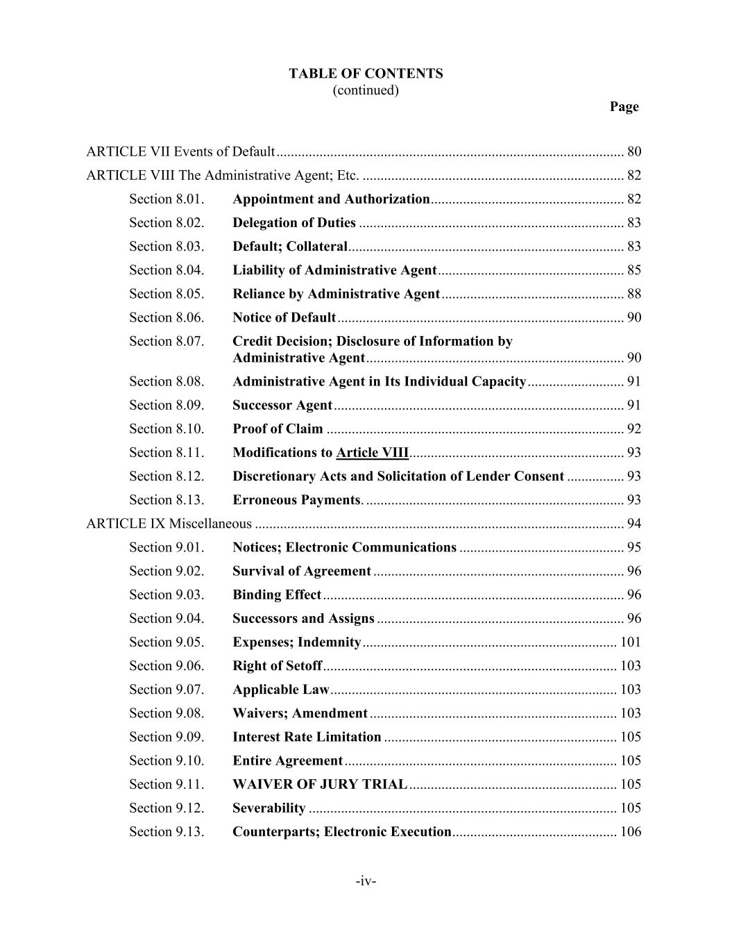 TABLE OF CONTENTS (continued) Page -iv- ARTICLE VII Events of Default ................................................................................................. 80 ARTICLE VIII The Administrative Agent; Etc. ......................................................................... 82 Section 8.01. Appointment and Authorization ...................................................... 82 Section 8.02. Delegation of Duties .......................................................................... 83 Section 8.03. Default; Collateral ............................................................................. 83 Section 8.04. Liability of Administrative Agent .................................................... 85 Section 8.05. Reliance by Administrative Agent ................................................... 88 Section 8.06. Notice of Default ................................................................................ 90 Section 8.07. Credit Decision; Disclosure of Information by Administrative Agent ........................................................................ 90 Section 8.08. Administrative Agent in Its Individual Capacity ........................... 91 Section 8.09. Successor Agent ................................................................................. 91 Section 8.10. Proof of Claim ................................................................................... 92 Section 8.11. Modifications to Article VIII............................................................ 93 Section 8.12. Discretionary Acts and Solicitation of Lender Consent ................ 93 Section 8.13. Erroneous Payments. ........................................................................ 93 ARTICLE IX Miscellaneous ....................................................................................................... 94 Section 9.01. Notices; Electronic Communications .............................................. 95 Section 9.02. Survival of Agreement ...................................................................... 96 Section 9.03. Binding Effect .................................................................................... 96 Section 9.04. Successors and Assigns ..................................................................... 96 Section 9.05. Expenses; Indemnity ....................................................................... 101 Section 9.06. Right of Setoff .................................................................................. 103 Section 9.07. Applicable Law ................................................................................ 103 Section 9.08. Waivers; Amendment ..................................................................... 103 Section 9.09. Interest Rate Limitation ................................................................. 105 Section 9.10. Entire Agreement ............................................................................ 105 Section 9.11. WAIVER OF JURY TRIAL .......................................................... 105 Section 9.12. Severability ...................................................................................... 105 Section 9.13. Counterparts; Electronic Execution .............................................. 106