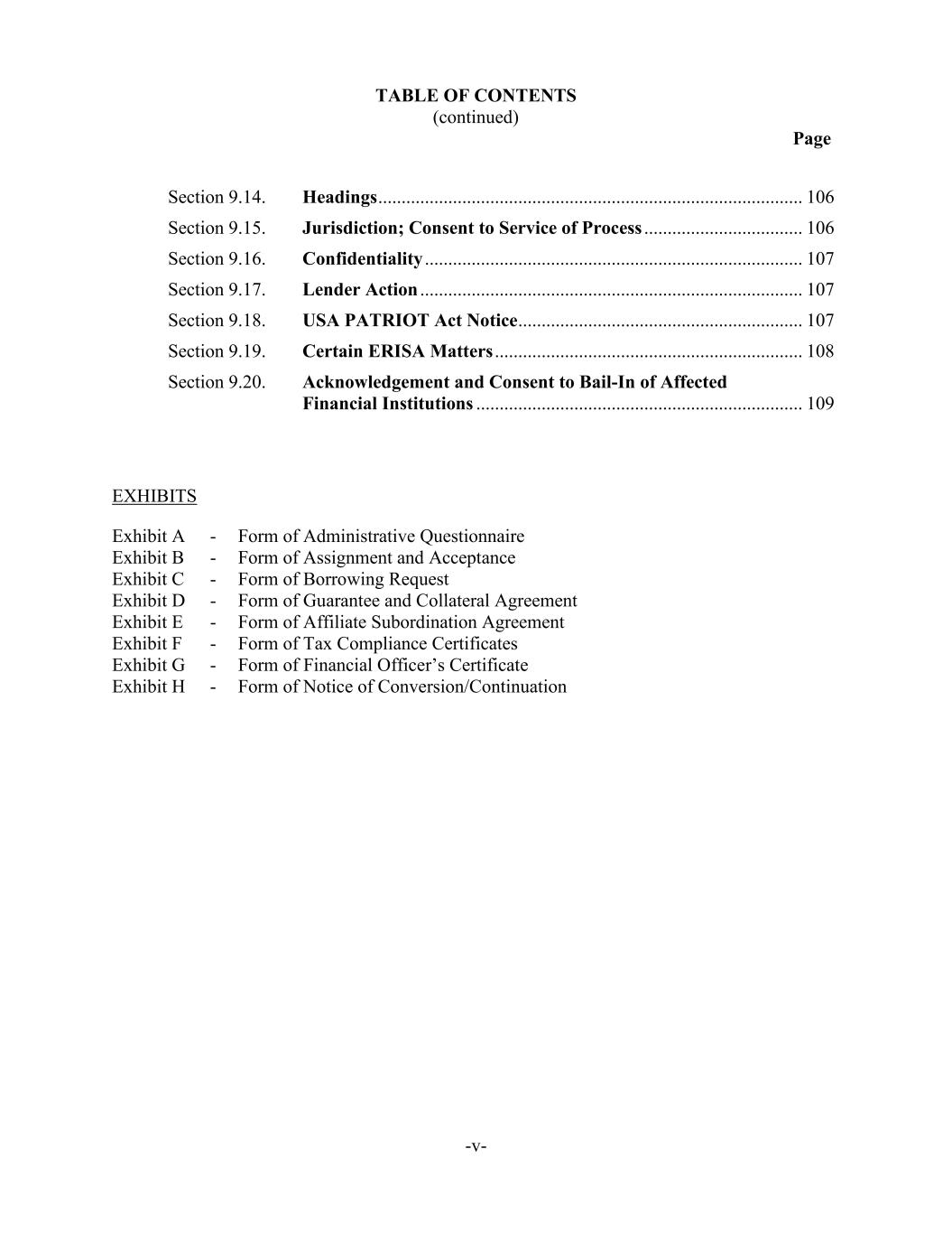 TABLE OF CONTENTS (continued) Page -v- Section 9.14. Headings ........................................................................................... 106 Section 9.15. Jurisdiction; Consent to Service of Process .................................. 106 Section 9.16. Confidentiality ................................................................................. 107 Section 9.17. Lender Action .................................................................................. 107 Section 9.18. USA PATRIOT Act Notice ............................................................. 107 Section 9.19. Certain ERISA Matters .................................................................. 108 Section 9.20. Acknowledgement and Consent to Bail-In of Affected Financial Institutions ...................................................................... 109 EXHIBITS Exhibit A - Form of Administrative Questionnaire Exhibit B - Form of Assignment and Acceptance Exhibit C - Form of Borrowing Request Exhibit D - Form of Guarantee and Collateral Agreement Exhibit E - Form of Affiliate Subordination Agreement Exhibit F - Form of Tax Compliance Certificates Exhibit G - Form of Financial Officer’s Certificate Exhibit H - Form of Notice of Conversion/Continuation