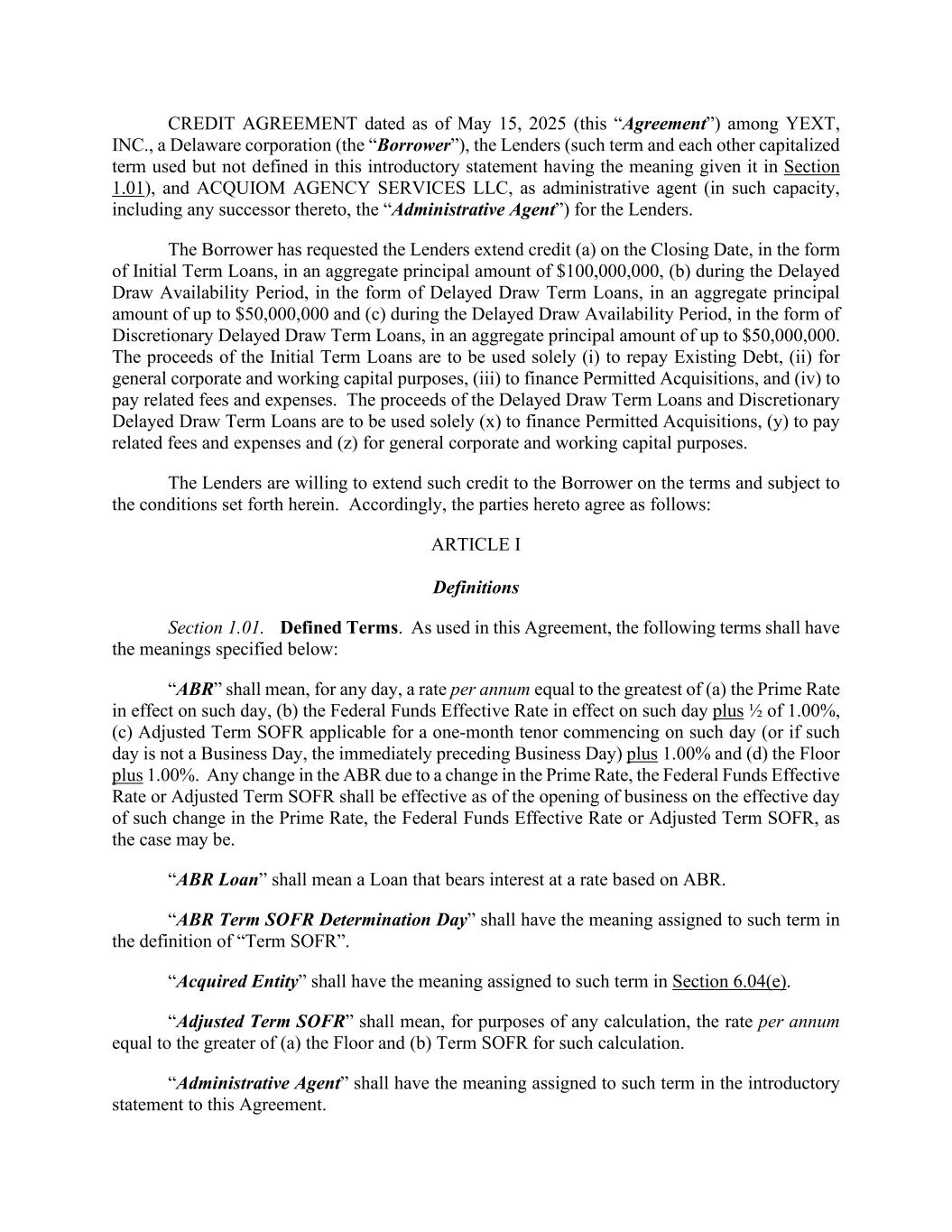 CREDIT AGREEMENT dated as of May 15, 2025 (this “Agreement”) among YEXT, INC., a Delaware corporation (the “Borrower”), the Lenders (such term and each other capitalized term used but not defined in this introductory statement having the meaning given it in Section 1.01), and ACQUIOM AGENCY SERVICES LLC, as administrative agent (in such capacity, including any successor thereto, the “Administrative Agent”) for the Lenders. The Borrower has requested the Lenders extend credit (a) on the Closing Date, in the form of Initial Term Loans, in an aggregate principal amount of $100,000,000, (b) during the Delayed Draw Availability Period, in the form of Delayed Draw Term Loans, in an aggregate principal amount of up to $50,000,000 and (c) during the Delayed Draw Availability Period, in the form of Discretionary Delayed Draw Term Loans, in an aggregate principal amount of up to $50,000,000. The proceeds of the Initial Term Loans are to be used solely (i) to repay Existing Debt, (ii) for general corporate and working capital purposes, (iii) to finance Permitted Acquisitions, and (iv) to pay related fees and expenses. The proceeds of the Delayed Draw Term Loans and Discretionary Delayed Draw Term Loans are to be used solely (x) to finance Permitted Acquisitions, (y) to pay related fees and expenses and (z) for general corporate and working capital purposes. The Lenders are willing to extend such credit to the Borrower on the terms and subject to the conditions set forth herein. Accordingly, the parties hereto agree as follows: ARTICLE I Definitions Section 1.01. Defined Terms. As used in this Agreement, the following terms shall have the meanings specified below: “ABR” shall mean, for any day, a rate per annum equal to the greatest of (a) the Prime Rate in effect on such day, (b) the Federal Funds Effective Rate in effect on such day plus ½ of 1.00%, (c) Adjusted Term SOFR applicable for a one-month tenor commencing on such day (or if such day is not a Business Day, the immediately preceding Business Day) plus 1.00% and (d) the Floor plus 1.00%. Any change in the ABR due to a change in the Prime Rate, the Federal Funds Effective Rate or Adjusted Term SOFR shall be effective as of the opening of business on the effective day of such change in the Prime Rate, the Federal Funds Effective Rate or Adjusted Term SOFR, as the case may be. “ABR Loan” shall mean a Loan that bears interest at a rate based on ABR. “ABR Term SOFR Determination Day” shall have the meaning assigned to such term in the definition of “Term SOFR”. “Acquired Entity” shall have the meaning assigned to such term in Section 6.04(e). “Adjusted Term SOFR” shall mean, for purposes of any calculation, the rate per annum equal to the greater of (a) the Floor and (b) Term SOFR for such calculation. “Administrative Agent” shall have the meaning assigned to such term in the introductory statement to this Agreement.