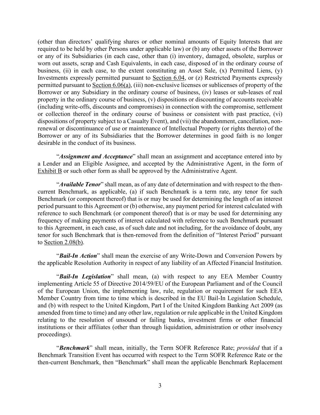 3 (other than directors’ qualifying shares or other nominal amounts of Equity Interests that are required to be held by other Persons under applicable law) or (b) any other assets of the Borrower or any of its Subsidiaries (in each case, other than (i) inventory, damaged, obsolete, surplus or worn out assets, scrap and Cash Equivalents, in each case, disposed of in the ordinary course of business, (ii) in each case, to the extent constituting an Asset Sale, (x) Permitted Liens, (y) Investments expressly permitted pursuant to Section 6.04, or (z) Restricted Payments expressly permitted pursuant to Section 6.06(a), (iii) non-exclusive licenses or sublicenses of property of the Borrower or any Subsidiary in the ordinary course of business, (iv) leases or sub-leases of real property in the ordinary course of business, (v) dispositions or discounting of accounts receivable (including write-offs, discounts and compromises) in connection with the compromise, settlement or collection thereof in the ordinary course of business or consistent with past practice, (vi) dispositions of property subject to a Casualty Event), and (vii) the abandonment, cancellation, non- renewal or discontinuance of use or maintenance of Intellectual Property (or rights thereto) of the Borrower or any of its Subsidiaries that the Borrower determines in good faith is no longer desirable in the conduct of its business. “Assignment and Acceptance” shall mean an assignment and acceptance entered into by a Lender and an Eligible Assignee, and accepted by the Administrative Agent, in the form of Exhibit B or such other form as shall be approved by the Administrative Agent. “Available Tenor” shall mean, as of any date of determination and with respect to the then- current Benchmark, as applicable, (a) if such Benchmark is a term rate, any tenor for such Benchmark (or component thereof) that is or may be used for determining the length of an interest period pursuant to this Agreement or (b) otherwise, any payment period for interest calculated with reference to such Benchmark (or component thereof) that is or may be used for determining any frequency of making payments of interest calculated with reference to such Benchmark pursuant to this Agreement, in each case, as of such date and not including, for the avoidance of doubt, any tenor for such Benchmark that is then-removed from the definition of “Interest Period” pursuant to Section 2.08(b). “Bail-In Action” shall mean the exercise of any Write-Down and Conversion Powers by the applicable Resolution Authority in respect of any liability of an Affected Financial Institution. “Bail-In Legislation” shall mean, (a) with respect to any EEA Member Country implementing Article 55 of Directive 2014/59/EU of the European Parliament and of the Council of the European Union, the implementing law, rule, regulation or requirement for such EEA Member Country from time to time which is described in the EU Bail-In Legislation Schedule, and (b) with respect to the United Kingdom, Part I of the United Kingdom Banking Act 2009 (as amended from time to time) and any other law, regulation or rule applicable in the United Kingdom relating to the resolution of unsound or failing banks, investment firms or other financial institutions or their affiliates (other than through liquidation, administration or other insolvency proceedings). “Benchmark” shall mean, initially, the Term SOFR Reference Rate; provided that if a Benchmark Transition Event has occurred with respect to the Term SOFR Reference Rate or the then-current Benchmark, then “Benchmark” shall mean the applicable Benchmark Replacement