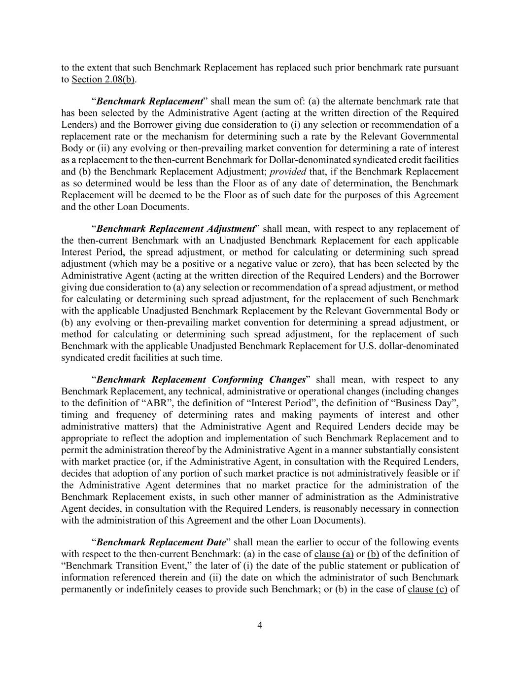 4 to the extent that such Benchmark Replacement has replaced such prior benchmark rate pursuant to Section 2.08(b). “Benchmark Replacement” shall mean the sum of: (a) the alternate benchmark rate that has been selected by the Administrative Agent (acting at the written direction of the Required Lenders) and the Borrower giving due consideration to (i) any selection or recommendation of a replacement rate or the mechanism for determining such a rate by the Relevant Governmental Body or (ii) any evolving or then-prevailing market convention for determining a rate of interest as a replacement to the then-current Benchmark for Dollar-denominated syndicated credit facilities and (b) the Benchmark Replacement Adjustment; provided that, if the Benchmark Replacement as so determined would be less than the Floor as of any date of determination, the Benchmark Replacement will be deemed to be the Floor as of such date for the purposes of this Agreement and the other Loan Documents. “Benchmark Replacement Adjustment” shall mean, with respect to any replacement of the then-current Benchmark with an Unadjusted Benchmark Replacement for each applicable Interest Period, the spread adjustment, or method for calculating or determining such spread adjustment (which may be a positive or a negative value or zero), that has been selected by the Administrative Agent (acting at the written direction of the Required Lenders) and the Borrower giving due consideration to (a) any selection or recommendation of a spread adjustment, or method for calculating or determining such spread adjustment, for the replacement of such Benchmark with the applicable Unadjusted Benchmark Replacement by the Relevant Governmental Body or (b) any evolving or then-prevailing market convention for determining a spread adjustment, or method for calculating or determining such spread adjustment, for the replacement of such Benchmark with the applicable Unadjusted Benchmark Replacement for U.S. dollar-denominated syndicated credit facilities at such time. “Benchmark Replacement Conforming Changes” shall mean, with respect to any Benchmark Replacement, any technical, administrative or operational changes (including changes to the definition of “ABR”, the definition of “Interest Period”, the definition of “Business Day”, timing and frequency of determining rates and making payments of interest and other administrative matters) that the Administrative Agent and Required Lenders decide may be appropriate to reflect the adoption and implementation of such Benchmark Replacement and to permit the administration thereof by the Administrative Agent in a manner substantially consistent with market practice (or, if the Administrative Agent, in consultation with the Required Lenders, decides that adoption of any portion of such market practice is not administratively feasible or if the Administrative Agent determines that no market practice for the administration of the Benchmark Replacement exists, in such other manner of administration as the Administrative Agent decides, in consultation with the Required Lenders, is reasonably necessary in connection with the administration of this Agreement and the other Loan Documents). “Benchmark Replacement Date” shall mean the earlier to occur of the following events with respect to the then-current Benchmark: (a) in the case of clause (a) or (b) of the definition of “Benchmark Transition Event,” the later of (i) the date of the public statement or publication of information referenced therein and (ii) the date on which the administrator of such Benchmark permanently or indefinitely ceases to provide such Benchmark; or (b) in the case of clause (c) of
