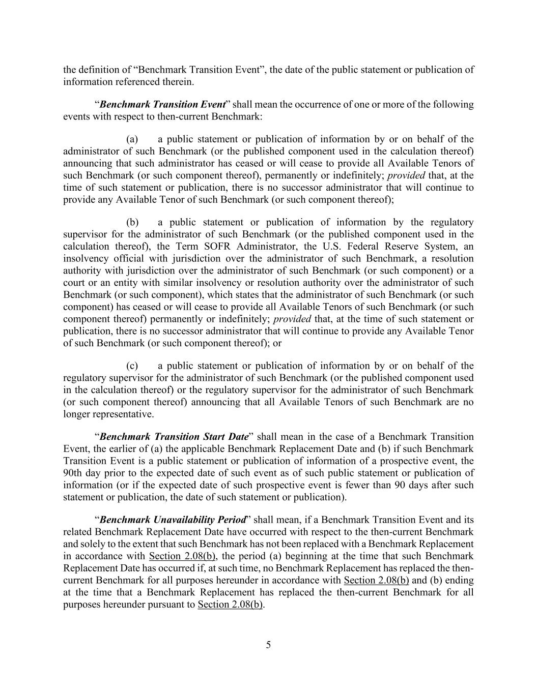 5 the definition of “Benchmark Transition Event”, the date of the public statement or publication of information referenced therein. “Benchmark Transition Event” shall mean the occurrence of one or more of the following events with respect to then-current Benchmark: (a) a public statement or publication of information by or on behalf of the administrator of such Benchmark (or the published component used in the calculation thereof) announcing that such administrator has ceased or will cease to provide all Available Tenors of such Benchmark (or such component thereof), permanently or indefinitely; provided that, at the time of such statement or publication, there is no successor administrator that will continue to provide any Available Tenor of such Benchmark (or such component thereof); (b) a public statement or publication of information by the regulatory supervisor for the administrator of such Benchmark (or the published component used in the calculation thereof), the Term SOFR Administrator, the U.S. Federal Reserve System, an insolvency official with jurisdiction over the administrator of such Benchmark, a resolution authority with jurisdiction over the administrator of such Benchmark (or such component) or a court or an entity with similar insolvency or resolution authority over the administrator of such Benchmark (or such component), which states that the administrator of such Benchmark (or such component) has ceased or will cease to provide all Available Tenors of such Benchmark (or such component thereof) permanently or indefinitely; provided that, at the time of such statement or publication, there is no successor administrator that will continue to provide any Available Tenor of such Benchmark (or such component thereof); or (c) a public statement or publication of information by or on behalf of the regulatory supervisor for the administrator of such Benchmark (or the published component used in the calculation thereof) or the regulatory supervisor for the administrator of such Benchmark (or such component thereof) announcing that all Available Tenors of such Benchmark are no longer representative. “Benchmark Transition Start Date” shall mean in the case of a Benchmark Transition Event, the earlier of (a) the applicable Benchmark Replacement Date and (b) if such Benchmark Transition Event is a public statement or publication of information of a prospective event, the 90th day prior to the expected date of such event as of such public statement or publication of information (or if the expected date of such prospective event is fewer than 90 days after such statement or publication, the date of such statement or publication). “Benchmark Unavailability Period” shall mean, if a Benchmark Transition Event and its related Benchmark Replacement Date have occurred with respect to the then-current Benchmark and solely to the extent that such Benchmark has not been replaced with a Benchmark Replacement in accordance with Section 2.08(b), the period (a) beginning at the time that such Benchmark Replacement Date has occurred if, at such time, no Benchmark Replacement has replaced the then- current Benchmark for all purposes hereunder in accordance with Section 2.08(b) and (b) ending at the time that a Benchmark Replacement has replaced the then-current Benchmark for all purposes hereunder pursuant to Section 2.08(b).