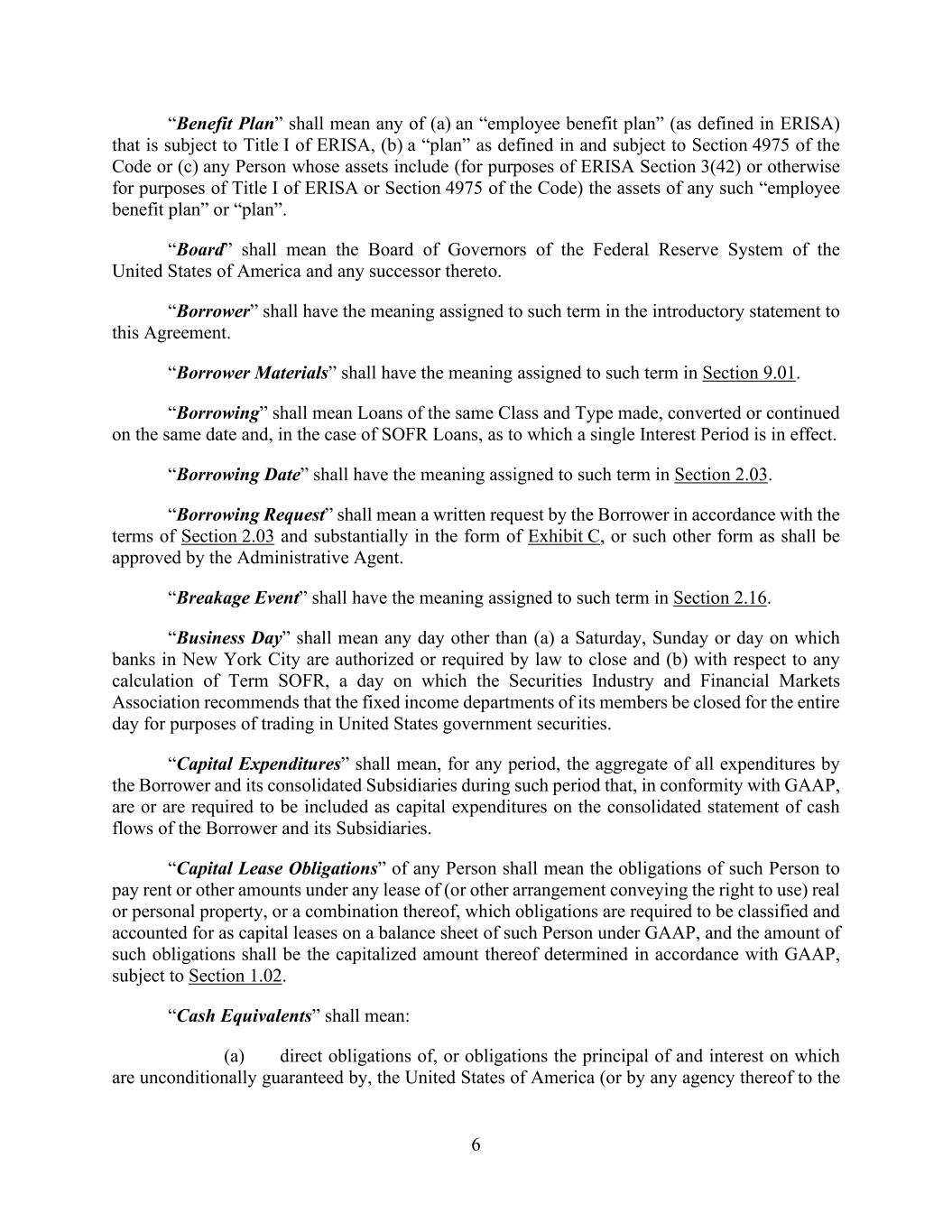6 “Benefit Plan” shall mean any of (a) an “employee benefit plan” (as defined in ERISA) that is subject to Title I of ERISA, (b) a “plan” as defined in and subject to Section 4975 of the Code or (c) any Person whose assets include (for purposes of ERISA Section 3(42) or otherwise for purposes of Title I of ERISA or Section 4975 of the Code) the assets of any such “employee benefit plan” or “plan”. “Board” shall mean the Board of Governors of the Federal Reserve System of the United States of America and any successor thereto. “Borrower” shall have the meaning assigned to such term in the introductory statement to this Agreement. “Borrower Materials” shall have the meaning assigned to such term in Section 9.01. “Borrowing” shall mean Loans of the same Class and Type made, converted or continued on the same date and, in the case of SOFR Loans, as to which a single Interest Period is in effect. “Borrowing Date” shall have the meaning assigned to such term in Section 2.03. “Borrowing Request” shall mean a written request by the Borrower in accordance with the terms of Section 2.03 and substantially in the form of Exhibit C, or such other form as shall be approved by the Administrative Agent. “Breakage Event” shall have the meaning assigned to such term in Section 2.16. “Business Day” shall mean any day other than (a) a Saturday, Sunday or day on which banks in New York City are authorized or required by law to close and (b) with respect to any calculation of Term SOFR, a day on which the Securities Industry and Financial Markets Association recommends that the fixed income departments of its members be closed for the entire day for purposes of trading in United States government securities. “Capital Expenditures” shall mean, for any period, the aggregate of all expenditures by the Borrower and its consolidated Subsidiaries during such period that, in conformity with GAAP, are or are required to be included as capital expenditures on the consolidated statement of cash flows of the Borrower and its Subsidiaries. “Capital Lease Obligations” of any Person shall mean the obligations of such Person to pay rent or other amounts under any lease of (or other arrangement conveying the right to use) real or personal property, or a combination thereof, which obligations are required to be classified and accounted for as capital leases on a balance sheet of such Person under GAAP, and the amount of such obligations shall be the capitalized amount thereof determined in accordance with GAAP, subject to Section 1.02. “Cash Equivalents” shall mean: (a) direct obligations of, or obligations the principal of and interest on which are unconditionally guaranteed by, the United States of America (or by any agency thereof to the