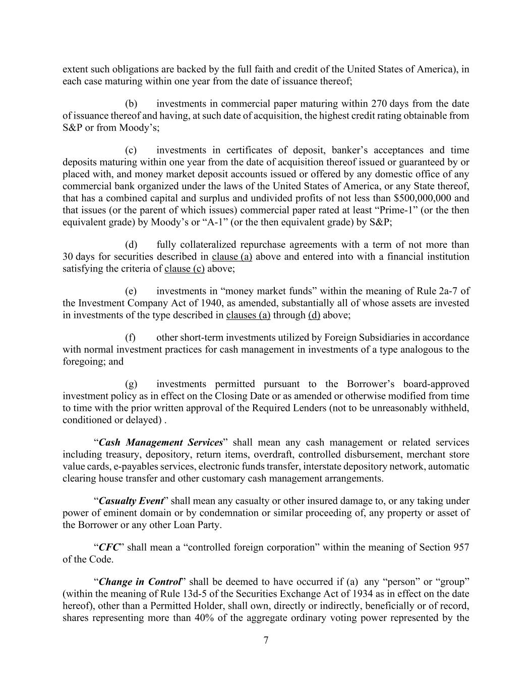 7 extent such obligations are backed by the full faith and credit of the United States of America), in each case maturing within one year from the date of issuance thereof; (b) investments in commercial paper maturing within 270 days from the date of issuance thereof and having, at such date of acquisition, the highest credit rating obtainable from S&P or from Moody’s; (c) investments in certificates of deposit, banker’s acceptances and time deposits maturing within one year from the date of acquisition thereof issued or guaranteed by or placed with, and money market deposit accounts issued or offered by any domestic office of any commercial bank organized under the laws of the United States of America, or any State thereof, that has a combined capital and surplus and undivided profits of not less than $500,000,000 and that issues (or the parent of which issues) commercial paper rated at least “Prime-1” (or the then equivalent grade) by Moody’s or “A-1” (or the then equivalent grade) by S&P; (d) fully collateralized repurchase agreements with a term of not more than 30 days for securities described in clause (a) above and entered into with a financial institution satisfying the criteria of clause (c) above; (e) investments in “money market funds” within the meaning of Rule 2a-7 of the Investment Company Act of 1940, as amended, substantially all of whose assets are invested in investments of the type described in clauses (a) through (d) above; (f) other short-term investments utilized by Foreign Subsidiaries in accordance with normal investment practices for cash management in investments of a type analogous to the foregoing; and (g) investments permitted pursuant to the Borrower’s board-approved investment policy as in effect on the Closing Date or as amended or otherwise modified from time to time with the prior written approval of the Required Lenders (not to be unreasonably withheld, conditioned or delayed) . “Cash Management Services” shall mean any cash management or related services including treasury, depository, return items, overdraft, controlled disbursement, merchant store value cards, e-payables services, electronic funds transfer, interstate depository network, automatic clearing house transfer and other customary cash management arrangements. “Casualty Event” shall mean any casualty or other insured damage to, or any taking under power of eminent domain or by condemnation or similar proceeding of, any property or asset of the Borrower or any other Loan Party. “CFC” shall mean a “controlled foreign corporation” within the meaning of Section 957 of the Code. “Change in Control” shall be deemed to have occurred if (a) any “person” or “group” (within the meaning of Rule 13d-5 of the Securities Exchange Act of 1934 as in effect on the date hereof), other than a Permitted Holder, shall own, directly or indirectly, beneficially or of record, shares representing more than 40% of the aggregate ordinary voting power represented by the