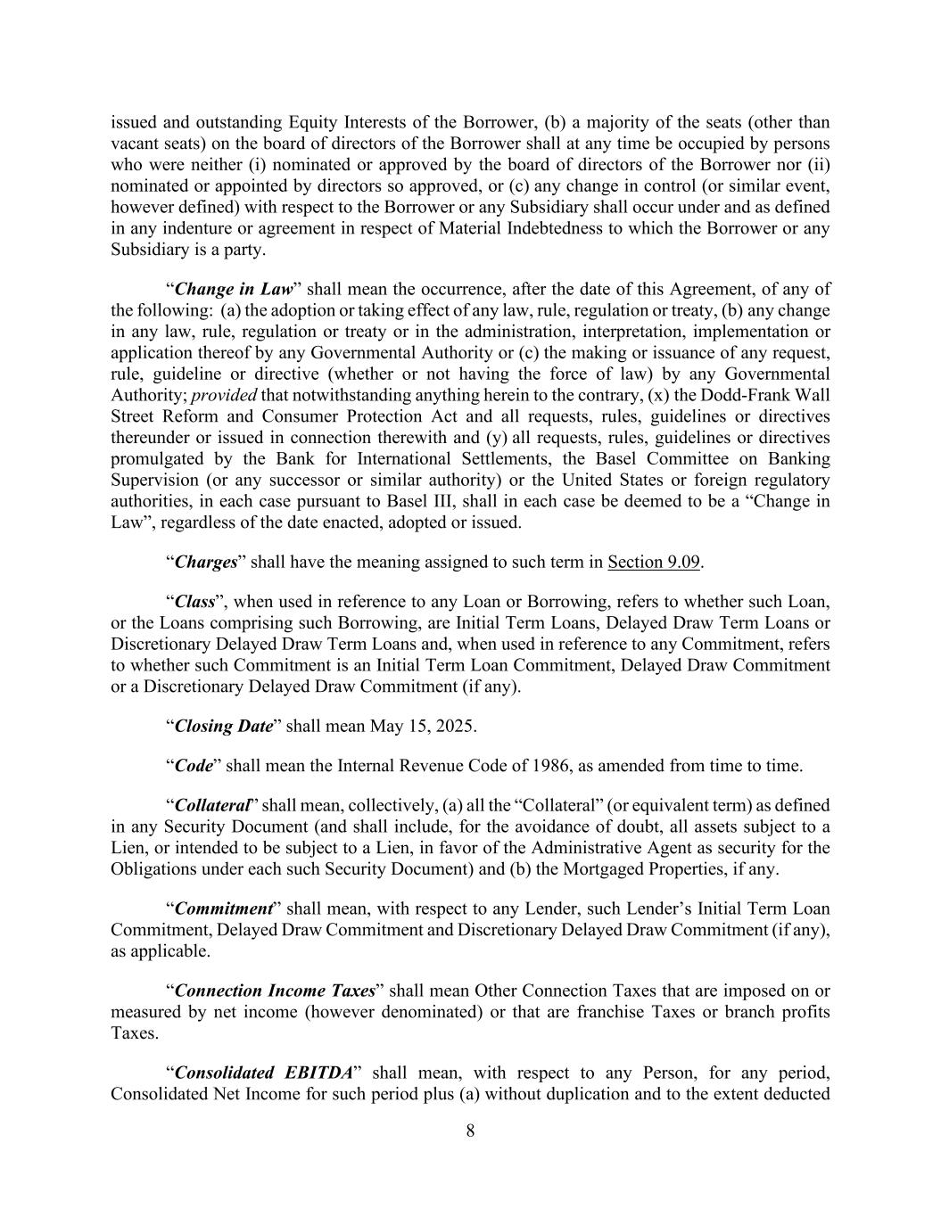 8 issued and outstanding Equity Interests of the Borrower, (b) a majority of the seats (other than vacant seats) on the board of directors of the Borrower shall at any time be occupied by persons who were neither (i) nominated or approved by the board of directors of the Borrower nor (ii) nominated or appointed by directors so approved, or (c) any change in control (or similar event, however defined) with respect to the Borrower or any Subsidiary shall occur under and as defined in any indenture or agreement in respect of Material Indebtedness to which the Borrower or any Subsidiary is a party. “Change in Law” shall mean the occurrence, after the date of this Agreement, of any of the following: (a) the adoption or taking effect of any law, rule, regulation or treaty, (b) any change in any law, rule, regulation or treaty or in the administration, interpretation, implementation or application thereof by any Governmental Authority or (c) the making or issuance of any request, rule, guideline or directive (whether or not having the force of law) by any Governmental Authority; provided that notwithstanding anything herein to the contrary, (x) the Dodd-Frank Wall Street Reform and Consumer Protection Act and all requests, rules, guidelines or directives thereunder or issued in connection therewith and (y) all requests, rules, guidelines or directives promulgated by the Bank for International Settlements, the Basel Committee on Banking Supervision (or any successor or similar authority) or the United States or foreign regulatory authorities, in each case pursuant to Basel III, shall in each case be deemed to be a “Change in Law”, regardless of the date enacted, adopted or issued. “Charges” shall have the meaning assigned to such term in Section 9.09. “Class”, when used in reference to any Loan or Borrowing, refers to whether such Loan, or the Loans comprising such Borrowing, are Initial Term Loans, Delayed Draw Term Loans or Discretionary Delayed Draw Term Loans and, when used in reference to any Commitment, refers to whether such Commitment is an Initial Term Loan Commitment, Delayed Draw Commitment or a Discretionary Delayed Draw Commitment (if any). “Closing Date” shall mean May 15, 2025. “Code” shall mean the Internal Revenue Code of 1986, as amended from time to time. “Collateral” shall mean, collectively, (a) all the “Collateral” (or equivalent term) as defined in any Security Document (and shall include, for the avoidance of doubt, all assets subject to a Lien, or intended to be subject to a Lien, in favor of the Administrative Agent as security for the Obligations under each such Security Document) and (b) the Mortgaged Properties, if any. “Commitment” shall mean, with respect to any Lender, such Lender’s Initial Term Loan Commitment, Delayed Draw Commitment and Discretionary Delayed Draw Commitment (if any), as applicable. “Connection Income Taxes” shall mean Other Connection Taxes that are imposed on or measured by net income (however denominated) or that are franchise Taxes or branch profits Taxes. “Consolidated EBITDA” shall mean, with respect to any Person, for any period, Consolidated Net Income for such period plus (a) without duplication and to the extent deducted