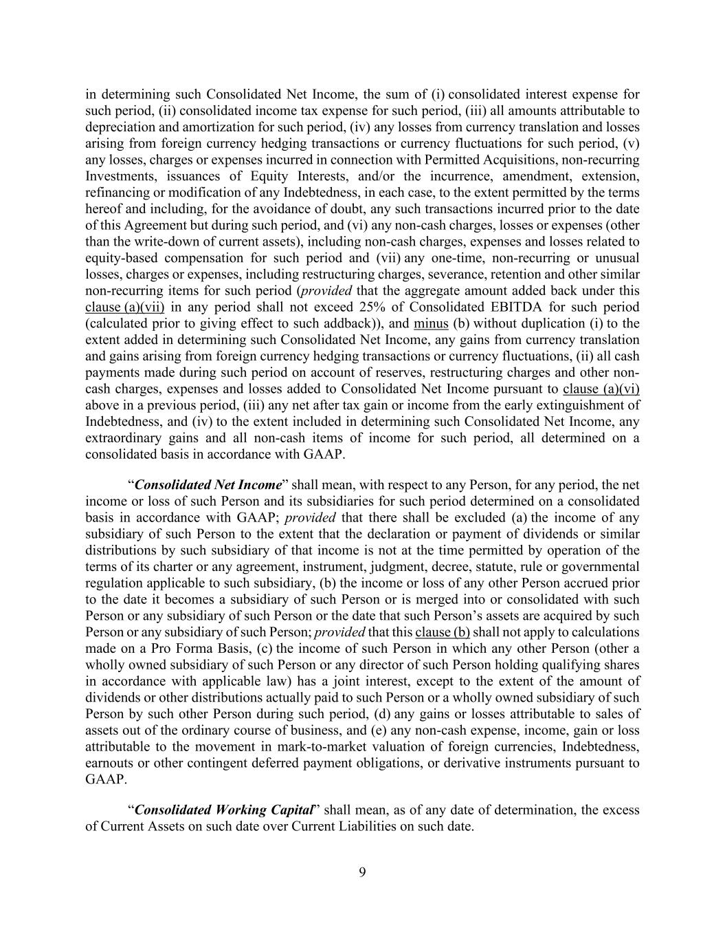 9 in determining such Consolidated Net Income, the sum of (i) consolidated interest expense for such period, (ii) consolidated income tax expense for such period, (iii) all amounts attributable to depreciation and amortization for such period, (iv) any losses from currency translation and losses arising from foreign currency hedging transactions or currency fluctuations for such period, (v) any losses, charges or expenses incurred in connection with Permitted Acquisitions, non-recurring Investments, issuances of Equity Interests, and/or the incurrence, amendment, extension, refinancing or modification of any Indebtedness, in each case, to the extent permitted by the terms hereof and including, for the avoidance of doubt, any such transactions incurred prior to the date of this Agreement but during such period, and (vi) any non-cash charges, losses or expenses (other than the write-down of current assets), including non-cash charges, expenses and losses related to equity-based compensation for such period and (vii) any one-time, non-recurring or unusual losses, charges or expenses, including restructuring charges, severance, retention and other similar non-recurring items for such period (provided that the aggregate amount added back under this clause (a)(vii) in any period shall not exceed 25% of Consolidated EBITDA for such period (calculated prior to giving effect to such addback)), and minus (b) without duplication (i) to the extent added in determining such Consolidated Net Income, any gains from currency translation and gains arising from foreign currency hedging transactions or currency fluctuations, (ii) all cash payments made during such period on account of reserves, restructuring charges and other non- cash charges, expenses and losses added to Consolidated Net Income pursuant to clause (a)(vi) above in a previous period, (iii) any net after tax gain or income from the early extinguishment of Indebtedness, and (iv) to the extent included in determining such Consolidated Net Income, any extraordinary gains and all non-cash items of income for such period, all determined on a consolidated basis in accordance with GAAP. “Consolidated Net Income” shall mean, with respect to any Person, for any period, the net income or loss of such Person and its subsidiaries for such period determined on a consolidated basis in accordance with GAAP; provided that there shall be excluded (a) the income of any subsidiary of such Person to the extent that the declaration or payment of dividends or similar distributions by such subsidiary of that income is not at the time permitted by operation of the terms of its charter or any agreement, instrument, judgment, decree, statute, rule or governmental regulation applicable to such subsidiary, (b) the income or loss of any other Person accrued prior to the date it becomes a subsidiary of such Person or is merged into or consolidated with such Person or any subsidiary of such Person or the date that such Person’s assets are acquired by such Person or any subsidiary of such Person; provided that this clause (b) shall not apply to calculations made on a Pro Forma Basis, (c) the income of such Person in which any other Person (other a wholly owned subsidiary of such Person or any director of such Person holding qualifying shares in accordance with applicable law) has a joint interest, except to the extent of the amount of dividends or other distributions actually paid to such Person or a wholly owned subsidiary of such Person by such other Person during such period, (d) any gains or losses attributable to sales of assets out of the ordinary course of business, and (e) any non-cash expense, income, gain or loss attributable to the movement in mark-to-market valuation of foreign currencies, Indebtedness, earnouts or other contingent deferred payment obligations, or derivative instruments pursuant to GAAP. “Consolidated Working Capital” shall mean, as of any date of determination, the excess of Current Assets on such date over Current Liabilities on such date.