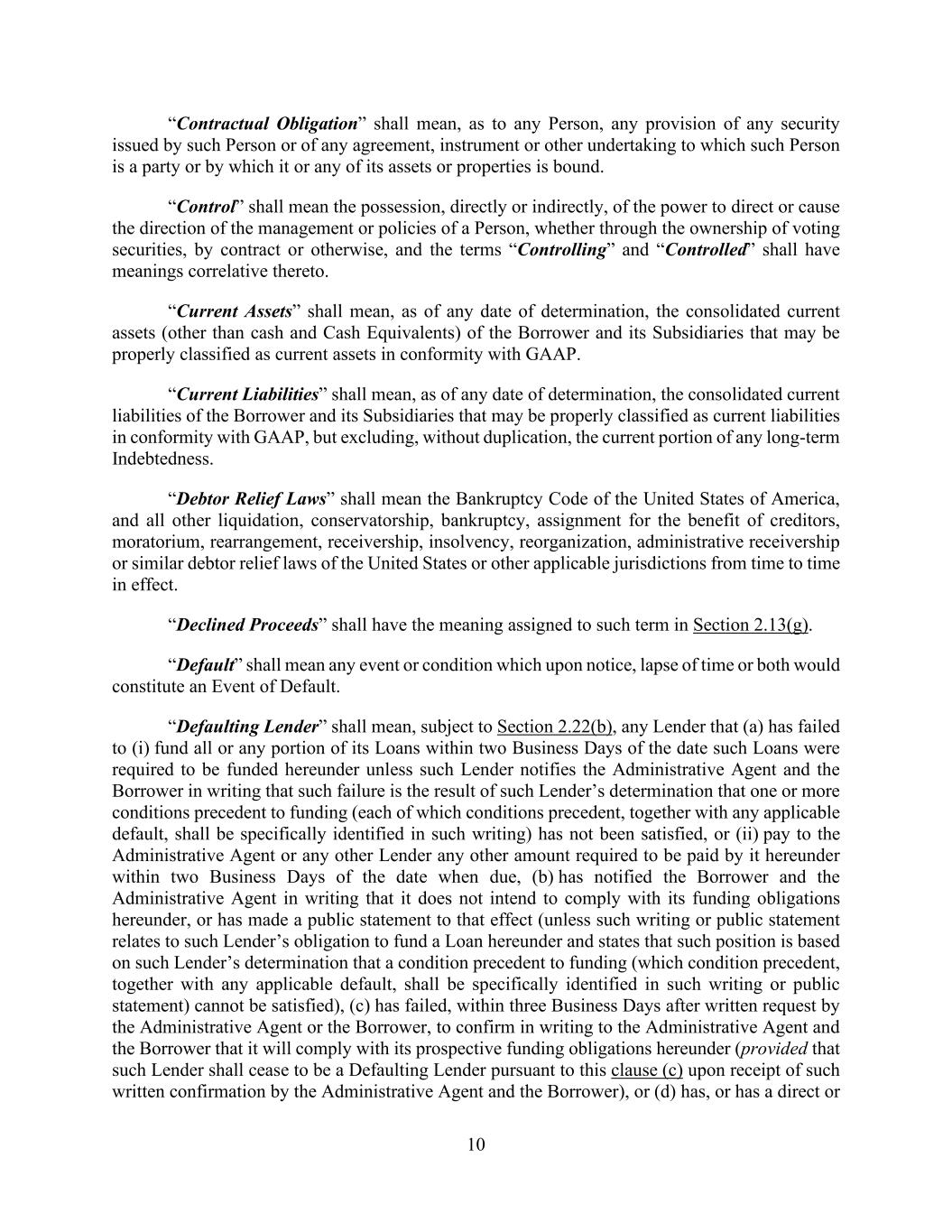 10 “Contractual Obligation” shall mean, as to any Person, any provision of any security issued by such Person or of any agreement, instrument or other undertaking to which such Person is a party or by which it or any of its assets or properties is bound. “Control” shall mean the possession, directly or indirectly, of the power to direct or cause the direction of the management or policies of a Person, whether through the ownership of voting securities, by contract or otherwise, and the terms “Controlling” and “Controlled” shall have meanings correlative thereto. “Current Assets” shall mean, as of any date of determination, the consolidated current assets (other than cash and Cash Equivalents) of the Borrower and its Subsidiaries that may be properly classified as current assets in conformity with GAAP. “Current Liabilities” shall mean, as of any date of determination, the consolidated current liabilities of the Borrower and its Subsidiaries that may be properly classified as current liabilities in conformity with GAAP, but excluding, without duplication, the current portion of any long-term Indebtedness. “Debtor Relief Laws” shall mean the Bankruptcy Code of the United States of America, and all other liquidation, conservatorship, bankruptcy, assignment for the benefit of creditors, moratorium, rearrangement, receivership, insolvency, reorganization, administrative receivership or similar debtor relief laws of the United States or other applicable jurisdictions from time to time in effect. “Declined Proceeds” shall have the meaning assigned to such term in Section 2.13(g). “Default” shall mean any event or condition which upon notice, lapse of time or both would constitute an Event of Default. “Defaulting Lender” shall mean, subject to Section 2.22(b), any Lender that (a) has failed to (i) fund all or any portion of its Loans within two Business Days of the date such Loans were required to be funded hereunder unless such Lender notifies the Administrative Agent and the Borrower in writing that such failure is the result of such Lender’s determination that one or more conditions precedent to funding (each of which conditions precedent, together with any applicable default, shall be specifically identified in such writing) has not been satisfied, or (ii) pay to the Administrative Agent or any other Lender any other amount required to be paid by it hereunder within two Business Days of the date when due, (b) has notified the Borrower and the Administrative Agent in writing that it does not intend to comply with its funding obligations hereunder, or has made a public statement to that effect (unless such writing or public statement relates to such Lender’s obligation to fund a Loan hereunder and states that such position is based on such Lender’s determination that a condition precedent to funding (which condition precedent, together with any applicable default, shall be specifically identified in such writing or public statement) cannot be satisfied), (c) has failed, within three Business Days after written request by the Administrative Agent or the Borrower, to confirm in writing to the Administrative Agent and the Borrower that it will comply with its prospective funding obligations hereunder (provided that such Lender shall cease to be a Defaulting Lender pursuant to this clause (c) upon receipt of such written confirmation by the Administrative Agent and the Borrower), or (d) has, or has a direct or