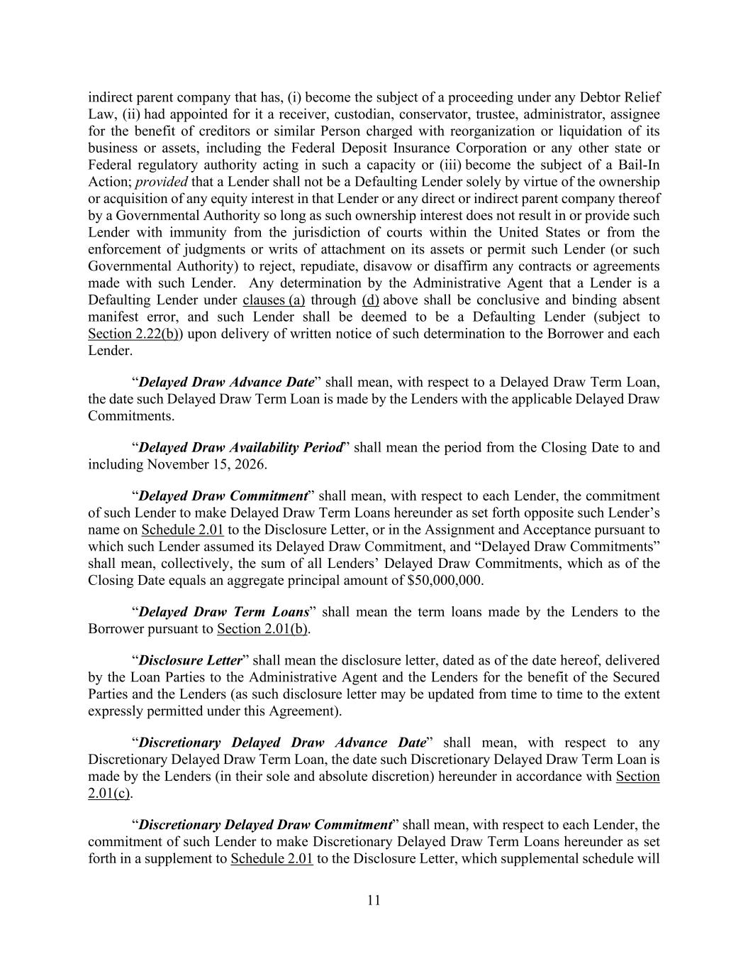 11 indirect parent company that has, (i) become the subject of a proceeding under any Debtor Relief Law, (ii) had appointed for it a receiver, custodian, conservator, trustee, administrator, assignee for the benefit of creditors or similar Person charged with reorganization or liquidation of its business or assets, including the Federal Deposit Insurance Corporation or any other state or Federal regulatory authority acting in such a capacity or (iii) become the subject of a Bail-In Action; provided that a Lender shall not be a Defaulting Lender solely by virtue of the ownership or acquisition of any equity interest in that Lender or any direct or indirect parent company thereof by a Governmental Authority so long as such ownership interest does not result in or provide such Lender with immunity from the jurisdiction of courts within the United States or from the enforcement of judgments or writs of attachment on its assets or permit such Lender (or such Governmental Authority) to reject, repudiate, disavow or disaffirm any contracts or agreements made with such Lender. Any determination by the Administrative Agent that a Lender is a Defaulting Lender under clauses (a) through (d) above shall be conclusive and binding absent manifest error, and such Lender shall be deemed to be a Defaulting Lender (subject to Section 2.22(b)) upon delivery of written notice of such determination to the Borrower and each Lender. “Delayed Draw Advance Date” shall mean, with respect to a Delayed Draw Term Loan, the date such Delayed Draw Term Loan is made by the Lenders with the applicable Delayed Draw Commitments. “Delayed Draw Availability Period” shall mean the period from the Closing Date to and including November 15, 2026. “Delayed Draw Commitment” shall mean, with respect to each Lender, the commitment of such Lender to make Delayed Draw Term Loans hereunder as set forth opposite such Lender’s name on Schedule 2.01 to the Disclosure Letter, or in the Assignment and Acceptance pursuant to which such Lender assumed its Delayed Draw Commitment, and “Delayed Draw Commitments” shall mean, collectively, the sum of all Lenders’ Delayed Draw Commitments, which as of the Closing Date equals an aggregate principal amount of $50,000,000. “Delayed Draw Term Loans” shall mean the term loans made by the Lenders to the Borrower pursuant to Section 2.01(b). “Disclosure Letter” shall mean the disclosure letter, dated as of the date hereof, delivered by the Loan Parties to the Administrative Agent and the Lenders for the benefit of the Secured Parties and the Lenders (as such disclosure letter may be updated from time to time to the extent expressly permitted under this Agreement). “Discretionary Delayed Draw Advance Date” shall mean, with respect to any Discretionary Delayed Draw Term Loan, the date such Discretionary Delayed Draw Term Loan is made by the Lenders (in their sole and absolute discretion) hereunder in accordance with Section 2.01(c). “Discretionary Delayed Draw Commitment” shall mean, with respect to each Lender, the commitment of such Lender to make Discretionary Delayed Draw Term Loans hereunder as set forth in a supplement to Schedule 2.01 to the Disclosure Letter, which supplemental schedule will