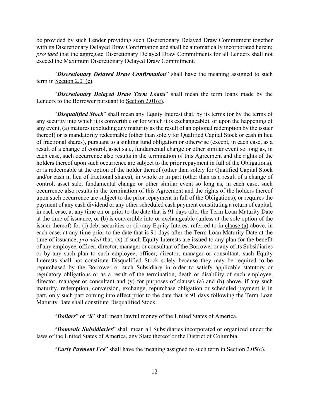 12 be provided by such Lender providing such Discretionary Delayed Draw Commitment together with its Discretionary Delayed Draw Confirmation and shall be automatically incorporated herein; provided that the aggregate Discretionary Delayed Draw Commitments for all Lenders shall not exceed the Maximum Discretionary Delayed Draw Commitment. “Discretionary Delayed Draw Confirmation” shall have the meaning assigned to such term in Section 2.01(c). “Discretionary Delayed Draw Term Loans” shall mean the term loans made by the Lenders to the Borrower pursuant to Section 2.01(c). “Disqualified Stock” shall mean any Equity Interest that, by its terms (or by the terms of any security into which it is convertible or for which it is exchangeable), or upon the happening of any event, (a) matures (excluding any maturity as the result of an optional redemption by the issuer thereof) or is mandatorily redeemable (other than solely for Qualified Capital Stock or cash in lieu of fractional shares), pursuant to a sinking fund obligation or otherwise (except, in each case, as a result of a change of control, asset sale, fundamental change or other similar event so long as, in each case, such occurrence also results in the termination of this Agreement and the rights of the holders thereof upon such occurrence are subject to the prior repayment in full of the Obligations), or is redeemable at the option of the holder thereof (other than solely for Qualified Capital Stock and/or cash in lieu of fractional shares), in whole or in part (other than as a result of a change of control, asset sale, fundamental change or other similar event so long as, in each case, such occurrence also results in the termination of this Agreement and the rights of the holders thereof upon such occurrence are subject to the prior repayment in full of the Obligations), or requires the payment of any cash dividend or any other scheduled cash payment constituting a return of capital, in each case, at any time on or prior to the date that is 91 days after the Term Loan Maturity Date at the time of issuance, or (b) is convertible into or exchangeable (unless at the sole option of the issuer thereof) for (i) debt securities or (ii) any Equity Interest referred to in clause (a) above, in each case, at any time prior to the date that is 91 days after the Term Loan Maturity Date at the time of issuance; provided that, (x) if such Equity Interests are issued to any plan for the benefit of any employee, officer, director, manager or consultant of the Borrower or any of its Subsidiaries or by any such plan to such employee, officer, director, manager or consultant, such Equity Interests shall not constitute Disqualified Stock solely because they may be required to be repurchased by the Borrower or such Subsidiary in order to satisfy applicable statutory or regulatory obligations or as a result of the termination, death or disability of such employee, director, manager or consultant and (y) for purposes of clauses (a) and (b) above, if any such maturity, redemption, conversion, exchange, repurchase obligation or scheduled payment is in part, only such part coming into effect prior to the date that is 91 days following the Term Loan Maturity Date shall constitute Disqualified Stock. “Dollars” or “$” shall mean lawful money of the United States of America. “Domestic Subsidiaries” shall mean all Subsidiaries incorporated or organized under the laws of the United States of America, any State thereof or the District of Columbia. “Early Payment Fee” shall have the meaning assigned to such term in Section 2.05(c).
