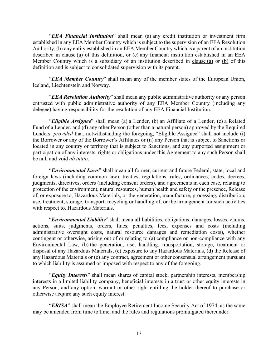 13 “EEA Financial Institution” shall mean (a) any credit institution or investment firm established in any EEA Member Country which is subject to the supervision of an EEA Resolution Authority, (b) any entity established in an EEA Member Country which is a parent of an institution described in clause (a) of this definition, or (c) any financial institution established in an EEA Member Country which is a subsidiary of an institution described in clause (a) or (b) of this definition and is subject to consolidated supervision with its parent. “EEA Member Country” shall mean any of the member states of the European Union, Iceland, Liechtenstein and Norway. “EEA Resolution Authority” shall mean any public administrative authority or any person entrusted with public administrative authority of any EEA Member Country (including any delegee) having responsibility for the resolution of any EEA Financial Institution. “Eligible Assignee” shall mean (a) a Lender, (b) an Affiliate of a Lender, (c) a Related Fund of a Lender, and (d) any other Person (other than a natural person) approved by the Required Lenders; provided that, notwithstanding the foregoing, “Eligible Assignee” shall not include (i) the Borrower or any of the Borrower’s Affiliates or (ii) any Person that is subject to Sanctions or located in any country or territory that is subject to Sanctions, and any purported assignment or participation of any interests, rights or obligations under this Agreement to any such Person shall be null and void ab initio. “Environmental Laws” shall mean all former, current and future Federal, state, local and foreign laws (including common law), treaties, regulations, rules, ordinances, codes, decrees, judgments, directives, orders (including consent orders), and agreements in each case, relating to protection of the environment, natural resources, human health and safety or the presence, Release of, or exposure to, Hazardous Materials, or the generation, manufacture, processing, distribution, use, treatment, storage, transport, recycling or handling of, or the arrangement for such activities with respect to, Hazardous Materials. “Environmental Liability” shall mean all liabilities, obligations, damages, losses, claims, actions, suits, judgments, orders, fines, penalties, fees, expenses and costs (including administrative oversight costs, natural resource damages and remediation costs), whether contingent or otherwise, arising out of or relating to (a) compliance or non-compliance with any Environmental Law, (b) the generation, use, handling, transportation, storage, treatment or disposal of any Hazardous Materials, (c) exposure to any Hazardous Materials, (d) the Release of any Hazardous Materials or (e) any contract, agreement or other consensual arrangement pursuant to which liability is assumed or imposed with respect to any of the foregoing. “Equity Interests” shall mean shares of capital stock, partnership interests, membership interests in a limited liability company, beneficial interests in a trust or other equity interests in any Person, and any option, warrant or other right entitling the holder thereof to purchase or otherwise acquire any such equity interest. “ERISA” shall mean the Employee Retirement Income Security Act of 1974, as the same may be amended from time to time, and the rules and regulations promulgated thereunder.