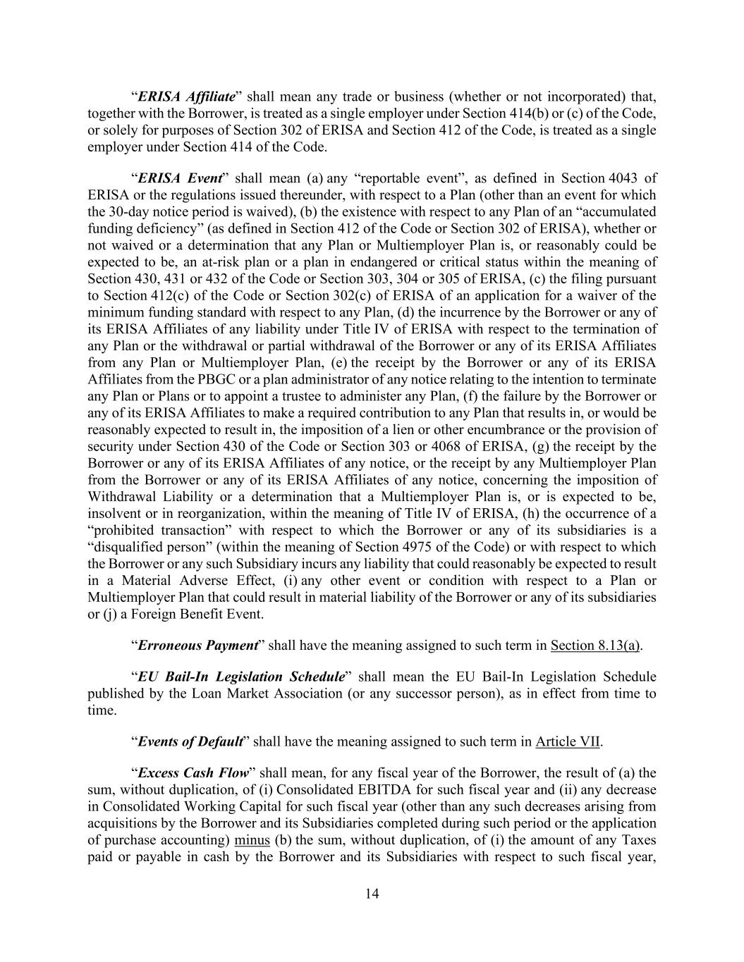 14 “ERISA Affiliate” shall mean any trade or business (whether or not incorporated) that, together with the Borrower, is treated as a single employer under Section 414(b) or (c) of the Code, or solely for purposes of Section 302 of ERISA and Section 412 of the Code, is treated as a single employer under Section 414 of the Code. “ERISA Event” shall mean (a) any “reportable event”, as defined in Section 4043 of ERISA or the regulations issued thereunder, with respect to a Plan (other than an event for which the 30-day notice period is waived), (b) the existence with respect to any Plan of an “accumulated funding deficiency” (as defined in Section 412 of the Code or Section 302 of ERISA), whether or not waived or a determination that any Plan or Multiemployer Plan is, or reasonably could be expected to be, an at-risk plan or a plan in endangered or critical status within the meaning of Section 430, 431 or 432 of the Code or Section 303, 304 or 305 of ERISA, (c) the filing pursuant to Section 412(c) of the Code or Section 302(c) of ERISA of an application for a waiver of the minimum funding standard with respect to any Plan, (d) the incurrence by the Borrower or any of its ERISA Affiliates of any liability under Title IV of ERISA with respect to the termination of any Plan or the withdrawal or partial withdrawal of the Borrower or any of its ERISA Affiliates from any Plan or Multiemployer Plan, (e) the receipt by the Borrower or any of its ERISA Affiliates from the PBGC or a plan administrator of any notice relating to the intention to terminate any Plan or Plans or to appoint a trustee to administer any Plan, (f) the failure by the Borrower or any of its ERISA Affiliates to make a required contribution to any Plan that results in, or would be reasonably expected to result in, the imposition of a lien or other encumbrance or the provision of security under Section 430 of the Code or Section 303 or 4068 of ERISA, (g) the receipt by the Borrower or any of its ERISA Affiliates of any notice, or the receipt by any Multiemployer Plan from the Borrower or any of its ERISA Affiliates of any notice, concerning the imposition of Withdrawal Liability or a determination that a Multiemployer Plan is, or is expected to be, insolvent or in reorganization, within the meaning of Title IV of ERISA, (h) the occurrence of a “prohibited transaction” with respect to which the Borrower or any of its subsidiaries is a “disqualified person” (within the meaning of Section 4975 of the Code) or with respect to which the Borrower or any such Subsidiary incurs any liability that could reasonably be expected to result in a Material Adverse Effect, (i) any other event or condition with respect to a Plan or Multiemployer Plan that could result in material liability of the Borrower or any of its subsidiaries or (j) a Foreign Benefit Event. “Erroneous Payment” shall have the meaning assigned to such term in Section 8.13(a). “EU Bail-In Legislation Schedule” shall mean the EU Bail-In Legislation Schedule published by the Loan Market Association (or any successor person), as in effect from time to time. “Events of Default” shall have the meaning assigned to such term in Article VII. “Excess Cash Flow” shall mean, for any fiscal year of the Borrower, the result of (a) the sum, without duplication, of (i) Consolidated EBITDA for such fiscal year and (ii) any decrease in Consolidated Working Capital for such fiscal year (other than any such decreases arising from acquisitions by the Borrower and its Subsidiaries completed during such period or the application of purchase accounting) minus (b) the sum, without duplication, of (i) the amount of any Taxes paid or payable in cash by the Borrower and its Subsidiaries with respect to such fiscal year,