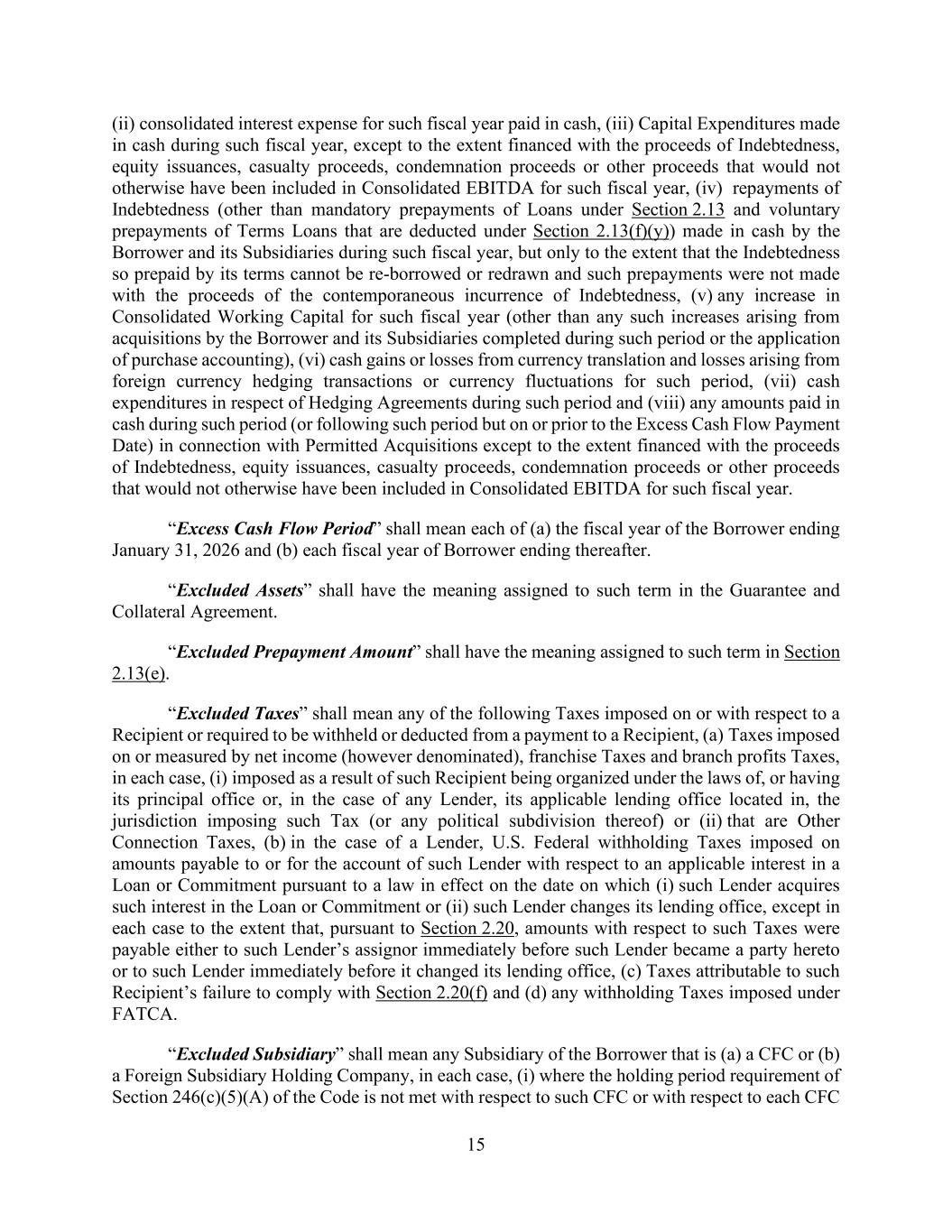 15 (ii) consolidated interest expense for such fiscal year paid in cash, (iii) Capital Expenditures made in cash during such fiscal year, except to the extent financed with the proceeds of Indebtedness, equity issuances, casualty proceeds, condemnation proceeds or other proceeds that would not otherwise have been included in Consolidated EBITDA for such fiscal year, (iv) repayments of Indebtedness (other than mandatory prepayments of Loans under Section 2.13 and voluntary prepayments of Terms Loans that are deducted under Section 2.13(f)(y)) made in cash by the Borrower and its Subsidiaries during such fiscal year, but only to the extent that the Indebtedness so prepaid by its terms cannot be re-borrowed or redrawn and such prepayments were not made with the proceeds of the contemporaneous incurrence of Indebtedness, (v) any increase in Consolidated Working Capital for such fiscal year (other than any such increases arising from acquisitions by the Borrower and its Subsidiaries completed during such period or the application of purchase accounting), (vi) cash gains or losses from currency translation and losses arising from foreign currency hedging transactions or currency fluctuations for such period, (vii) cash expenditures in respect of Hedging Agreements during such period and (viii) any amounts paid in cash during such period (or following such period but on or prior to the Excess Cash Flow Payment Date) in connection with Permitted Acquisitions except to the extent financed with the proceeds of Indebtedness, equity issuances, casualty proceeds, condemnation proceeds or other proceeds that would not otherwise have been included in Consolidated EBITDA for such fiscal year. “Excess Cash Flow Period” shall mean each of (a) the fiscal year of the Borrower ending January 31, 2026 and (b) each fiscal year of Borrower ending thereafter. “Excluded Assets” shall have the meaning assigned to such term in the Guarantee and Collateral Agreement. “Excluded Prepayment Amount” shall have the meaning assigned to such term in Section 2.13(e). “Excluded Taxes” shall mean any of the following Taxes imposed on or with respect to a Recipient or required to be withheld or deducted from a payment to a Recipient, (a) Taxes imposed on or measured by net income (however denominated), franchise Taxes and branch profits Taxes, in each case, (i) imposed as a result of such Recipient being organized under the laws of, or having its principal office or, in the case of any Lender, its applicable lending office located in, the jurisdiction imposing such Tax (or any political subdivision thereof) or (ii) that are Other Connection Taxes, (b) in the case of a Lender, U.S. Federal withholding Taxes imposed on amounts payable to or for the account of such Lender with respect to an applicable interest in a Loan or Commitment pursuant to a law in effect on the date on which (i) such Lender acquires such interest in the Loan or Commitment or (ii) such Lender changes its lending office, except in each case to the extent that, pursuant to Section 2.20, amounts with respect to such Taxes were payable either to such Lender’s assignor immediately before such Lender became a party hereto or to such Lender immediately before it changed its lending office, (c) Taxes attributable to such Recipient’s failure to comply with Section 2.20(f) and (d) any withholding Taxes imposed under FATCA. “Excluded Subsidiary” shall mean any Subsidiary of the Borrower that is (a) a CFC or (b) a Foreign Subsidiary Holding Company, in each case, (i) where the holding period requirement of Section 246(c)(5)(A) of the Code is not met with respect to such CFC or with respect to each CFC