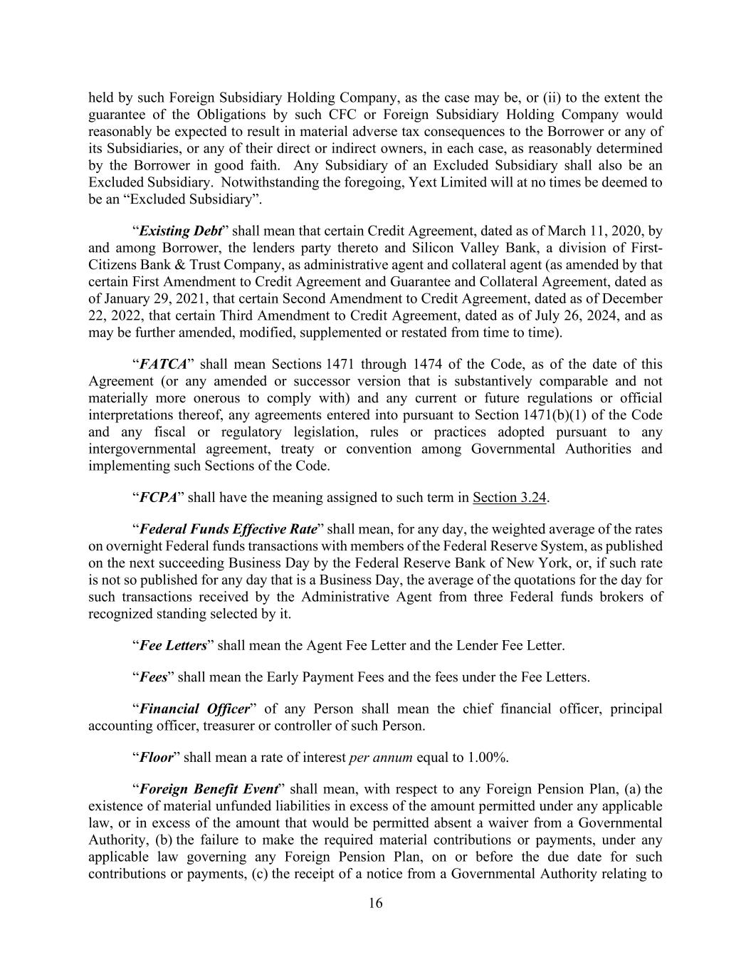 16 held by such Foreign Subsidiary Holding Company, as the case may be, or (ii) to the extent the guarantee of the Obligations by such CFC or Foreign Subsidiary Holding Company would reasonably be expected to result in material adverse tax consequences to the Borrower or any of its Subsidiaries, or any of their direct or indirect owners, in each case, as reasonably determined by the Borrower in good faith. Any Subsidiary of an Excluded Subsidiary shall also be an Excluded Subsidiary. Notwithstanding the foregoing, Yext Limited will at no times be deemed to be an “Excluded Subsidiary”. “Existing Debt” shall mean that certain Credit Agreement, dated as of March 11, 2020, by and among Borrower, the lenders party thereto and Silicon Valley Bank, a division of First- Citizens Bank & Trust Company, as administrative agent and collateral agent (as amended by that certain First Amendment to Credit Agreement and Guarantee and Collateral Agreement, dated as of January 29, 2021, that certain Second Amendment to Credit Agreement, dated as of December 22, 2022, that certain Third Amendment to Credit Agreement, dated as of July 26, 2024, and as may be further amended, modified, supplemented or restated from time to time). “FATCA” shall mean Sections 1471 through 1474 of the Code, as of the date of this Agreement (or any amended or successor version that is substantively comparable and not materially more onerous to comply with) and any current or future regulations or official interpretations thereof, any agreements entered into pursuant to Section 1471(b)(1) of the Code and any fiscal or regulatory legislation, rules or practices adopted pursuant to any intergovernmental agreement, treaty or convention among Governmental Authorities and implementing such Sections of the Code. “FCPA” shall have the meaning assigned to such term in Section 3.24. “Federal Funds Effective Rate” shall mean, for any day, the weighted average of the rates on overnight Federal funds transactions with members of the Federal Reserve System, as published on the next succeeding Business Day by the Federal Reserve Bank of New York, or, if such rate is not so published for any day that is a Business Day, the average of the quotations for the day for such transactions received by the Administrative Agent from three Federal funds brokers of recognized standing selected by it. “Fee Letters” shall mean the Agent Fee Letter and the Lender Fee Letter. “Fees” shall mean the Early Payment Fees and the fees under the Fee Letters. “Financial Officer” of any Person shall mean the chief financial officer, principal accounting officer, treasurer or controller of such Person. “Floor” shall mean a rate of interest per annum equal to 1.00%. “Foreign Benefit Event” shall mean, with respect to any Foreign Pension Plan, (a) the existence of material unfunded liabilities in excess of the amount permitted under any applicable law, or in excess of the amount that would be permitted absent a waiver from a Governmental Authority, (b) the failure to make the required material contributions or payments, under any applicable law governing any Foreign Pension Plan, on or before the due date for such contributions or payments, (c) the receipt of a notice from a Governmental Authority relating to