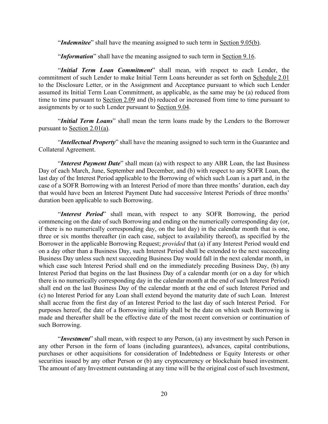 20 “Indemnitee” shall have the meaning assigned to such term in Section 9.05(b). “Information” shall have the meaning assigned to such term in Section 9.16. “Initial Term Loan Commitment” shall mean, with respect to each Lender, the commitment of such Lender to make Initial Term Loans hereunder as set forth on Schedule 2.01 to the Disclosure Letter, or in the Assignment and Acceptance pursuant to which such Lender assumed its Initial Term Loan Commitment, as applicable, as the same may be (a) reduced from time to time pursuant to Section 2.09 and (b) reduced or increased from time to time pursuant to assignments by or to such Lender pursuant to Section 9.04. “Initial Term Loans” shall mean the term loans made by the Lenders to the Borrower pursuant to Section 2.01(a). “Intellectual Property” shall have the meaning assigned to such term in the Guarantee and Collateral Agreement. “Interest Payment Date” shall mean (a) with respect to any ABR Loan, the last Business Day of each March, June, September and December, and (b) with respect to any SOFR Loan, the last day of the Interest Period applicable to the Borrowing of which such Loan is a part and, in the case of a SOFR Borrowing with an Interest Period of more than three months’ duration, each day that would have been an Interest Payment Date had successive Interest Periods of three months’ duration been applicable to such Borrowing. “Interest Period” shall mean, with respect to any SOFR Borrowing, the period commencing on the date of such Borrowing and ending on the numerically corresponding day (or, if there is no numerically corresponding day, on the last day) in the calendar month that is one, three or six months thereafter (in each case, subject to availability thereof), as specified by the Borrower in the applicable Borrowing Request; provided that (a) if any Interest Period would end on a day other than a Business Day, such Interest Period shall be extended to the next succeeding Business Day unless such next succeeding Business Day would fall in the next calendar month, in which case such Interest Period shall end on the immediately preceding Business Day, (b) any Interest Period that begins on the last Business Day of a calendar month (or on a day for which there is no numerically corresponding day in the calendar month at the end of such Interest Period) shall end on the last Business Day of the calendar month at the end of such Interest Period and (c) no Interest Period for any Loan shall extend beyond the maturity date of such Loan. Interest shall accrue from the first day of an Interest Period to the last day of such Interest Period. For purposes hereof, the date of a Borrowing initially shall be the date on which such Borrowing is made and thereafter shall be the effective date of the most recent conversion or continuation of such Borrowing. “Investment” shall mean, with respect to any Person, (a) any investment by such Person in any other Person in the form of loans (including guarantees), advances, capital contributions, purchases or other acquisitions for consideration of Indebtedness or Equity Interests or other securities issued by any other Person or (b) any cryptocurrency or blockchain based investment. The amount of any Investment outstanding at any time will be the original cost of such Investment,