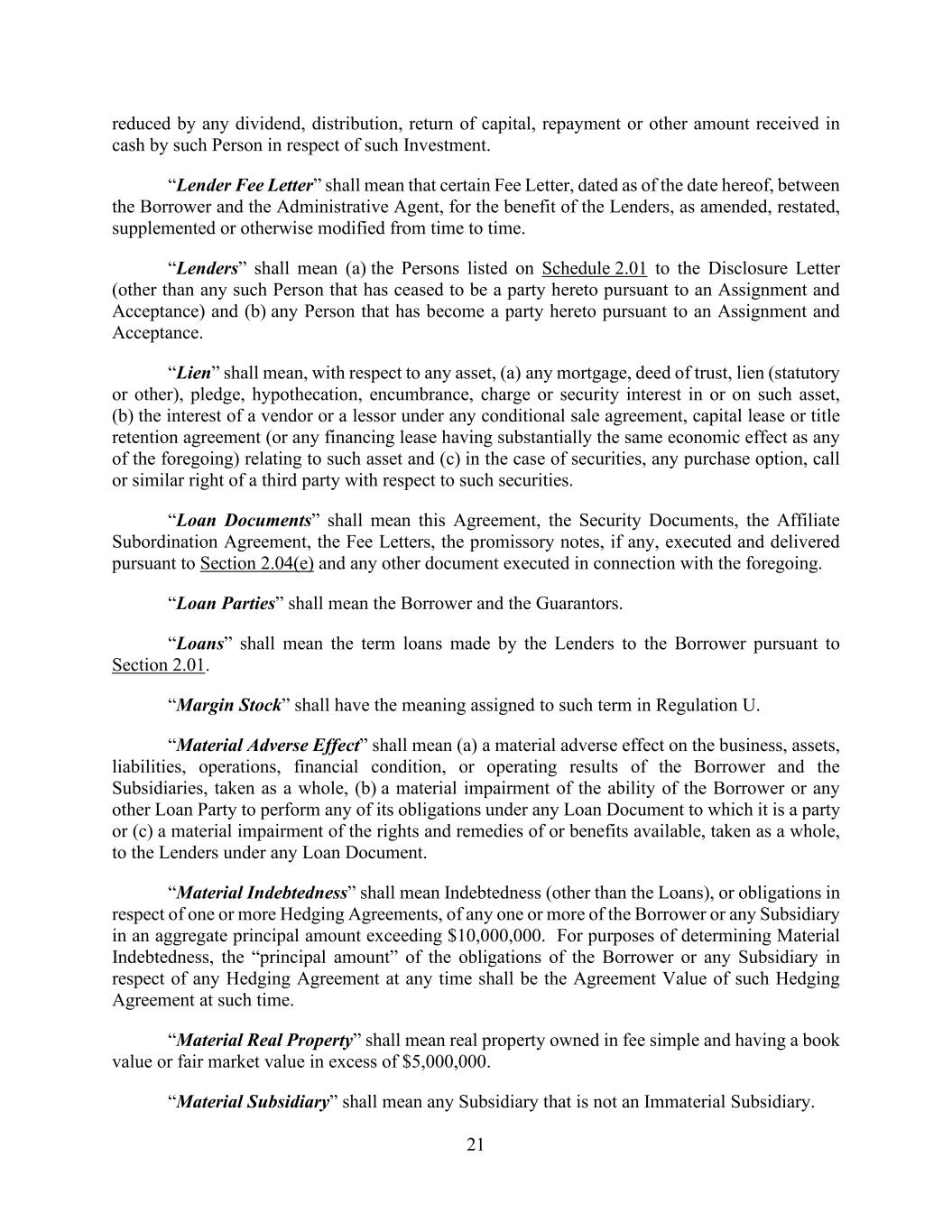 21 reduced by any dividend, distribution, return of capital, repayment or other amount received in cash by such Person in respect of such Investment. “Lender Fee Letter” shall mean that certain Fee Letter, dated as of the date hereof, between the Borrower and the Administrative Agent, for the benefit of the Lenders, as amended, restated, supplemented or otherwise modified from time to time. “Lenders” shall mean (a) the Persons listed on Schedule 2.01 to the Disclosure Letter (other than any such Person that has ceased to be a party hereto pursuant to an Assignment and Acceptance) and (b) any Person that has become a party hereto pursuant to an Assignment and Acceptance. “Lien” shall mean, with respect to any asset, (a) any mortgage, deed of trust, lien (statutory or other), pledge, hypothecation, encumbrance, charge or security interest in or on such asset, (b) the interest of a vendor or a lessor under any conditional sale agreement, capital lease or title retention agreement (or any financing lease having substantially the same economic effect as any of the foregoing) relating to such asset and (c) in the case of securities, any purchase option, call or similar right of a third party with respect to such securities. “Loan Documents” shall mean this Agreement, the Security Documents, the Affiliate Subordination Agreement, the Fee Letters, the promissory notes, if any, executed and delivered pursuant to Section 2.04(e) and any other document executed in connection with the foregoing. “Loan Parties” shall mean the Borrower and the Guarantors. “Loans” shall mean the term loans made by the Lenders to the Borrower pursuant to Section 2.01. “Margin Stock” shall have the meaning assigned to such term in Regulation U. “Material Adverse Effect” shall mean (a) a material adverse effect on the business, assets, liabilities, operations, financial condition, or operating results of the Borrower and the Subsidiaries, taken as a whole, (b) a material impairment of the ability of the Borrower or any other Loan Party to perform any of its obligations under any Loan Document to which it is a party or (c) a material impairment of the rights and remedies of or benefits available, taken as a whole, to the Lenders under any Loan Document. “Material Indebtedness” shall mean Indebtedness (other than the Loans), or obligations in respect of one or more Hedging Agreements, of any one or more of the Borrower or any Subsidiary in an aggregate principal amount exceeding $10,000,000. For purposes of determining Material Indebtedness, the “principal amount” of the obligations of the Borrower or any Subsidiary in respect of any Hedging Agreement at any time shall be the Agreement Value of such Hedging Agreement at such time. “Material Real Property” shall mean real property owned in fee simple and having a book value or fair market value in excess of $5,000,000. “Material Subsidiary” shall mean any Subsidiary that is not an Immaterial Subsidiary.