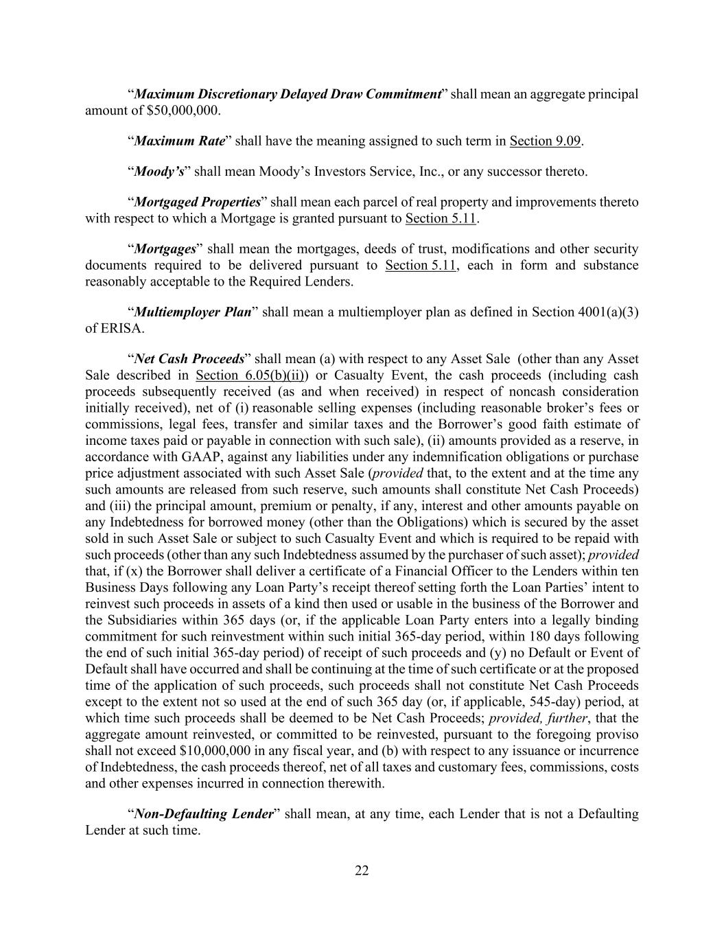 22 “Maximum Discretionary Delayed Draw Commitment” shall mean an aggregate principal amount of $50,000,000. “Maximum Rate” shall have the meaning assigned to such term in Section 9.09. “Moody’s” shall mean Moody’s Investors Service, Inc., or any successor thereto. “Mortgaged Properties” shall mean each parcel of real property and improvements thereto with respect to which a Mortgage is granted pursuant to Section 5.11. “Mortgages” shall mean the mortgages, deeds of trust, modifications and other security documents required to be delivered pursuant to Section 5.11, each in form and substance reasonably acceptable to the Required Lenders. “Multiemployer Plan” shall mean a multiemployer plan as defined in Section 4001(a)(3) of ERISA. “Net Cash Proceeds” shall mean (a) with respect to any Asset Sale (other than any Asset Sale described in Section 6.05(b)(ii)) or Casualty Event, the cash proceeds (including cash proceeds subsequently received (as and when received) in respect of noncash consideration initially received), net of (i) reasonable selling expenses (including reasonable broker’s fees or commissions, legal fees, transfer and similar taxes and the Borrower’s good faith estimate of income taxes paid or payable in connection with such sale), (ii) amounts provided as a reserve, in accordance with GAAP, against any liabilities under any indemnification obligations or purchase price adjustment associated with such Asset Sale (provided that, to the extent and at the time any such amounts are released from such reserve, such amounts shall constitute Net Cash Proceeds) and (iii) the principal amount, premium or penalty, if any, interest and other amounts payable on any Indebtedness for borrowed money (other than the Obligations) which is secured by the asset sold in such Asset Sale or subject to such Casualty Event and which is required to be repaid with such proceeds (other than any such Indebtedness assumed by the purchaser of such asset); provided that, if (x) the Borrower shall deliver a certificate of a Financial Officer to the Lenders within ten Business Days following any Loan Party’s receipt thereof setting forth the Loan Parties’ intent to reinvest such proceeds in assets of a kind then used or usable in the business of the Borrower and the Subsidiaries within 365 days (or, if the applicable Loan Party enters into a legally binding commitment for such reinvestment within such initial 365-day period, within 180 days following the end of such initial 365-day period) of receipt of such proceeds and (y) no Default or Event of Default shall have occurred and shall be continuing at the time of such certificate or at the proposed time of the application of such proceeds, such proceeds shall not constitute Net Cash Proceeds except to the extent not so used at the end of such 365 day (or, if applicable, 545-day) period, at which time such proceeds shall be deemed to be Net Cash Proceeds; provided, further, that the aggregate amount reinvested, or committed to be reinvested, pursuant to the foregoing proviso shall not exceed $10,000,000 in any fiscal year, and (b) with respect to any issuance or incurrence of Indebtedness, the cash proceeds thereof, net of all taxes and customary fees, commissions, costs and other expenses incurred in connection therewith. “Non-Defaulting Lender” shall mean, at any time, each Lender that is not a Defaulting Lender at such time.