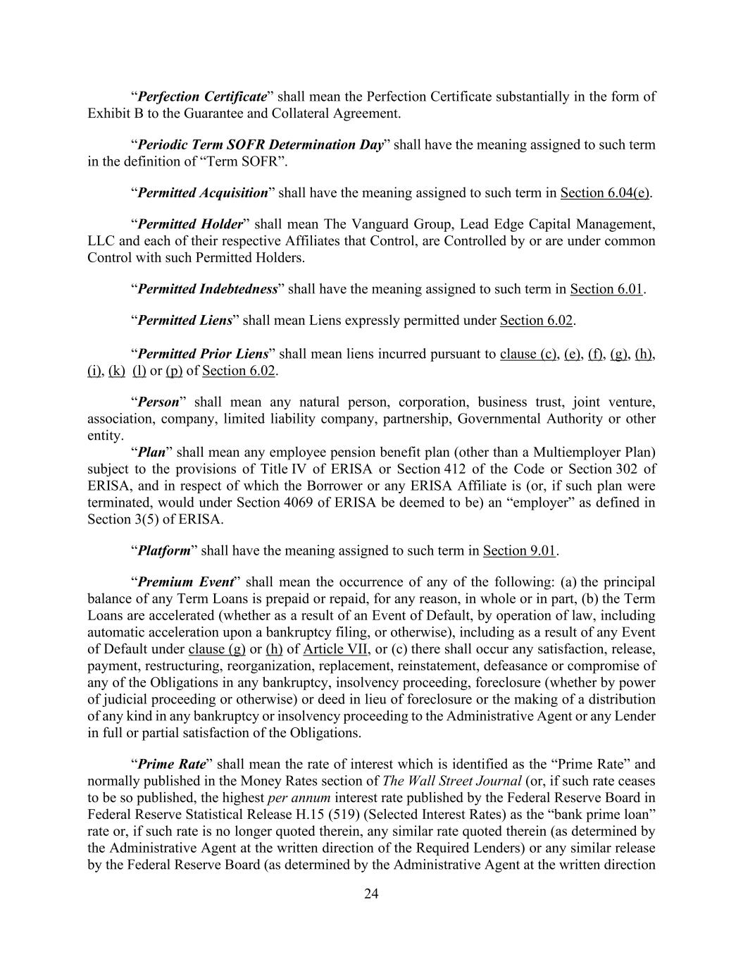 24 “Perfection Certificate” shall mean the Perfection Certificate substantially in the form of Exhibit B to the Guarantee and Collateral Agreement. “Periodic Term SOFR Determination Day” shall have the meaning assigned to such term in the definition of “Term SOFR”. “Permitted Acquisition” shall have the meaning assigned to such term in Section 6.04(e). “Permitted Holder” shall mean The Vanguard Group, Lead Edge Capital Management, LLC and each of their respective Affiliates that Control, are Controlled by or are under common Control with such Permitted Holders. “Permitted Indebtedness” shall have the meaning assigned to such term in Section 6.01. “Permitted Liens” shall mean Liens expressly permitted under Section 6.02. “Permitted Prior Liens” shall mean liens incurred pursuant to clause (c), (e), (f), (g), (h), (i), (k) (l) or (p) of Section 6.02. “Person” shall mean any natural person, corporation, business trust, joint venture, association, company, limited liability company, partnership, Governmental Authority or other entity. “Plan” shall mean any employee pension benefit plan (other than a Multiemployer Plan) subject to the provisions of Title IV of ERISA or Section 412 of the Code or Section 302 of ERISA, and in respect of which the Borrower or any ERISA Affiliate is (or, if such plan were terminated, would under Section 4069 of ERISA be deemed to be) an “employer” as defined in Section 3(5) of ERISA. “Platform” shall have the meaning assigned to such term in Section 9.01. “Premium Event” shall mean the occurrence of any of the following: (a) the principal balance of any Term Loans is prepaid or repaid, for any reason, in whole or in part, (b) the Term Loans are accelerated (whether as a result of an Event of Default, by operation of law, including automatic acceleration upon a bankruptcy filing, or otherwise), including as a result of any Event of Default under clause (g) or (h) of Article VII, or (c) there shall occur any satisfaction, release, payment, restructuring, reorganization, replacement, reinstatement, defeasance or compromise of any of the Obligations in any bankruptcy, insolvency proceeding, foreclosure (whether by power of judicial proceeding or otherwise) or deed in lieu of foreclosure or the making of a distribution of any kind in any bankruptcy or insolvency proceeding to the Administrative Agent or any Lender in full or partial satisfaction of the Obligations. “Prime Rate” shall mean the rate of interest which is identified as the “Prime Rate” and normally published in the Money Rates section of The Wall Street Journal (or, if such rate ceases to be so published, the highest per annum interest rate published by the Federal Reserve Board in Federal Reserve Statistical Release H.15 (519) (Selected Interest Rates) as the “bank prime loan” rate or, if such rate is no longer quoted therein, any similar rate quoted therein (as determined by the Administrative Agent at the written direction of the Required Lenders) or any similar release by the Federal Reserve Board (as determined by the Administrative Agent at the written direction