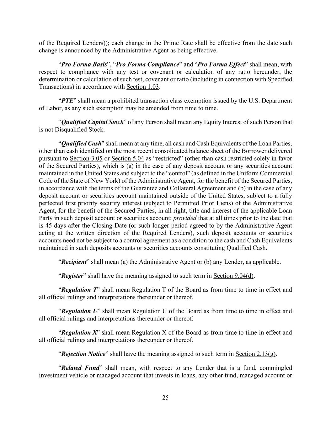 25 of the Required Lenders)); each change in the Prime Rate shall be effective from the date such change is announced by the Administrative Agent as being effective. “Pro Forma Basis”, “Pro Forma Compliance” and “Pro Forma Effect” shall mean, with respect to compliance with any test or covenant or calculation of any ratio hereunder, the determination or calculation of such test, covenant or ratio (including in connection with Specified Transactions) in accordance with Section 1.03. “PTE” shall mean a prohibited transaction class exemption issued by the U.S. Department of Labor, as any such exemption may be amended from time to time. “Qualified Capital Stock” of any Person shall mean any Equity Interest of such Person that is not Disqualified Stock. “Qualified Cash” shall mean at any time, all cash and Cash Equivalents of the Loan Parties, other than cash identified on the most recent consolidated balance sheet of the Borrower delivered pursuant to Section 3.05 or Section 5.04 as “restricted” (other than cash restricted solely in favor of the Secured Parties), which is (a) in the case of any deposit account or any securities account maintained in the United States and subject to the “control” (as defined in the Uniform Commercial Code of the State of New York) of the Administrative Agent, for the benefit of the Secured Parties, in accordance with the terms of the Guarantee and Collateral Agreement and (b) in the case of any deposit account or securities account maintained outside of the United States, subject to a fully perfected first priority security interest (subject to Permitted Prior Liens) of the Administrative Agent, for the benefit of the Secured Parties, in all right, title and interest of the applicable Loan Party in such deposit account or securities account; provided that at all times prior to the date that is 45 days after the Closing Date (or such longer period agreed to by the Administrative Agent acting at the written direction of the Required Lenders), such deposit accounts or securities accounts need not be subject to a control agreement as a condition to the cash and Cash Equivalents maintained in such deposits accounts or securities accounts constituting Qualified Cash. “Recipient” shall mean (a) the Administrative Agent or (b) any Lender, as applicable. “Register” shall have the meaning assigned to such term in Section 9.04(d). “Regulation T” shall mean Regulation T of the Board as from time to time in effect and all official rulings and interpretations thereunder or thereof. “Regulation U” shall mean Regulation U of the Board as from time to time in effect and all official rulings and interpretations thereunder or thereof. “Regulation X” shall mean Regulation X of the Board as from time to time in effect and all official rulings and interpretations thereunder or thereof. “Rejection Notice” shall have the meaning assigned to such term in Section 2.13(g). “Related Fund” shall mean, with respect to any Lender that is a fund, commingled investment vehicle or managed account that invests in loans, any other fund, managed account or