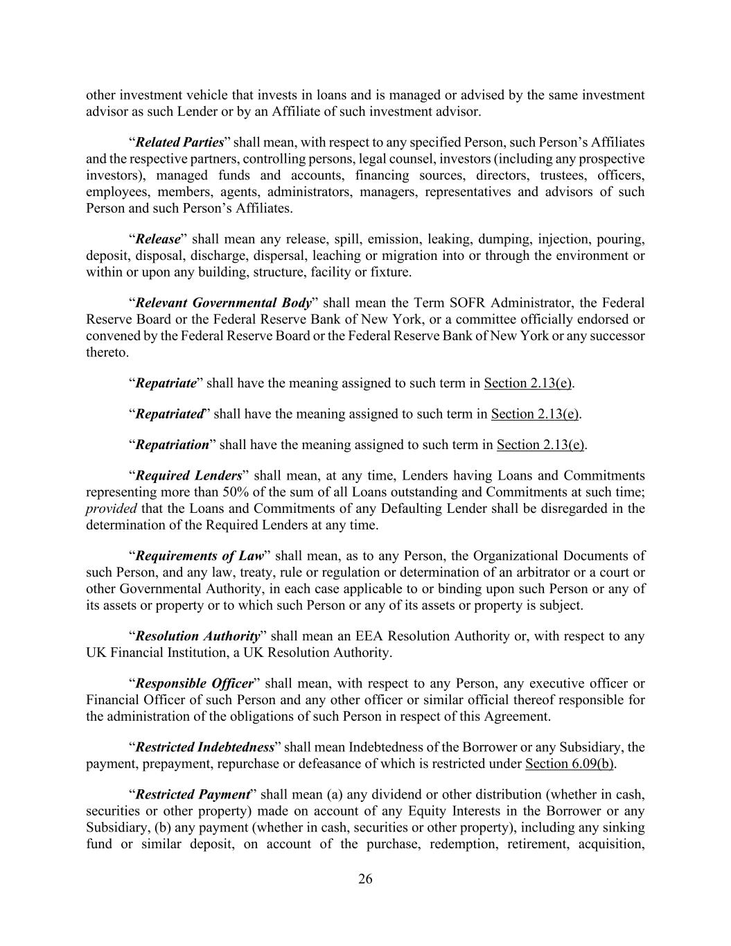 26 other investment vehicle that invests in loans and is managed or advised by the same investment advisor as such Lender or by an Affiliate of such investment advisor. “Related Parties” shall mean, with respect to any specified Person, such Person’s Affiliates and the respective partners, controlling persons, legal counsel, investors (including any prospective investors), managed funds and accounts, financing sources, directors, trustees, officers, employees, members, agents, administrators, managers, representatives and advisors of such Person and such Person’s Affiliates. “Release” shall mean any release, spill, emission, leaking, dumping, injection, pouring, deposit, disposal, discharge, dispersal, leaching or migration into or through the environment or within or upon any building, structure, facility or fixture. “Relevant Governmental Body” shall mean the Term SOFR Administrator, the Federal Reserve Board or the Federal Reserve Bank of New York, or a committee officially endorsed or convened by the Federal Reserve Board or the Federal Reserve Bank of New York or any successor thereto. “Repatriate” shall have the meaning assigned to such term in Section 2.13(e). “Repatriated” shall have the meaning assigned to such term in Section 2.13(e). “Repatriation” shall have the meaning assigned to such term in Section 2.13(e). “Required Lenders” shall mean, at any time, Lenders having Loans and Commitments representing more than 50% of the sum of all Loans outstanding and Commitments at such time; provided that the Loans and Commitments of any Defaulting Lender shall be disregarded in the determination of the Required Lenders at any time. “Requirements of Law” shall mean, as to any Person, the Organizational Documents of such Person, and any law, treaty, rule or regulation or determination of an arbitrator or a court or other Governmental Authority, in each case applicable to or binding upon such Person or any of its assets or property or to which such Person or any of its assets or property is subject. “Resolution Authority” shall mean an EEA Resolution Authority or, with respect to any UK Financial Institution, a UK Resolution Authority. “Responsible Officer” shall mean, with respect to any Person, any executive officer or Financial Officer of such Person and any other officer or similar official thereof responsible for the administration of the obligations of such Person in respect of this Agreement. “Restricted Indebtedness” shall mean Indebtedness of the Borrower or any Subsidiary, the payment, prepayment, repurchase or defeasance of which is restricted under Section 6.09(b). “Restricted Payment” shall mean (a) any dividend or other distribution (whether in cash, securities or other property) made on account of any Equity Interests in the Borrower or any Subsidiary, (b) any payment (whether in cash, securities or other property), including any sinking fund or similar deposit, on account of the purchase, redemption, retirement, acquisition,