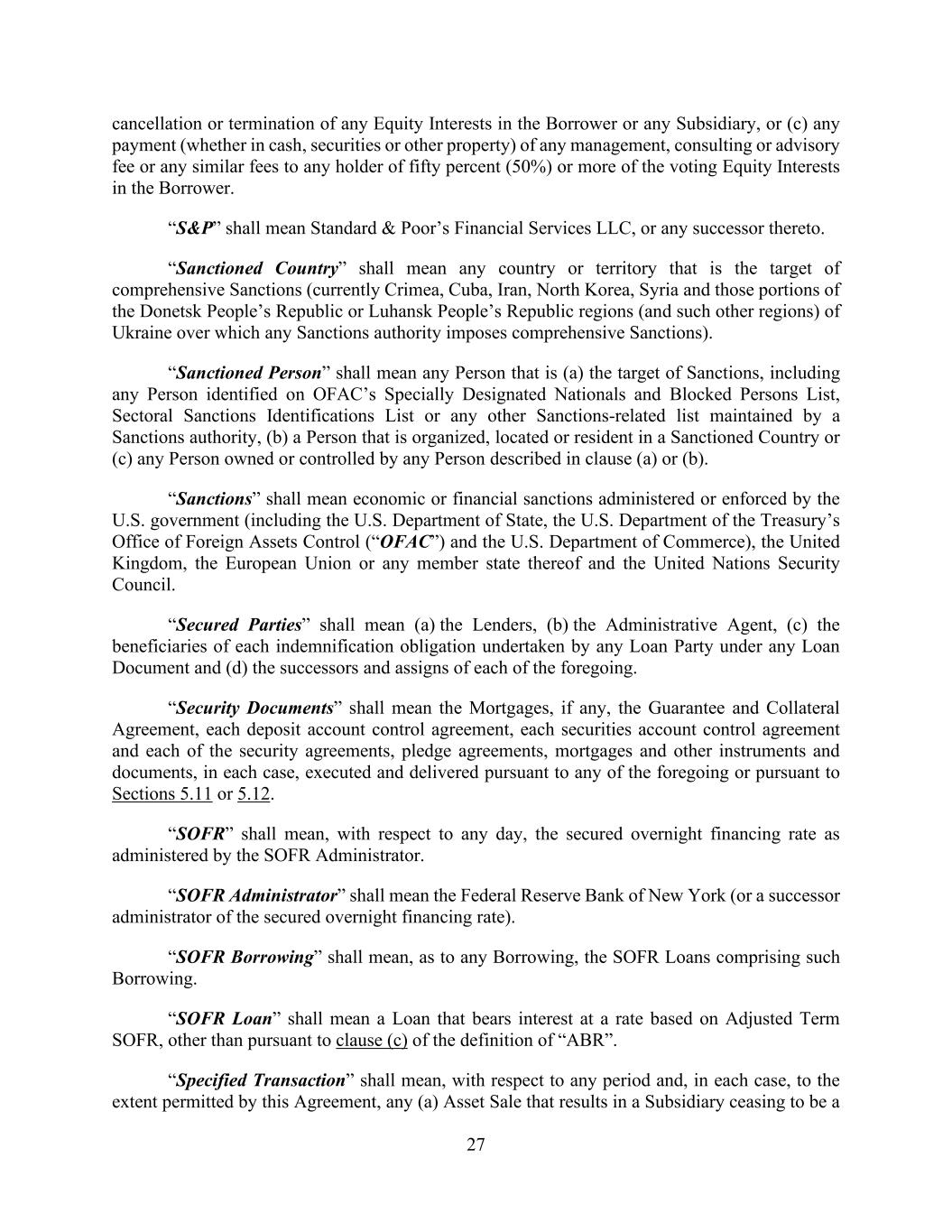 27 cancellation or termination of any Equity Interests in the Borrower or any Subsidiary, or (c) any payment (whether in cash, securities or other property) of any management, consulting or advisory fee or any similar fees to any holder of fifty percent (50%) or more of the voting Equity Interests in the Borrower. “S&P” shall mean Standard & Poor’s Financial Services LLC, or any successor thereto. “Sanctioned Country” shall mean any country or territory that is the target of comprehensive Sanctions (currently Crimea, Cuba, Iran, North Korea, Syria and those portions of the Donetsk People’s Republic or Luhansk People’s Republic regions (and such other regions) of Ukraine over which any Sanctions authority imposes comprehensive Sanctions). “Sanctioned Person” shall mean any Person that is (a) the target of Sanctions, including any Person identified on OFAC’s Specially Designated Nationals and Blocked Persons List, Sectoral Sanctions Identifications List or any other Sanctions-related list maintained by a Sanctions authority, (b) a Person that is organized, located or resident in a Sanctioned Country or (c) any Person owned or controlled by any Person described in clause (a) or (b). “Sanctions” shall mean economic or financial sanctions administered or enforced by the U.S. government (including the U.S. Department of State, the U.S. Department of the Treasury’s Office of Foreign Assets Control (“OFAC”) and the U.S. Department of Commerce), the United Kingdom, the European Union or any member state thereof and the United Nations Security Council. “Secured Parties” shall mean (a) the Lenders, (b) the Administrative Agent, (c) the beneficiaries of each indemnification obligation undertaken by any Loan Party under any Loan Document and (d) the successors and assigns of each of the foregoing. “Security Documents” shall mean the Mortgages, if any, the Guarantee and Collateral Agreement, each deposit account control agreement, each securities account control agreement and each of the security agreements, pledge agreements, mortgages and other instruments and documents, in each case, executed and delivered pursuant to any of the foregoing or pursuant to Sections 5.11 or 5.12. “SOFR” shall mean, with respect to any day, the secured overnight financing rate as administered by the SOFR Administrator. “SOFR Administrator” shall mean the Federal Reserve Bank of New York (or a successor administrator of the secured overnight financing rate). “SOFR Borrowing” shall mean, as to any Borrowing, the SOFR Loans comprising such Borrowing. “SOFR Loan” shall mean a Loan that bears interest at a rate based on Adjusted Term SOFR, other than pursuant to clause (c) of the definition of “ABR”. “Specified Transaction” shall mean, with respect to any period and, in each case, to the extent permitted by this Agreement, any (a) Asset Sale that results in a Subsidiary ceasing to be a