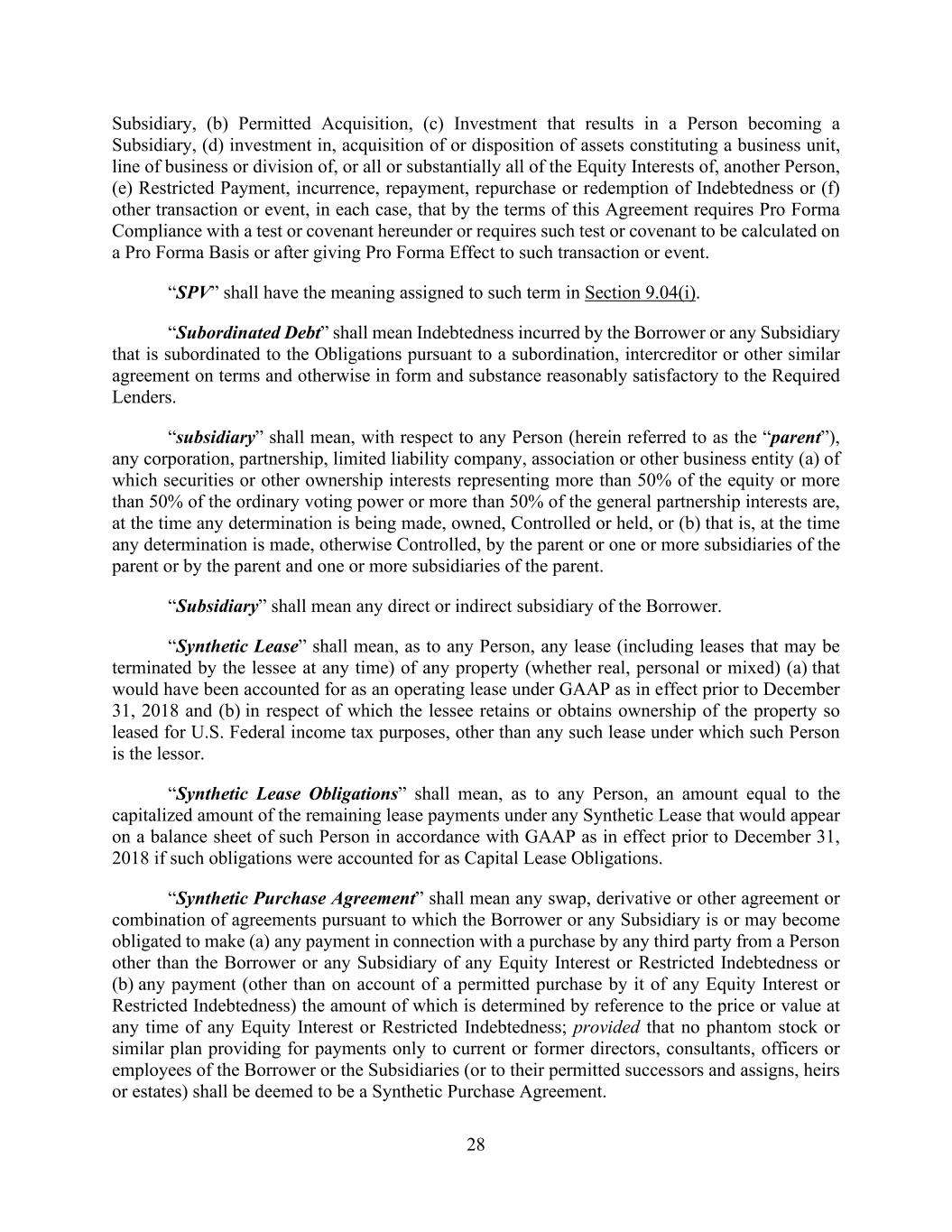 28 Subsidiary, (b) Permitted Acquisition, (c) Investment that results in a Person becoming a Subsidiary, (d) investment in, acquisition of or disposition of assets constituting a business unit, line of business or division of, or all or substantially all of the Equity Interests of, another Person, (e) Restricted Payment, incurrence, repayment, repurchase or redemption of Indebtedness or (f) other transaction or event, in each case, that by the terms of this Agreement requires Pro Forma Compliance with a test or covenant hereunder or requires such test or covenant to be calculated on a Pro Forma Basis or after giving Pro Forma Effect to such transaction or event. “SPV” shall have the meaning assigned to such term in Section 9.04(i). “Subordinated Debt” shall mean Indebtedness incurred by the Borrower or any Subsidiary that is subordinated to the Obligations pursuant to a subordination, intercreditor or other similar agreement on terms and otherwise in form and substance reasonably satisfactory to the Required Lenders. “subsidiary” shall mean, with respect to any Person (herein referred to as the “parent”), any corporation, partnership, limited liability company, association or other business entity (a) of which securities or other ownership interests representing more than 50% of the equity or more than 50% of the ordinary voting power or more than 50% of the general partnership interests are, at the time any determination is being made, owned, Controlled or held, or (b) that is, at the time any determination is made, otherwise Controlled, by the parent or one or more subsidiaries of the parent or by the parent and one or more subsidiaries of the parent. “Subsidiary” shall mean any direct or indirect subsidiary of the Borrower. “Synthetic Lease” shall mean, as to any Person, any lease (including leases that may be terminated by the lessee at any time) of any property (whether real, personal or mixed) (a) that would have been accounted for as an operating lease under GAAP as in effect prior to December 31, 2018 and (b) in respect of which the lessee retains or obtains ownership of the property so leased for U.S. Federal income tax purposes, other than any such lease under which such Person is the lessor. “Synthetic Lease Obligations” shall mean, as to any Person, an amount equal to the capitalized amount of the remaining lease payments under any Synthetic Lease that would appear on a balance sheet of such Person in accordance with GAAP as in effect prior to December 31, 2018 if such obligations were accounted for as Capital Lease Obligations. “Synthetic Purchase Agreement” shall mean any swap, derivative or other agreement or combination of agreements pursuant to which the Borrower or any Subsidiary is or may become obligated to make (a) any payment in connection with a purchase by any third party from a Person other than the Borrower or any Subsidiary of any Equity Interest or Restricted Indebtedness or (b) any payment (other than on account of a permitted purchase by it of any Equity Interest or Restricted Indebtedness) the amount of which is determined by reference to the price or value at any time of any Equity Interest or Restricted Indebtedness; provided that no phantom stock or similar plan providing for payments only to current or former directors, consultants, officers or employees of the Borrower or the Subsidiaries (or to their permitted successors and assigns, heirs or estates) shall be deemed to be a Synthetic Purchase Agreement.