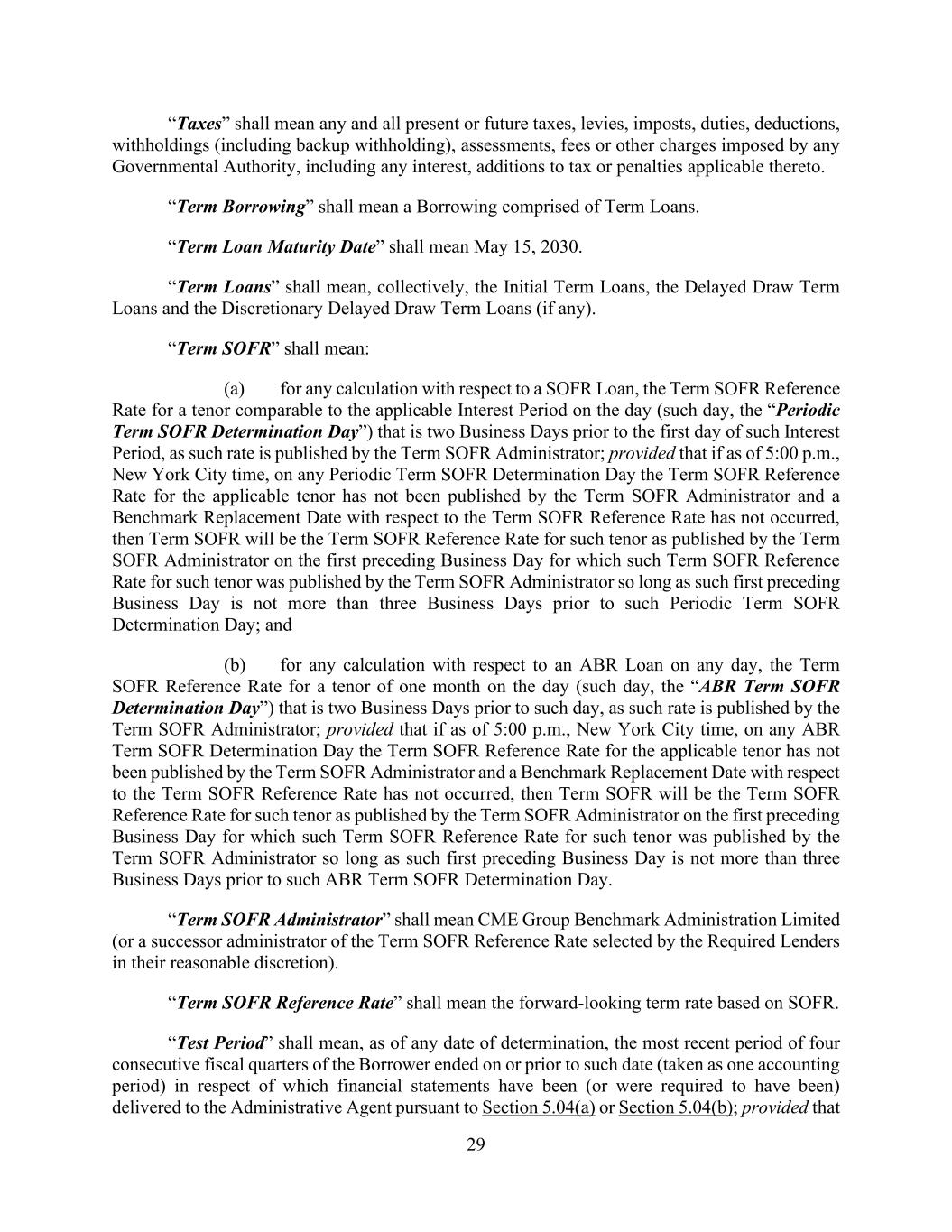 29 “Taxes” shall mean any and all present or future taxes, levies, imposts, duties, deductions, withholdings (including backup withholding), assessments, fees or other charges imposed by any Governmental Authority, including any interest, additions to tax or penalties applicable thereto. “Term Borrowing” shall mean a Borrowing comprised of Term Loans. “Term Loan Maturity Date” shall mean May 15, 2030. “Term Loans” shall mean, collectively, the Initial Term Loans, the Delayed Draw Term Loans and the Discretionary Delayed Draw Term Loans (if any). “Term SOFR” shall mean: (a) for any calculation with respect to a SOFR Loan, the Term SOFR Reference Rate for a tenor comparable to the applicable Interest Period on the day (such day, the “Periodic Term SOFR Determination Day”) that is two Business Days prior to the first day of such Interest Period, as such rate is published by the Term SOFR Administrator; provided that if as of 5:00 p.m., New York City time, on any Periodic Term SOFR Determination Day the Term SOFR Reference Rate for the applicable tenor has not been published by the Term SOFR Administrator and a Benchmark Replacement Date with respect to the Term SOFR Reference Rate has not occurred, then Term SOFR will be the Term SOFR Reference Rate for such tenor as published by the Term SOFR Administrator on the first preceding Business Day for which such Term SOFR Reference Rate for such tenor was published by the Term SOFR Administrator so long as such first preceding Business Day is not more than three Business Days prior to such Periodic Term SOFR Determination Day; and (b) for any calculation with respect to an ABR Loan on any day, the Term SOFR Reference Rate for a tenor of one month on the day (such day, the “ABR Term SOFR Determination Day”) that is two Business Days prior to such day, as such rate is published by the Term SOFR Administrator; provided that if as of 5:00 p.m., New York City time, on any ABR Term SOFR Determination Day the Term SOFR Reference Rate for the applicable tenor has not been published by the Term SOFR Administrator and a Benchmark Replacement Date with respect to the Term SOFR Reference Rate has not occurred, then Term SOFR will be the Term SOFR Reference Rate for such tenor as published by the Term SOFR Administrator on the first preceding Business Day for which such Term SOFR Reference Rate for such tenor was published by the Term SOFR Administrator so long as such first preceding Business Day is not more than three Business Days prior to such ABR Term SOFR Determination Day. “Term SOFR Administrator” shall mean CME Group Benchmark Administration Limited (or a successor administrator of the Term SOFR Reference Rate selected by the Required Lenders in their reasonable discretion). “Term SOFR Reference Rate” shall mean the forward-looking term rate based on SOFR. “Test Period” shall mean, as of any date of determination, the most recent period of four consecutive fiscal quarters of the Borrower ended on or prior to such date (taken as one accounting period) in respect of which financial statements have been (or were required to have been) delivered to the Administrative Agent pursuant to Section 5.04(a) or Section 5.04(b); provided that