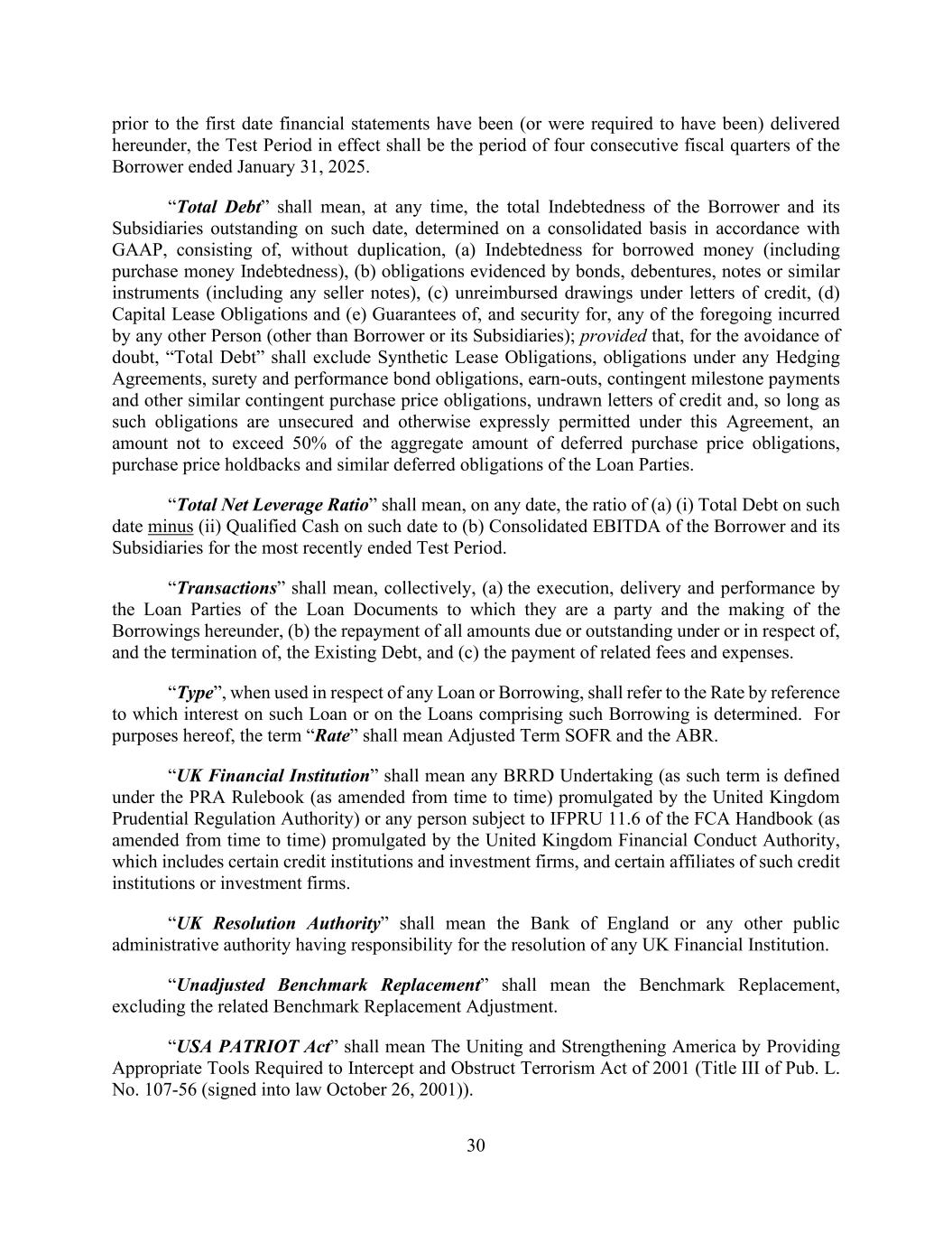 30 prior to the first date financial statements have been (or were required to have been) delivered hereunder, the Test Period in effect shall be the period of four consecutive fiscal quarters of the Borrower ended January 31, 2025. “Total Debt” shall mean, at any time, the total Indebtedness of the Borrower and its Subsidiaries outstanding on such date, determined on a consolidated basis in accordance with GAAP, consisting of, without duplication, (a) Indebtedness for borrowed money (including purchase money Indebtedness), (b) obligations evidenced by bonds, debentures, notes or similar instruments (including any seller notes), (c) unreimbursed drawings under letters of credit, (d) Capital Lease Obligations and (e) Guarantees of, and security for, any of the foregoing incurred by any other Person (other than Borrower or its Subsidiaries); provided that, for the avoidance of doubt, “Total Debt” shall exclude Synthetic Lease Obligations, obligations under any Hedging Agreements, surety and performance bond obligations, earn-outs, contingent milestone payments and other similar contingent purchase price obligations, undrawn letters of credit and, so long as such obligations are unsecured and otherwise expressly permitted under this Agreement, an amount not to exceed 50% of the aggregate amount of deferred purchase price obligations, purchase price holdbacks and similar deferred obligations of the Loan Parties. “Total Net Leverage Ratio” shall mean, on any date, the ratio of (a) (i) Total Debt on such date minus (ii) Qualified Cash on such date to (b) Consolidated EBITDA of the Borrower and its Subsidiaries for the most recently ended Test Period. “Transactions” shall mean, collectively, (a) the execution, delivery and performance by the Loan Parties of the Loan Documents to which they are a party and the making of the Borrowings hereunder, (b) the repayment of all amounts due or outstanding under or in respect of, and the termination of, the Existing Debt, and (c) the payment of related fees and expenses. “Type”, when used in respect of any Loan or Borrowing, shall refer to the Rate by reference to which interest on such Loan or on the Loans comprising such Borrowing is determined. For purposes hereof, the term “Rate” shall mean Adjusted Term SOFR and the ABR. “UK Financial Institution” shall mean any BRRD Undertaking (as such term is defined under the PRA Rulebook (as amended from time to time) promulgated by the United Kingdom Prudential Regulation Authority) or any person subject to IFPRU 11.6 of the FCA Handbook (as amended from time to time) promulgated by the United Kingdom Financial Conduct Authority, which includes certain credit institutions and investment firms, and certain affiliates of such credit institutions or investment firms. “UK Resolution Authority” shall mean the Bank of England or any other public administrative authority having responsibility for the resolution of any UK Financial Institution. “Unadjusted Benchmark Replacement” shall mean the Benchmark Replacement, excluding the related Benchmark Replacement Adjustment. “USA PATRIOT Act” shall mean The Uniting and Strengthening America by Providing Appropriate Tools Required to Intercept and Obstruct Terrorism Act of 2001 (Title III of Pub. L. No. 107-56 (signed into law October 26, 2001)).