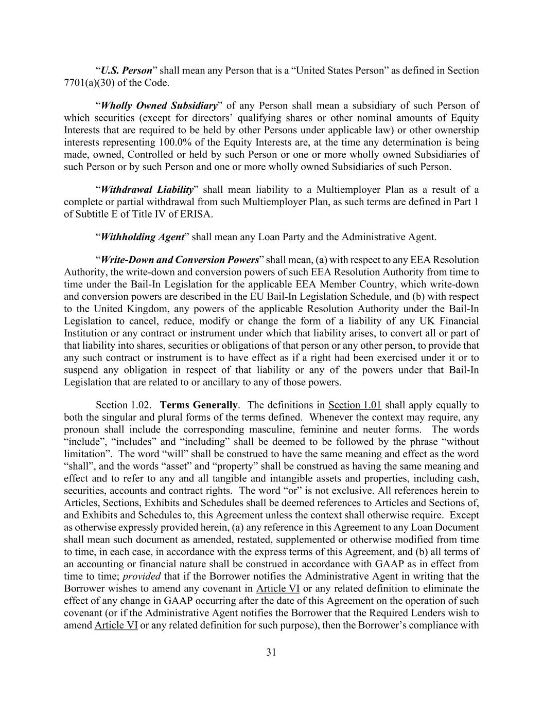 31 “U.S. Person” shall mean any Person that is a “United States Person” as defined in Section 7701(a)(30) of the Code. “Wholly Owned Subsidiary” of any Person shall mean a subsidiary of such Person of which securities (except for directors’ qualifying shares or other nominal amounts of Equity Interests that are required to be held by other Persons under applicable law) or other ownership interests representing 100.0% of the Equity Interests are, at the time any determination is being made, owned, Controlled or held by such Person or one or more wholly owned Subsidiaries of such Person or by such Person and one or more wholly owned Subsidiaries of such Person. “Withdrawal Liability” shall mean liability to a Multiemployer Plan as a result of a complete or partial withdrawal from such Multiemployer Plan, as such terms are defined in Part 1 of Subtitle E of Title IV of ERISA. “Withholding Agent” shall mean any Loan Party and the Administrative Agent. “Write-Down and Conversion Powers” shall mean, (a) with respect to any EEA Resolution Authority, the write-down and conversion powers of such EEA Resolution Authority from time to time under the Bail-In Legislation for the applicable EEA Member Country, which write-down and conversion powers are described in the EU Bail-In Legislation Schedule, and (b) with respect to the United Kingdom, any powers of the applicable Resolution Authority under the Bail-In Legislation to cancel, reduce, modify or change the form of a liability of any UK Financial Institution or any contract or instrument under which that liability arises, to convert all or part of that liability into shares, securities or obligations of that person or any other person, to provide that any such contract or instrument is to have effect as if a right had been exercised under it or to suspend any obligation in respect of that liability or any of the powers under that Bail-In Legislation that are related to or ancillary to any of those powers. Section 1.02. Terms Generally. The definitions in Section 1.01 shall apply equally to both the singular and plural forms of the terms defined. Whenever the context may require, any pronoun shall include the corresponding masculine, feminine and neuter forms. The words “include”, “includes” and “including” shall be deemed to be followed by the phrase “without limitation”. The word “will” shall be construed to have the same meaning and effect as the word “shall”, and the words “asset” and “property” shall be construed as having the same meaning and effect and to refer to any and all tangible and intangible assets and properties, including cash, securities, accounts and contract rights. The word “or” is not exclusive. All references herein to Articles, Sections, Exhibits and Schedules shall be deemed references to Articles and Sections of, and Exhibits and Schedules to, this Agreement unless the context shall otherwise require. Except as otherwise expressly provided herein, (a) any reference in this Agreement to any Loan Document shall mean such document as amended, restated, supplemented or otherwise modified from time to time, in each case, in accordance with the express terms of this Agreement, and (b) all terms of an accounting or financial nature shall be construed in accordance with GAAP as in effect from time to time; provided that if the Borrower notifies the Administrative Agent in writing that the Borrower wishes to amend any covenant in Article VI or any related definition to eliminate the effect of any change in GAAP occurring after the date of this Agreement on the operation of such covenant (or if the Administrative Agent notifies the Borrower that the Required Lenders wish to amend Article VI or any related definition for such purpose), then the Borrower’s compliance with