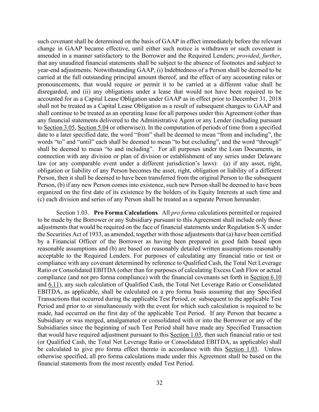 32 such covenant shall be determined on the basis of GAAP in effect immediately before the relevant change in GAAP became effective, until either such notice is withdrawn or such covenant is amended in a manner satisfactory to the Borrower and the Required Lenders; provided, further, that any unaudited financial statements shall be subject to the absence of footnotes and subject to year-end adjustments. Notwithstanding GAAP, (i) Indebtedness of a Person shall be deemed to be carried at the full outstanding principal amount thereof, and the effect of any accounting rules or pronouncements, that would require or permit it to be carried at a different value shall be disregarded, and (ii) any obligations under a lease that would not have been required to be accounted for as a Capital Lease Obligation under GAAP as in effect prior to December 31, 2018 shall not be treated as a Capital Lease Obligation as a result of subsequent changes to GAAP and shall continue to be treated as an operating lease for all purposes under this Agreement (other than any financial statements delivered to the Administrative Agent or any Lender (including pursuant to Section 3.05, Section 5.04 or otherwise)). In the computation of periods of time from a specified date to a later specified date, the word “from” shall be deemed to mean “from and including”, the words “to” and “until” each shall be deemed to mean “to but excluding”, and the word “through” shall be deemed to mean “to and including”. For all purposes under the Loan Documents, in connection with any division or plan of division or establishment of any series under Delaware law (or any comparable event under a different jurisdiction’s laws): (a) if any asset, right, obligation or liability of any Person becomes the asset, right, obligation or liability of a different Person, then it shall be deemed to have been transferred from the original Person to the subsequent Person, (b) if any new Person comes into existence, such new Person shall be deemed to have been organized on the first date of its existence by the holders of its Equity Interests at such time and (c) each division and series of any Person shall be treated as a separate Person hereunder. Section 1.03. Pro Forma Calculations. All pro forma calculations permitted or required to be made by the Borrower or any Subsidiary pursuant to this Agreement shall include only those adjustments that would be required on the face of financial statements under Regulation S-X under the Securities Act of 1933, as amended, together with those adjustments that (a) have been certified by a Financial Officer of the Borrower as having been prepared in good faith based upon reasonable assumptions and (b) are based on reasonably detailed written assumptions reasonably acceptable to the Required Lenders. For purposes of calculating any financial ratio or test or compliance with any covenant determined by reference to Qualified Cash, the Total Net Leverage Ratio or Consolidated EBITDA (other than for purposes of calculating Excess Cash Flow or actual compliance (and not pro forma compliance) with the financial covenants set forth in Section 6.10 and 6.11), any such calculation of Qualified Cash, the Total Net Leverage Ratio or Consolidated EBITDA, as applicable, shall be calculated on a pro forma basis assuming that any Specified Transactions that occurred during the applicable Test Period, or subsequent to the applicable Test Period and prior to or simultaneously with the event for which such calculation is required to be made, had occurred on the first day of the applicable Test Period. If any Person that became a Subsidiary or was merged, amalgamated or consolidated with or into the Borrower or any of the Subsidiaries since the beginning of such Test Period shall have made any Specified Transaction that would have required adjustment pursuant to this Section 1.03, then such financial ratio or test (or Qualified Cash, the Total Net Leverage Ratio or Consolidated EBITDA, as applicable) shall be calculated to give pro forma effect thereto in accordance with this Section 1.03. Unless otherwise specified, all pro forma calculations made under this Agreement shall be based on the financial statements from the most recently ended Test Period.