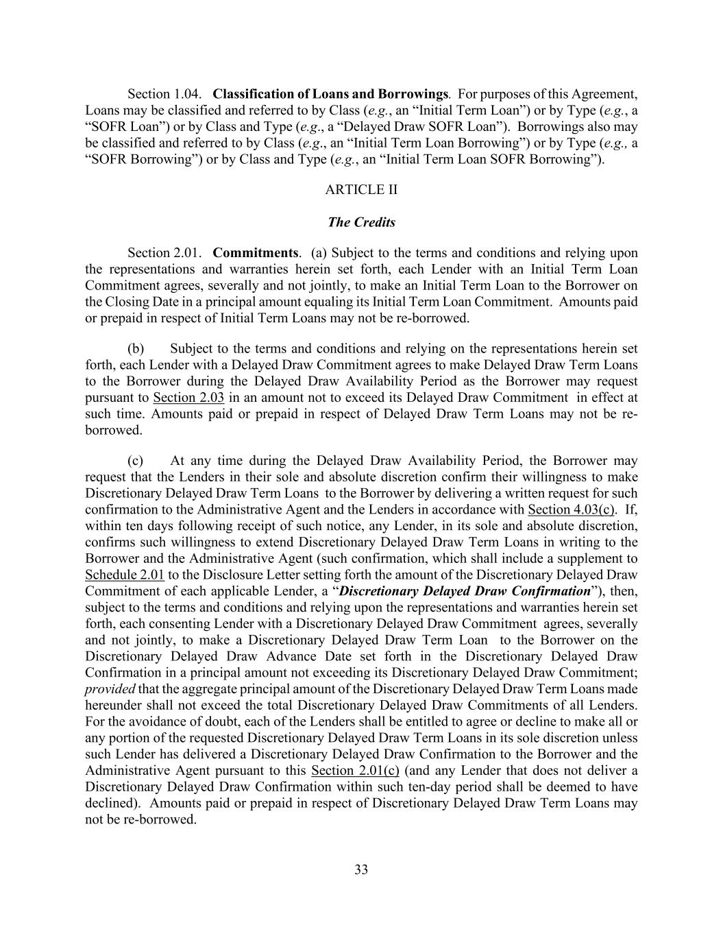 33 Section 1.04. Classification of Loans and Borrowings. For purposes of this Agreement, Loans may be classified and referred to by Class (e.g., an “Initial Term Loan”) or by Type (e.g., a “SOFR Loan”) or by Class and Type (e.g., a “Delayed Draw SOFR Loan”). Borrowings also may be classified and referred to by Class (e.g., an “Initial Term Loan Borrowing”) or by Type (e.g., a “SOFR Borrowing”) or by Class and Type (e.g., an “Initial Term Loan SOFR Borrowing”). ARTICLE II The Credits Section 2.01. Commitments. (a) Subject to the terms and conditions and relying upon the representations and warranties herein set forth, each Lender with an Initial Term Loan Commitment agrees, severally and not jointly, to make an Initial Term Loan to the Borrower on the Closing Date in a principal amount equaling its Initial Term Loan Commitment. Amounts paid or prepaid in respect of Initial Term Loans may not be re-borrowed. (b) Subject to the terms and conditions and relying on the representations herein set forth, each Lender with a Delayed Draw Commitment agrees to make Delayed Draw Term Loans to the Borrower during the Delayed Draw Availability Period as the Borrower may request pursuant to Section 2.03 in an amount not to exceed its Delayed Draw Commitment in effect at such time. Amounts paid or prepaid in respect of Delayed Draw Term Loans may not be re- borrowed. (c) At any time during the Delayed Draw Availability Period, the Borrower may request that the Lenders in their sole and absolute discretion confirm their willingness to make Discretionary Delayed Draw Term Loans to the Borrower by delivering a written request for such confirmation to the Administrative Agent and the Lenders in accordance with Section 4.03(c). If, within ten days following receipt of such notice, any Lender, in its sole and absolute discretion, confirms such willingness to extend Discretionary Delayed Draw Term Loans in writing to the Borrower and the Administrative Agent (such confirmation, which shall include a supplement to Schedule 2.01 to the Disclosure Letter setting forth the amount of the Discretionary Delayed Draw Commitment of each applicable Lender, a “Discretionary Delayed Draw Confirmation”), then, subject to the terms and conditions and relying upon the representations and warranties herein set forth, each consenting Lender with a Discretionary Delayed Draw Commitment agrees, severally and not jointly, to make a Discretionary Delayed Draw Term Loan to the Borrower on the Discretionary Delayed Draw Advance Date set forth in the Discretionary Delayed Draw Confirmation in a principal amount not exceeding its Discretionary Delayed Draw Commitment; provided that the aggregate principal amount of the Discretionary Delayed Draw Term Loans made hereunder shall not exceed the total Discretionary Delayed Draw Commitments of all Lenders. For the avoidance of doubt, each of the Lenders shall be entitled to agree or decline to make all or any portion of the requested Discretionary Delayed Draw Term Loans in its sole discretion unless such Lender has delivered a Discretionary Delayed Draw Confirmation to the Borrower and the Administrative Agent pursuant to this Section 2.01(c) (and any Lender that does not deliver a Discretionary Delayed Draw Confirmation within such ten-day period shall be deemed to have declined). Amounts paid or prepaid in respect of Discretionary Delayed Draw Term Loans may not be re-borrowed.