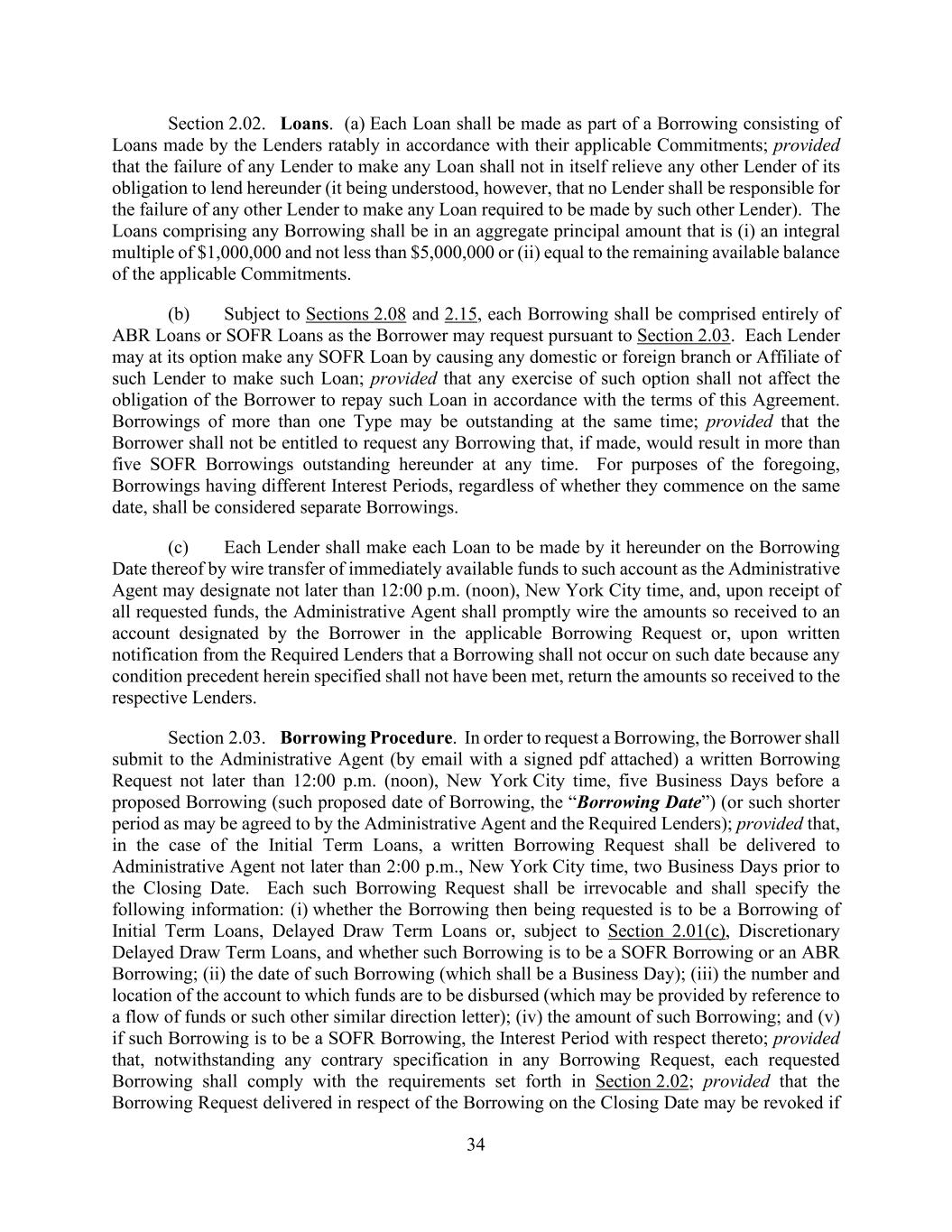 34 Section 2.02. Loans. (a) Each Loan shall be made as part of a Borrowing consisting of Loans made by the Lenders ratably in accordance with their applicable Commitments; provided that the failure of any Lender to make any Loan shall not in itself relieve any other Lender of its obligation to lend hereunder (it being understood, however, that no Lender shall be responsible for the failure of any other Lender to make any Loan required to be made by such other Lender). The Loans comprising any Borrowing shall be in an aggregate principal amount that is (i) an integral multiple of $1,000,000 and not less than $5,000,000 or (ii) equal to the remaining available balance of the applicable Commitments. (b) Subject to Sections 2.08 and 2.15, each Borrowing shall be comprised entirely of ABR Loans or SOFR Loans as the Borrower may request pursuant to Section 2.03. Each Lender may at its option make any SOFR Loan by causing any domestic or foreign branch or Affiliate of such Lender to make such Loan; provided that any exercise of such option shall not affect the obligation of the Borrower to repay such Loan in accordance with the terms of this Agreement. Borrowings of more than one Type may be outstanding at the same time; provided that the Borrower shall not be entitled to request any Borrowing that, if made, would result in more than five SOFR Borrowings outstanding hereunder at any time. For purposes of the foregoing, Borrowings having different Interest Periods, regardless of whether they commence on the same date, shall be considered separate Borrowings. (c) Each Lender shall make each Loan to be made by it hereunder on the Borrowing Date thereof by wire transfer of immediately available funds to such account as the Administrative Agent may designate not later than 12:00 p.m. (noon), New York City time, and, upon receipt of all requested funds, the Administrative Agent shall promptly wire the amounts so received to an account designated by the Borrower in the applicable Borrowing Request or, upon written notification from the Required Lenders that a Borrowing shall not occur on such date because any condition precedent herein specified shall not have been met, return the amounts so received to the respective Lenders. Section 2.03. Borrowing Procedure. In order to request a Borrowing, the Borrower shall submit to the Administrative Agent (by email with a signed pdf attached) a written Borrowing Request not later than 12:00 p.m. (noon), New York City time, five Business Days before a proposed Borrowing (such proposed date of Borrowing, the “Borrowing Date”) (or such shorter period as may be agreed to by the Administrative Agent and the Required Lenders); provided that, in the case of the Initial Term Loans, a written Borrowing Request shall be delivered to Administrative Agent not later than 2:00 p.m., New York City time, two Business Days prior to the Closing Date. Each such Borrowing Request shall be irrevocable and shall specify the following information: (i) whether the Borrowing then being requested is to be a Borrowing of Initial Term Loans, Delayed Draw Term Loans or, subject to Section 2.01(c), Discretionary Delayed Draw Term Loans, and whether such Borrowing is to be a SOFR Borrowing or an ABR Borrowing; (ii) the date of such Borrowing (which shall be a Business Day); (iii) the number and location of the account to which funds are to be disbursed (which may be provided by reference to a flow of funds or such other similar direction letter); (iv) the amount of such Borrowing; and (v) if such Borrowing is to be a SOFR Borrowing, the Interest Period with respect thereto; provided that, notwithstanding any contrary specification in any Borrowing Request, each requested Borrowing shall comply with the requirements set forth in Section 2.02; provided that the Borrowing Request delivered in respect of the Borrowing on the Closing Date may be revoked if