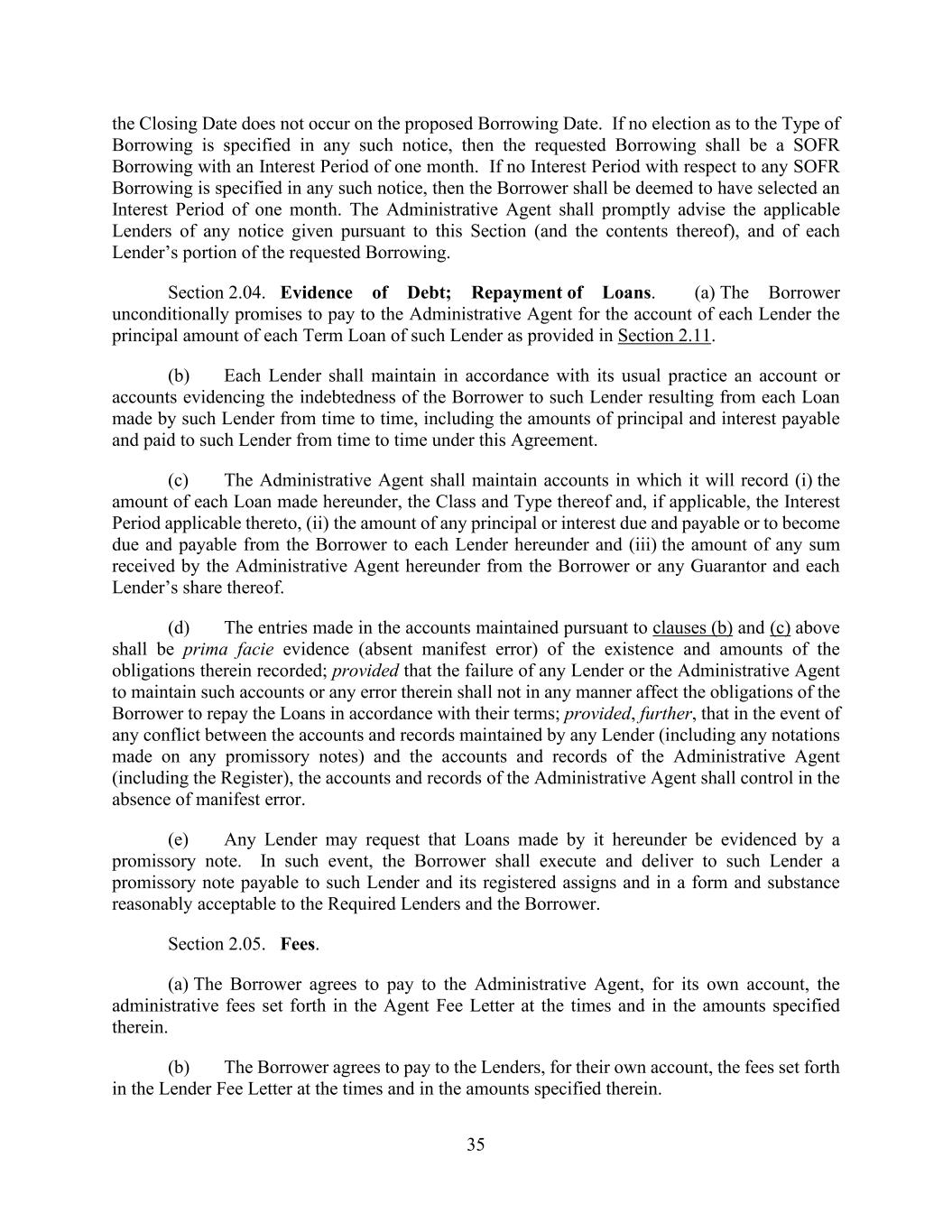 35 the Closing Date does not occur on the proposed Borrowing Date. If no election as to the Type of Borrowing is specified in any such notice, then the requested Borrowing shall be a SOFR Borrowing with an Interest Period of one month. If no Interest Period with respect to any SOFR Borrowing is specified in any such notice, then the Borrower shall be deemed to have selected an Interest Period of one month. The Administrative Agent shall promptly advise the applicable Lenders of any notice given pursuant to this Section (and the contents thereof), and of each Lender’s portion of the requested Borrowing. Section 2.04. Evidence of Debt; Repayment of Loans. (a) The Borrower unconditionally promises to pay to the Administrative Agent for the account of each Lender the principal amount of each Term Loan of such Lender as provided in Section 2.11. (b) Each Lender shall maintain in accordance with its usual practice an account or accounts evidencing the indebtedness of the Borrower to such Lender resulting from each Loan made by such Lender from time to time, including the amounts of principal and interest payable and paid to such Lender from time to time under this Agreement. (c) The Administrative Agent shall maintain accounts in which it will record (i) the amount of each Loan made hereunder, the Class and Type thereof and, if applicable, the Interest Period applicable thereto, (ii) the amount of any principal or interest due and payable or to become due and payable from the Borrower to each Lender hereunder and (iii) the amount of any sum received by the Administrative Agent hereunder from the Borrower or any Guarantor and each Lender’s share thereof. (d) The entries made in the accounts maintained pursuant to clauses (b) and (c) above shall be prima facie evidence (absent manifest error) of the existence and amounts of the obligations therein recorded; provided that the failure of any Lender or the Administrative Agent to maintain such accounts or any error therein shall not in any manner affect the obligations of the Borrower to repay the Loans in accordance with their terms; provided, further, that in the event of any conflict between the accounts and records maintained by any Lender (including any notations made on any promissory notes) and the accounts and records of the Administrative Agent (including the Register), the accounts and records of the Administrative Agent shall control in the absence of manifest error. (e) Any Lender may request that Loans made by it hereunder be evidenced by a promissory note. In such event, the Borrower shall execute and deliver to such Lender a promissory note payable to such Lender and its registered assigns and in a form and substance reasonably acceptable to the Required Lenders and the Borrower. Section 2.05. Fees. (a) The Borrower agrees to pay to the Administrative Agent, for its own account, the administrative fees set forth in the Agent Fee Letter at the times and in the amounts specified therein. (b) The Borrower agrees to pay to the Lenders, for their own account, the fees set forth in the Lender Fee Letter at the times and in the amounts specified therein.