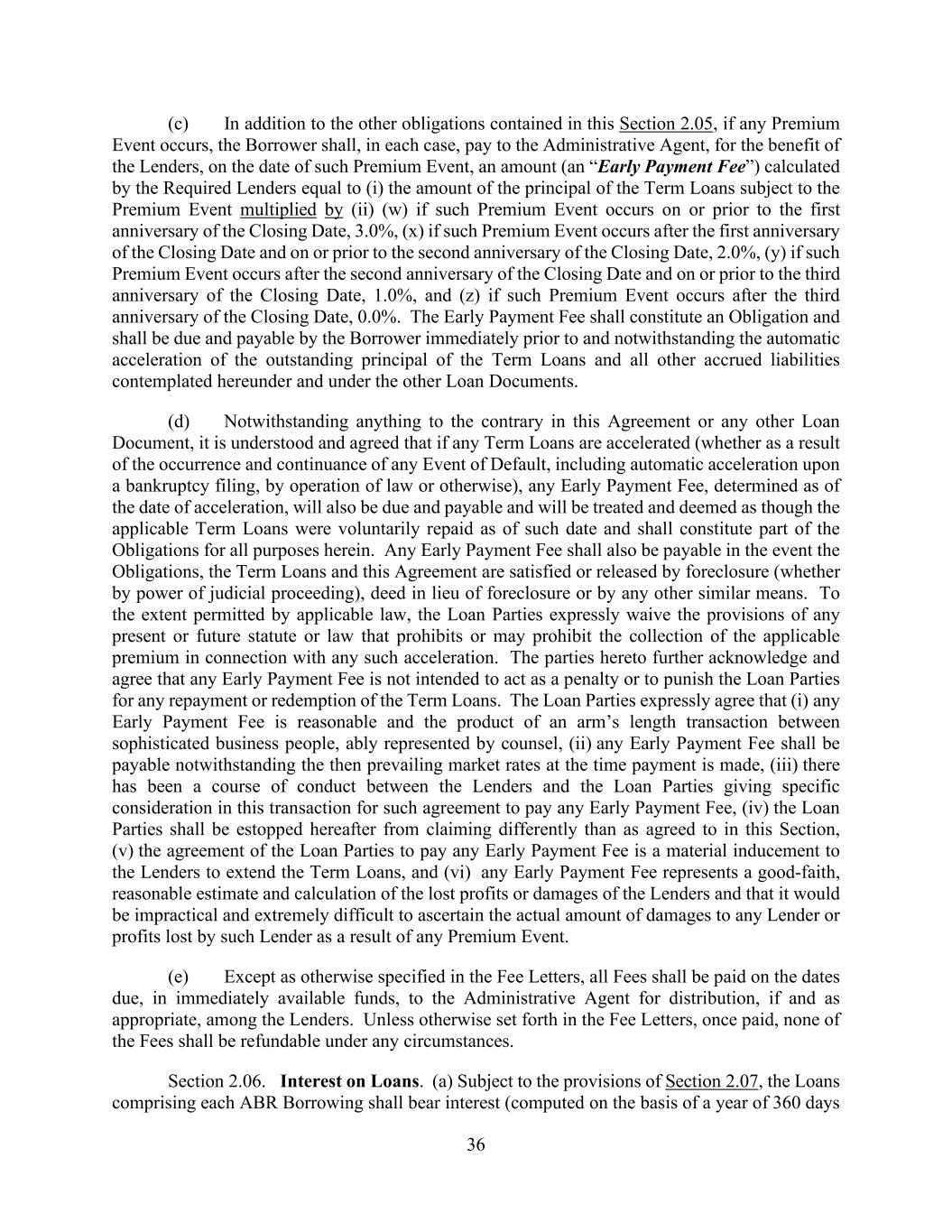 36 (c) In addition to the other obligations contained in this Section 2.05, if any Premium Event occurs, the Borrower shall, in each case, pay to the Administrative Agent, for the benefit of the Lenders, on the date of such Premium Event, an amount (an “Early Payment Fee”) calculated by the Required Lenders equal to (i) the amount of the principal of the Term Loans subject to the Premium Event multiplied by (ii) (w) if such Premium Event occurs on or prior to the first anniversary of the Closing Date, 3.0%, (x) if such Premium Event occurs after the first anniversary of the Closing Date and on or prior to the second anniversary of the Closing Date, 2.0%, (y) if such Premium Event occurs after the second anniversary of the Closing Date and on or prior to the third anniversary of the Closing Date, 1.0%, and (z) if such Premium Event occurs after the third anniversary of the Closing Date, 0.0%. The Early Payment Fee shall constitute an Obligation and shall be due and payable by the Borrower immediately prior to and notwithstanding the automatic acceleration of the outstanding principal of the Term Loans and all other accrued liabilities contemplated hereunder and under the other Loan Documents. (d) Notwithstanding anything to the contrary in this Agreement or any other Loan Document, it is understood and agreed that if any Term Loans are accelerated (whether as a result of the occurrence and continuance of any Event of Default, including automatic acceleration upon a bankruptcy filing, by operation of law or otherwise), any Early Payment Fee, determined as of the date of acceleration, will also be due and payable and will be treated and deemed as though the applicable Term Loans were voluntarily repaid as of such date and shall constitute part of the Obligations for all purposes herein. Any Early Payment Fee shall also be payable in the event the Obligations, the Term Loans and this Agreement are satisfied or released by foreclosure (whether by power of judicial proceeding), deed in lieu of foreclosure or by any other similar means. To the extent permitted by applicable law, the Loan Parties expressly waive the provisions of any present or future statute or law that prohibits or may prohibit the collection of the applicable premium in connection with any such acceleration. The parties hereto further acknowledge and agree that any Early Payment Fee is not intended to act as a penalty or to punish the Loan Parties for any repayment or redemption of the Term Loans. The Loan Parties expressly agree that (i) any Early Payment Fee is reasonable and the product of an arm’s length transaction between sophisticated business people, ably represented by counsel, (ii) any Early Payment Fee shall be payable notwithstanding the then prevailing market rates at the time payment is made, (iii) there has been a course of conduct between the Lenders and the Loan Parties giving specific consideration in this transaction for such agreement to pay any Early Payment Fee, (iv) the Loan Parties shall be estopped hereafter from claiming differently than as agreed to in this Section, (v) the agreement of the Loan Parties to pay any Early Payment Fee is a material inducement to the Lenders to extend the Term Loans, and (vi) any Early Payment Fee represents a good-faith, reasonable estimate and calculation of the lost profits or damages of the Lenders and that it would be impractical and extremely difficult to ascertain the actual amount of damages to any Lender or profits lost by such Lender as a result of any Premium Event. (e) Except as otherwise specified in the Fee Letters, all Fees shall be paid on the dates due, in immediately available funds, to the Administrative Agent for distribution, if and as appropriate, among the Lenders. Unless otherwise set forth in the Fee Letters, once paid, none of the Fees shall be refundable under any circumstances. Section 2.06. Interest on Loans. (a) Subject to the provisions of Section 2.07, the Loans comprising each ABR Borrowing shall bear interest (computed on the basis of a year of 360 days