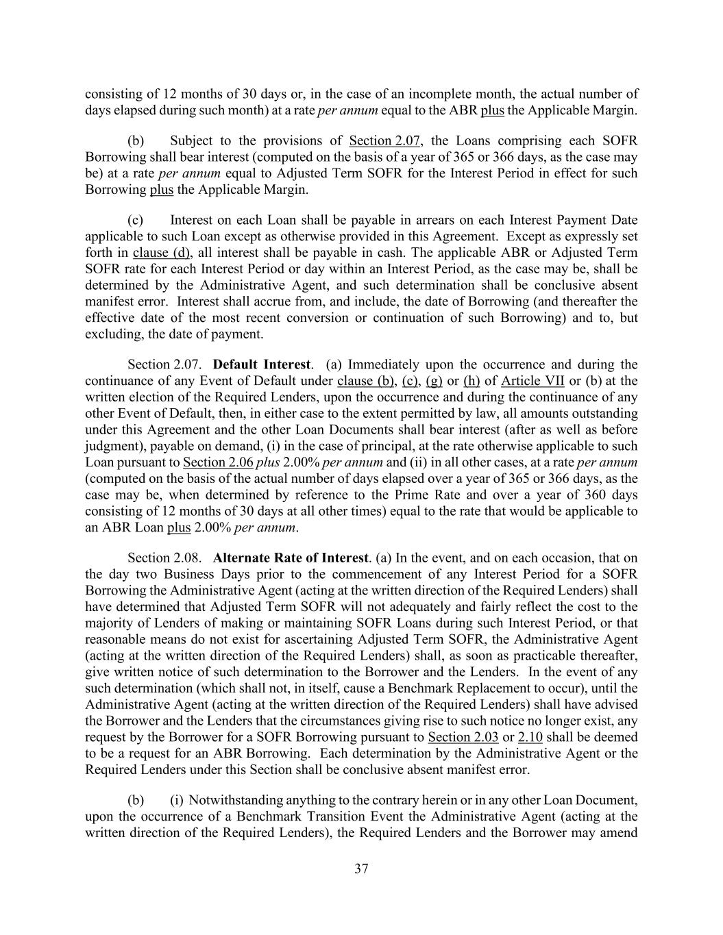 37 consisting of 12 months of 30 days or, in the case of an incomplete month, the actual number of days elapsed during such month) at a rate per annum equal to the ABR plus the Applicable Margin. (b) Subject to the provisions of Section 2.07, the Loans comprising each SOFR Borrowing shall bear interest (computed on the basis of a year of 365 or 366 days, as the case may be) at a rate per annum equal to Adjusted Term SOFR for the Interest Period in effect for such Borrowing plus the Applicable Margin. (c) Interest on each Loan shall be payable in arrears on each Interest Payment Date applicable to such Loan except as otherwise provided in this Agreement. Except as expressly set forth in clause (d), all interest shall be payable in cash. The applicable ABR or Adjusted Term SOFR rate for each Interest Period or day within an Interest Period, as the case may be, shall be determined by the Administrative Agent, and such determination shall be conclusive absent manifest error. Interest shall accrue from, and include, the date of Borrowing (and thereafter the effective date of the most recent conversion or continuation of such Borrowing) and to, but excluding, the date of payment. Section 2.07. Default Interest. (a) Immediately upon the occurrence and during the continuance of any Event of Default under clause (b), (c), (g) or (h) of Article VII or (b) at the written election of the Required Lenders, upon the occurrence and during the continuance of any other Event of Default, then, in either case to the extent permitted by law, all amounts outstanding under this Agreement and the other Loan Documents shall bear interest (after as well as before judgment), payable on demand, (i) in the case of principal, at the rate otherwise applicable to such Loan pursuant to Section 2.06 plus 2.00% per annum and (ii) in all other cases, at a rate per annum (computed on the basis of the actual number of days elapsed over a year of 365 or 366 days, as the case may be, when determined by reference to the Prime Rate and over a year of 360 days consisting of 12 months of 30 days at all other times) equal to the rate that would be applicable to an ABR Loan plus 2.00% per annum. Section 2.08. Alternate Rate of Interest. (a) In the event, and on each occasion, that on the day two Business Days prior to the commencement of any Interest Period for a SOFR Borrowing the Administrative Agent (acting at the written direction of the Required Lenders) shall have determined that Adjusted Term SOFR will not adequately and fairly reflect the cost to the majority of Lenders of making or maintaining SOFR Loans during such Interest Period, or that reasonable means do not exist for ascertaining Adjusted Term SOFR, the Administrative Agent (acting at the written direction of the Required Lenders) shall, as soon as practicable thereafter, give written notice of such determination to the Borrower and the Lenders. In the event of any such determination (which shall not, in itself, cause a Benchmark Replacement to occur), until the Administrative Agent (acting at the written direction of the Required Lenders) shall have advised the Borrower and the Lenders that the circumstances giving rise to such notice no longer exist, any request by the Borrower for a SOFR Borrowing pursuant to Section 2.03 or 2.10 shall be deemed to be a request for an ABR Borrowing. Each determination by the Administrative Agent or the Required Lenders under this Section shall be conclusive absent manifest error. (b) (i) Notwithstanding anything to the contrary herein or in any other Loan Document, upon the occurrence of a Benchmark Transition Event the Administrative Agent (acting at the written direction of the Required Lenders), the Required Lenders and the Borrower may amend