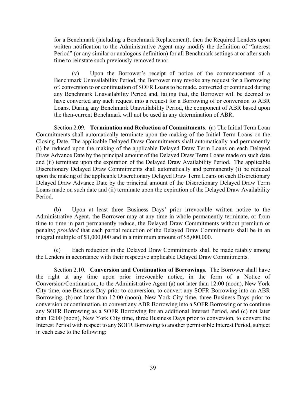 39 for a Benchmark (including a Benchmark Replacement), then the Required Lenders upon written notification to the Administrative Agent may modify the definition of “Interest Period” (or any similar or analogous definition) for all Benchmark settings at or after such time to reinstate such previously removed tenor. (v) Upon the Borrower’s receipt of notice of the commencement of a Benchmark Unavailability Period, the Borrower may revoke any request for a Borrowing of, conversion to or continuation of SOFR Loans to be made, converted or continued during any Benchmark Unavailability Period and, failing that, the Borrower will be deemed to have converted any such request into a request for a Borrowing of or conversion to ABR Loans. During any Benchmark Unavailability Period, the component of ABR based upon the then-current Benchmark will not be used in any determination of ABR. Section 2.09. Termination and Reduction of Commitments. (a) The Initial Term Loan Commitments shall automatically terminate upon the making of the Initial Term Loans on the Closing Date. The applicable Delayed Draw Commitments shall automatically and permanently (i) be reduced upon the making of the applicable Delayed Draw Term Loans on each Delayed Draw Advance Date by the principal amount of the Delayed Draw Term Loans made on such date and (ii) terminate upon the expiration of the Delayed Draw Availability Period. The applicable Discretionary Delayed Draw Commitments shall automatically and permanently (i) be reduced upon the making of the applicable Discretionary Delayed Draw Term Loans on each Discretionary Delayed Draw Advance Date by the principal amount of the Discretionary Delayed Draw Term Loans made on such date and (ii) terminate upon the expiration of the Delayed Draw Availability Period. (b) Upon at least three Business Days’ prior irrevocable written notice to the Administrative Agent, the Borrower may at any time in whole permanently terminate, or from time to time in part permanently reduce, the Delayed Draw Commitments without premium or penalty; provided that each partial reduction of the Delayed Draw Commitments shall be in an integral multiple of $1,000,000 and in a minimum amount of $5,000,000. (c) Each reduction in the Delayed Draw Commitments shall be made ratably among the Lenders in accordance with their respective applicable Delayed Draw Commitments. Section 2.10. Conversion and Continuation of Borrowings. The Borrower shall have the right at any time upon prior irrevocable notice, in the form of a Notice of Conversion/Continuation, to the Administrative Agent (a) not later than 12:00 (noon), New York City time, one Business Day prior to conversion, to convert any SOFR Borrowing into an ABR Borrowing, (b) not later than 12:00 (noon), New York City time, three Business Days prior to conversion or continuation, to convert any ABR Borrowing into a SOFR Borrowing or to continue any SOFR Borrowing as a SOFR Borrowing for an additional Interest Period, and (c) not later than 12:00 (noon), New York City time, three Business Days prior to conversion, to convert the Interest Period with respect to any SOFR Borrowing to another permissible Interest Period, subject in each case to the following: