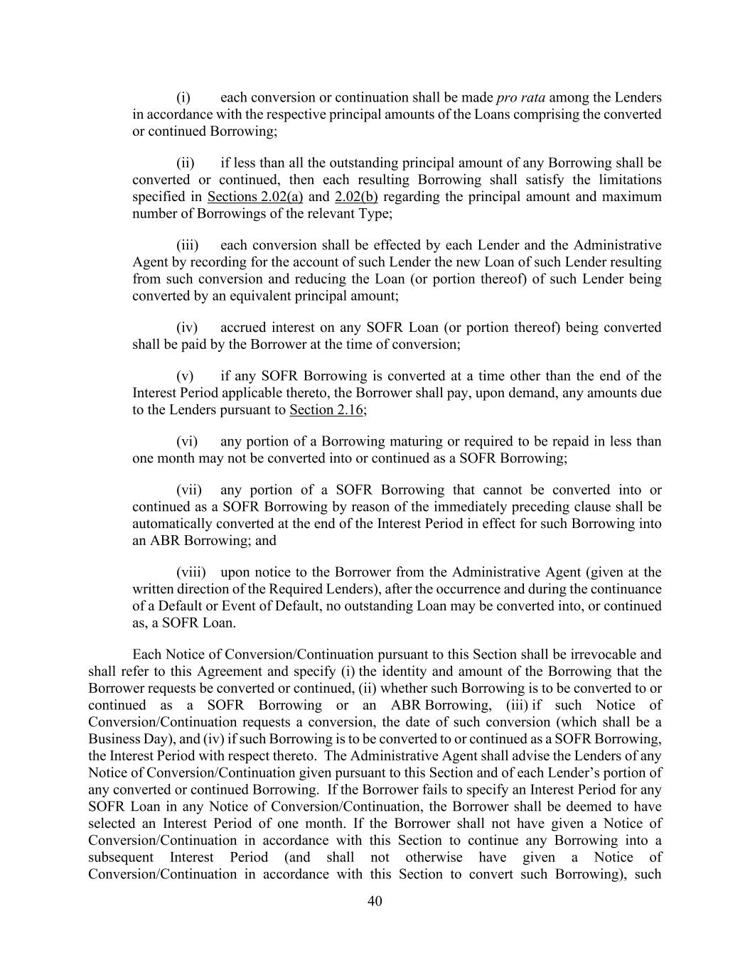 40 (i) each conversion or continuation shall be made pro rata among the Lenders in accordance with the respective principal amounts of the Loans comprising the converted or continued Borrowing; (ii) if less than all the outstanding principal amount of any Borrowing shall be converted or continued, then each resulting Borrowing shall satisfy the limitations specified in Sections 2.02(a) and 2.02(b) regarding the principal amount and maximum number of Borrowings of the relevant Type; (iii) each conversion shall be effected by each Lender and the Administrative Agent by recording for the account of such Lender the new Loan of such Lender resulting from such conversion and reducing the Loan (or portion thereof) of such Lender being converted by an equivalent principal amount; (iv) accrued interest on any SOFR Loan (or portion thereof) being converted shall be paid by the Borrower at the time of conversion; (v) if any SOFR Borrowing is converted at a time other than the end of the Interest Period applicable thereto, the Borrower shall pay, upon demand, any amounts due to the Lenders pursuant to Section 2.16; (vi) any portion of a Borrowing maturing or required to be repaid in less than one month may not be converted into or continued as a SOFR Borrowing; (vii) any portion of a SOFR Borrowing that cannot be converted into or continued as a SOFR Borrowing by reason of the immediately preceding clause shall be automatically converted at the end of the Interest Period in effect for such Borrowing into an ABR Borrowing; and (viii) upon notice to the Borrower from the Administrative Agent (given at the written direction of the Required Lenders), after the occurrence and during the continuance of a Default or Event of Default, no outstanding Loan may be converted into, or continued as, a SOFR Loan. Each Notice of Conversion/Continuation pursuant to this Section shall be irrevocable and shall refer to this Agreement and specify (i) the identity and amount of the Borrowing that the Borrower requests be converted or continued, (ii) whether such Borrowing is to be converted to or continued as a SOFR Borrowing or an ABR Borrowing, (iii) if such Notice of Conversion/Continuation requests a conversion, the date of such conversion (which shall be a Business Day), and (iv) if such Borrowing is to be converted to or continued as a SOFR Borrowing, the Interest Period with respect thereto. The Administrative Agent shall advise the Lenders of any Notice of Conversion/Continuation given pursuant to this Section and of each Lender’s portion of any converted or continued Borrowing. If the Borrower fails to specify an Interest Period for any SOFR Loan in any Notice of Conversion/Continuation, the Borrower shall be deemed to have selected an Interest Period of one month. If the Borrower shall not have given a Notice of Conversion/Continuation in accordance with this Section to continue any Borrowing into a subsequent Interest Period (and shall not otherwise have given a Notice of Conversion/Continuation in accordance with this Section to convert such Borrowing), such