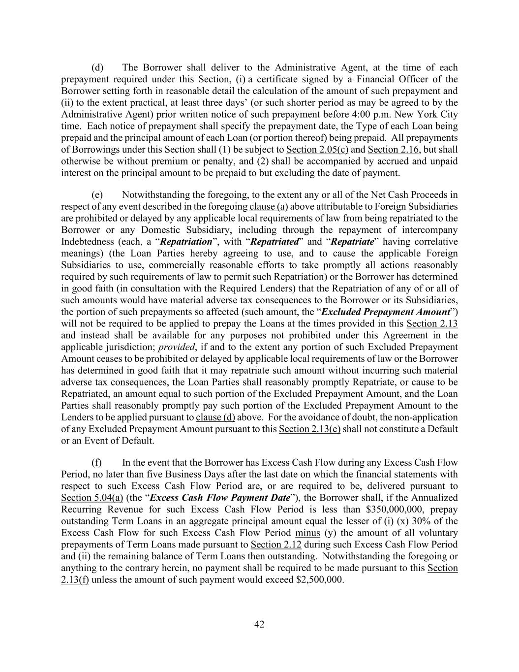 42 (d) The Borrower shall deliver to the Administrative Agent, at the time of each prepayment required under this Section, (i) a certificate signed by a Financial Officer of the Borrower setting forth in reasonable detail the calculation of the amount of such prepayment and (ii) to the extent practical, at least three days’ (or such shorter period as may be agreed to by the Administrative Agent) prior written notice of such prepayment before 4:00 p.m. New York City time. Each notice of prepayment shall specify the prepayment date, the Type of each Loan being prepaid and the principal amount of each Loan (or portion thereof) being prepaid. All prepayments of Borrowings under this Section shall (1) be subject to Section 2.05(c) and Section 2.16, but shall otherwise be without premium or penalty, and (2) shall be accompanied by accrued and unpaid interest on the principal amount to be prepaid to but excluding the date of payment. (e) Notwithstanding the foregoing, to the extent any or all of the Net Cash Proceeds in respect of any event described in the foregoing clause (a) above attributable to Foreign Subsidiaries are prohibited or delayed by any applicable local requirements of law from being repatriated to the Borrower or any Domestic Subsidiary, including through the repayment of intercompany Indebtedness (each, a “Repatriation”, with “Repatriated” and “Repatriate” having correlative meanings) (the Loan Parties hereby agreeing to use, and to cause the applicable Foreign Subsidiaries to use, commercially reasonable efforts to take promptly all actions reasonably required by such requirements of law to permit such Repatriation) or the Borrower has determined in good faith (in consultation with the Required Lenders) that the Repatriation of any of or all of such amounts would have material adverse tax consequences to the Borrower or its Subsidiaries, the portion of such prepayments so affected (such amount, the “Excluded Prepayment Amount”) will not be required to be applied to prepay the Loans at the times provided in this Section 2.13 and instead shall be available for any purposes not prohibited under this Agreement in the applicable jurisdiction; provided, if and to the extent any portion of such Excluded Prepayment Amount ceases to be prohibited or delayed by applicable local requirements of law or the Borrower has determined in good faith that it may repatriate such amount without incurring such material adverse tax consequences, the Loan Parties shall reasonably promptly Repatriate, or cause to be Repatriated, an amount equal to such portion of the Excluded Prepayment Amount, and the Loan Parties shall reasonably promptly pay such portion of the Excluded Prepayment Amount to the Lenders to be applied pursuant to clause (d) above. For the avoidance of doubt, the non-application of any Excluded Prepayment Amount pursuant to this Section 2.13(e) shall not constitute a Default or an Event of Default. (f) In the event that the Borrower has Excess Cash Flow during any Excess Cash Flow Period, no later than five Business Days after the last date on which the financial statements with respect to such Excess Cash Flow Period are, or are required to be, delivered pursuant to Section 5.04(a) (the “Excess Cash Flow Payment Date”), the Borrower shall, if the Annualized Recurring Revenue for such Excess Cash Flow Period is less than $350,000,000, prepay outstanding Term Loans in an aggregate principal amount equal the lesser of (i) (x) 30% of the Excess Cash Flow for such Excess Cash Flow Period minus (y) the amount of all voluntary prepayments of Term Loans made pursuant to Section 2.12 during such Excess Cash Flow Period and (ii) the remaining balance of Term Loans then outstanding. Notwithstanding the foregoing or anything to the contrary herein, no payment shall be required to be made pursuant to this Section 2.13(f) unless the amount of such payment would exceed $2,500,000.