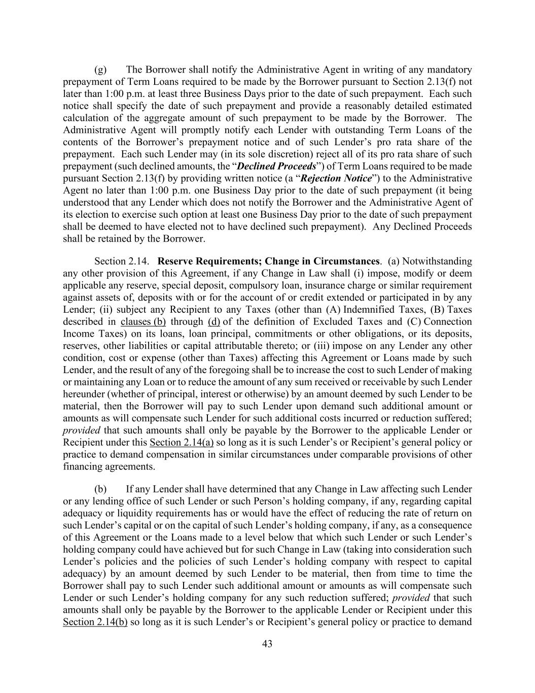 43 (g) The Borrower shall notify the Administrative Agent in writing of any mandatory prepayment of Term Loans required to be made by the Borrower pursuant to Section 2.13(f) not later than 1:00 p.m. at least three Business Days prior to the date of such prepayment. Each such notice shall specify the date of such prepayment and provide a reasonably detailed estimated calculation of the aggregate amount of such prepayment to be made by the Borrower. The Administrative Agent will promptly notify each Lender with outstanding Term Loans of the contents of the Borrower’s prepayment notice and of such Lender’s pro rata share of the prepayment. Each such Lender may (in its sole discretion) reject all of its pro rata share of such prepayment (such declined amounts, the “Declined Proceeds”) of Term Loans required to be made pursuant Section 2.13(f) by providing written notice (a “Rejection Notice”) to the Administrative Agent no later than 1:00 p.m. one Business Day prior to the date of such prepayment (it being understood that any Lender which does not notify the Borrower and the Administrative Agent of its election to exercise such option at least one Business Day prior to the date of such prepayment shall be deemed to have elected not to have declined such prepayment). Any Declined Proceeds shall be retained by the Borrower. Section 2.14. Reserve Requirements; Change in Circumstances. (a) Notwithstanding any other provision of this Agreement, if any Change in Law shall (i) impose, modify or deem applicable any reserve, special deposit, compulsory loan, insurance charge or similar requirement against assets of, deposits with or for the account of or credit extended or participated in by any Lender; (ii) subject any Recipient to any Taxes (other than (A) Indemnified Taxes, (B) Taxes described in clauses (b) through (d) of the definition of Excluded Taxes and (C) Connection Income Taxes) on its loans, loan principal, commitments or other obligations, or its deposits, reserves, other liabilities or capital attributable thereto; or (iii) impose on any Lender any other condition, cost or expense (other than Taxes) affecting this Agreement or Loans made by such Lender, and the result of any of the foregoing shall be to increase the cost to such Lender of making or maintaining any Loan or to reduce the amount of any sum received or receivable by such Lender hereunder (whether of principal, interest or otherwise) by an amount deemed by such Lender to be material, then the Borrower will pay to such Lender upon demand such additional amount or amounts as will compensate such Lender for such additional costs incurred or reduction suffered; provided that such amounts shall only be payable by the Borrower to the applicable Lender or Recipient under this Section 2.14(a) so long as it is such Lender’s or Recipient’s general policy or practice to demand compensation in similar circumstances under comparable provisions of other financing agreements. (b) If any Lender shall have determined that any Change in Law affecting such Lender or any lending office of such Lender or such Person’s holding company, if any, regarding capital adequacy or liquidity requirements has or would have the effect of reducing the rate of return on such Lender’s capital or on the capital of such Lender’s holding company, if any, as a consequence of this Agreement or the Loans made to a level below that which such Lender or such Lender’s holding company could have achieved but for such Change in Law (taking into consideration such Lender’s policies and the policies of such Lender’s holding company with respect to capital adequacy) by an amount deemed by such Lender to be material, then from time to time the Borrower shall pay to such Lender such additional amount or amounts as will compensate such Lender or such Lender’s holding company for any such reduction suffered; provided that such amounts shall only be payable by the Borrower to the applicable Lender or Recipient under this Section 2.14(b) so long as it is such Lender’s or Recipient’s general policy or practice to demand