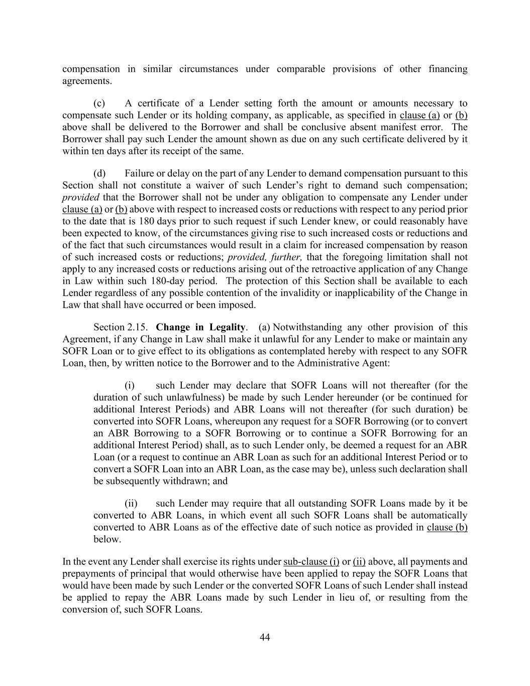 44 compensation in similar circumstances under comparable provisions of other financing agreements. (c) A certificate of a Lender setting forth the amount or amounts necessary to compensate such Lender or its holding company, as applicable, as specified in clause (a) or (b) above shall be delivered to the Borrower and shall be conclusive absent manifest error. The Borrower shall pay such Lender the amount shown as due on any such certificate delivered by it within ten days after its receipt of the same. (d) Failure or delay on the part of any Lender to demand compensation pursuant to this Section shall not constitute a waiver of such Lender’s right to demand such compensation; provided that the Borrower shall not be under any obligation to compensate any Lender under clause (a) or (b) above with respect to increased costs or reductions with respect to any period prior to the date that is 180 days prior to such request if such Lender knew, or could reasonably have been expected to know, of the circumstances giving rise to such increased costs or reductions and of the fact that such circumstances would result in a claim for increased compensation by reason of such increased costs or reductions; provided, further, that the foregoing limitation shall not apply to any increased costs or reductions arising out of the retroactive application of any Change in Law within such 180-day period. The protection of this Section shall be available to each Lender regardless of any possible contention of the invalidity or inapplicability of the Change in Law that shall have occurred or been imposed. Section 2.15. Change in Legality. (a) Notwithstanding any other provision of this Agreement, if any Change in Law shall make it unlawful for any Lender to make or maintain any SOFR Loan or to give effect to its obligations as contemplated hereby with respect to any SOFR Loan, then, by written notice to the Borrower and to the Administrative Agent: (i) such Lender may declare that SOFR Loans will not thereafter (for the duration of such unlawfulness) be made by such Lender hereunder (or be continued for additional Interest Periods) and ABR Loans will not thereafter (for such duration) be converted into SOFR Loans, whereupon any request for a SOFR Borrowing (or to convert an ABR Borrowing to a SOFR Borrowing or to continue a SOFR Borrowing for an additional Interest Period) shall, as to such Lender only, be deemed a request for an ABR Loan (or a request to continue an ABR Loan as such for an additional Interest Period or to convert a SOFR Loan into an ABR Loan, as the case may be), unless such declaration shall be subsequently withdrawn; and (ii) such Lender may require that all outstanding SOFR Loans made by it be converted to ABR Loans, in which event all such SOFR Loans shall be automatically converted to ABR Loans as of the effective date of such notice as provided in clause (b) below. In the event any Lender shall exercise its rights under sub-clause (i) or (ii) above, all payments and prepayments of principal that would otherwise have been applied to repay the SOFR Loans that would have been made by such Lender or the converted SOFR Loans of such Lender shall instead be applied to repay the ABR Loans made by such Lender in lieu of, or resulting from the conversion of, such SOFR Loans.