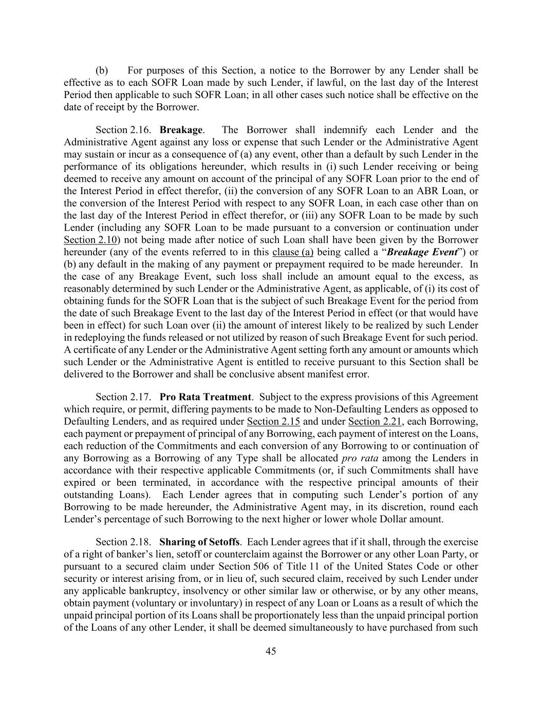 45 (b) For purposes of this Section, a notice to the Borrower by any Lender shall be effective as to each SOFR Loan made by such Lender, if lawful, on the last day of the Interest Period then applicable to such SOFR Loan; in all other cases such notice shall be effective on the date of receipt by the Borrower. Section 2.16. Breakage. The Borrower shall indemnify each Lender and the Administrative Agent against any loss or expense that such Lender or the Administrative Agent may sustain or incur as a consequence of (a) any event, other than a default by such Lender in the performance of its obligations hereunder, which results in (i) such Lender receiving or being deemed to receive any amount on account of the principal of any SOFR Loan prior to the end of the Interest Period in effect therefor, (ii) the conversion of any SOFR Loan to an ABR Loan, or the conversion of the Interest Period with respect to any SOFR Loan, in each case other than on the last day of the Interest Period in effect therefor, or (iii) any SOFR Loan to be made by such Lender (including any SOFR Loan to be made pursuant to a conversion or continuation under Section 2.10) not being made after notice of such Loan shall have been given by the Borrower hereunder (any of the events referred to in this clause (a) being called a “Breakage Event”) or (b) any default in the making of any payment or prepayment required to be made hereunder. In the case of any Breakage Event, such loss shall include an amount equal to the excess, as reasonably determined by such Lender or the Administrative Agent, as applicable, of (i) its cost of obtaining funds for the SOFR Loan that is the subject of such Breakage Event for the period from the date of such Breakage Event to the last day of the Interest Period in effect (or that would have been in effect) for such Loan over (ii) the amount of interest likely to be realized by such Lender in redeploying the funds released or not utilized by reason of such Breakage Event for such period. A certificate of any Lender or the Administrative Agent setting forth any amount or amounts which such Lender or the Administrative Agent is entitled to receive pursuant to this Section shall be delivered to the Borrower and shall be conclusive absent manifest error. Section 2.17. Pro Rata Treatment. Subject to the express provisions of this Agreement which require, or permit, differing payments to be made to Non-Defaulting Lenders as opposed to Defaulting Lenders, and as required under Section 2.15 and under Section 2.21, each Borrowing, each payment or prepayment of principal of any Borrowing, each payment of interest on the Loans, each reduction of the Commitments and each conversion of any Borrowing to or continuation of any Borrowing as a Borrowing of any Type shall be allocated pro rata among the Lenders in accordance with their respective applicable Commitments (or, if such Commitments shall have expired or been terminated, in accordance with the respective principal amounts of their outstanding Loans). Each Lender agrees that in computing such Lender’s portion of any Borrowing to be made hereunder, the Administrative Agent may, in its discretion, round each Lender’s percentage of such Borrowing to the next higher or lower whole Dollar amount. Section 2.18. Sharing of Setoffs. Each Lender agrees that if it shall, through the exercise of a right of banker’s lien, setoff or counterclaim against the Borrower or any other Loan Party, or pursuant to a secured claim under Section 506 of Title 11 of the United States Code or other security or interest arising from, or in lieu of, such secured claim, received by such Lender under any applicable bankruptcy, insolvency or other similar law or otherwise, or by any other means, obtain payment (voluntary or involuntary) in respect of any Loan or Loans as a result of which the unpaid principal portion of its Loans shall be proportionately less than the unpaid principal portion of the Loans of any other Lender, it shall be deemed simultaneously to have purchased from such