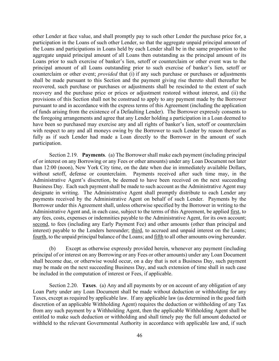 46 other Lender at face value, and shall promptly pay to such other Lender the purchase price for, a participation in the Loans of such other Lender, so that the aggregate unpaid principal amount of the Loans and participations in Loans held by each Lender shall be in the same proportion to the aggregate unpaid principal amount of all Loans then outstanding as the principal amount of its Loans prior to such exercise of banker’s lien, setoff or counterclaim or other event was to the principal amount of all Loans outstanding prior to such exercise of banker’s lien, setoff or counterclaim or other event; provided that (i) if any such purchase or purchases or adjustments shall be made pursuant to this Section and the payment giving rise thereto shall thereafter be recovered, such purchase or purchases or adjustments shall be rescinded to the extent of such recovery and the purchase price or prices or adjustment restored without interest, and (ii) the provisions of this Section shall not be construed to apply to any payment made by the Borrower pursuant to and in accordance with the express terms of this Agreement (including the application of funds arising from the existence of a Defaulting Lender). The Borrower expressly consents to the foregoing arrangements and agree that any Lender holding a participation in a Loan deemed to have been so purchased may exercise any and all rights of banker’s lien, setoff or counterclaim with respect to any and all moneys owing by the Borrower to such Lender by reason thereof as fully as if such Lender had made a Loan directly to the Borrower in the amount of such participation. Section 2.19. Payments. (a) The Borrower shall make each payment (including principal of or interest on any Borrowing or any Fees or other amounts) under any Loan Document not later than 12:00 (noon), New York City time, on the date when due in immediately available Dollars, without setoff, defense or counterclaim. Payments received after such time may, in the Administrative Agent’s discretion, be deemed to have been received on the next succeeding Business Day. Each such payment shall be made to such account as the Administrative Agent may designate in writing. The Administrative Agent shall promptly distribute to each Lender any payments received by the Administrative Agent on behalf of such Lender. Payments by the Borrower under this Agreement shall, unless otherwise specified by the Borrower in writing to the Administrative Agent and, in each case, subject to the terms of this Agreement, be applied first, to any fees, costs, expenses or indemnities payable to the Administrative Agent, for its own account; second, to fees (including any Early Payment Fee) and other amounts (other than principal and interest) payable to the Lenders hereunder; third, to accrued and unpaid interest on the Loans; fourth, to the unpaid principal balance of the Loans; and fifth to all other amounts owing hereunder. (b) Except as otherwise expressly provided herein, whenever any payment (including principal of or interest on any Borrowing or any Fees or other amounts) under any Loan Document shall become due, or otherwise would occur, on a day that is not a Business Day, such payment may be made on the next succeeding Business Day, and such extension of time shall in such case be included in the computation of interest or Fees, if applicable. Section 2.20. Taxes. (a) Any and all payments by or on account of any obligation of any Loan Party under any Loan Document shall be made without deduction or withholding for any Taxes, except as required by applicable law. If any applicable law (as determined in the good faith discretion of an applicable Withholding Agent) requires the deduction or withholding of any Tax from any such payment by a Withholding Agent, then the applicable Withholding Agent shall be entitled to make such deduction or withholding and shall timely pay the full amount deducted or withheld to the relevant Governmental Authority in accordance with applicable law and, if such