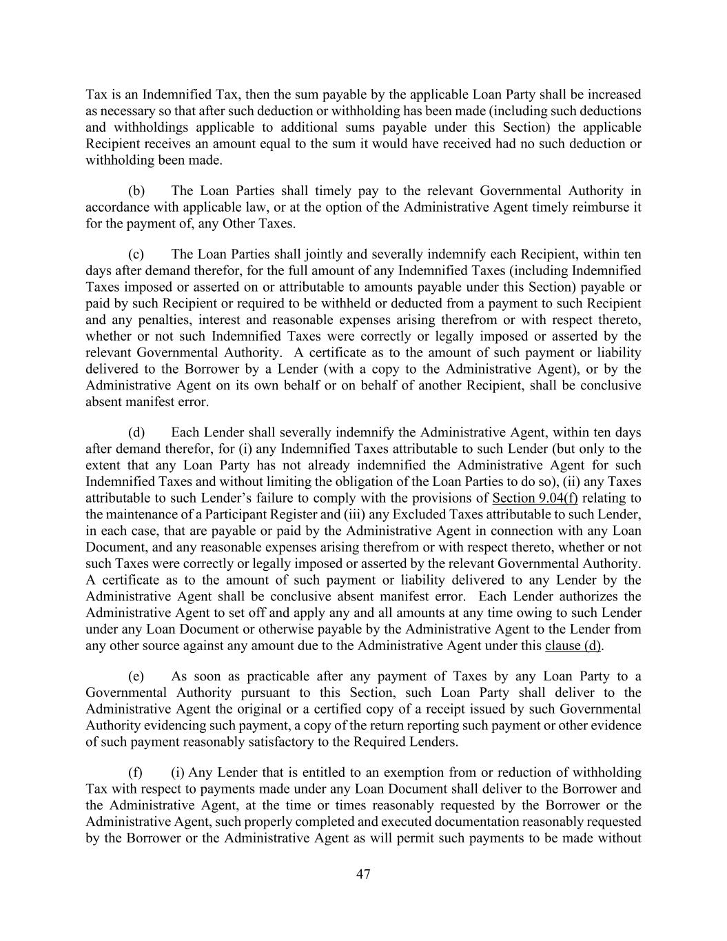 47 Tax is an Indemnified Tax, then the sum payable by the applicable Loan Party shall be increased as necessary so that after such deduction or withholding has been made (including such deductions and withholdings applicable to additional sums payable under this Section) the applicable Recipient receives an amount equal to the sum it would have received had no such deduction or withholding been made. (b) The Loan Parties shall timely pay to the relevant Governmental Authority in accordance with applicable law, or at the option of the Administrative Agent timely reimburse it for the payment of, any Other Taxes. (c) The Loan Parties shall jointly and severally indemnify each Recipient, within ten days after demand therefor, for the full amount of any Indemnified Taxes (including Indemnified Taxes imposed or asserted on or attributable to amounts payable under this Section) payable or paid by such Recipient or required to be withheld or deducted from a payment to such Recipient and any penalties, interest and reasonable expenses arising therefrom or with respect thereto, whether or not such Indemnified Taxes were correctly or legally imposed or asserted by the relevant Governmental Authority. A certificate as to the amount of such payment or liability delivered to the Borrower by a Lender (with a copy to the Administrative Agent), or by the Administrative Agent on its own behalf or on behalf of another Recipient, shall be conclusive absent manifest error. (d) Each Lender shall severally indemnify the Administrative Agent, within ten days after demand therefor, for (i) any Indemnified Taxes attributable to such Lender (but only to the extent that any Loan Party has not already indemnified the Administrative Agent for such Indemnified Taxes and without limiting the obligation of the Loan Parties to do so), (ii) any Taxes attributable to such Lender’s failure to comply with the provisions of Section 9.04(f) relating to the maintenance of a Participant Register and (iii) any Excluded Taxes attributable to such Lender, in each case, that are payable or paid by the Administrative Agent in connection with any Loan Document, and any reasonable expenses arising therefrom or with respect thereto, whether or not such Taxes were correctly or legally imposed or asserted by the relevant Governmental Authority. A certificate as to the amount of such payment or liability delivered to any Lender by the Administrative Agent shall be conclusive absent manifest error. Each Lender authorizes the Administrative Agent to set off and apply any and all amounts at any time owing to such Lender under any Loan Document or otherwise payable by the Administrative Agent to the Lender from any other source against any amount due to the Administrative Agent under this clause (d). (e) As soon as practicable after any payment of Taxes by any Loan Party to a Governmental Authority pursuant to this Section, such Loan Party shall deliver to the Administrative Agent the original or a certified copy of a receipt issued by such Governmental Authority evidencing such payment, a copy of the return reporting such payment or other evidence of such payment reasonably satisfactory to the Required Lenders. (f) (i) Any Lender that is entitled to an exemption from or reduction of withholding Tax with respect to payments made under any Loan Document shall deliver to the Borrower and the Administrative Agent, at the time or times reasonably requested by the Borrower or the Administrative Agent, such properly completed and executed documentation reasonably requested by the Borrower or the Administrative Agent as will permit such payments to be made without