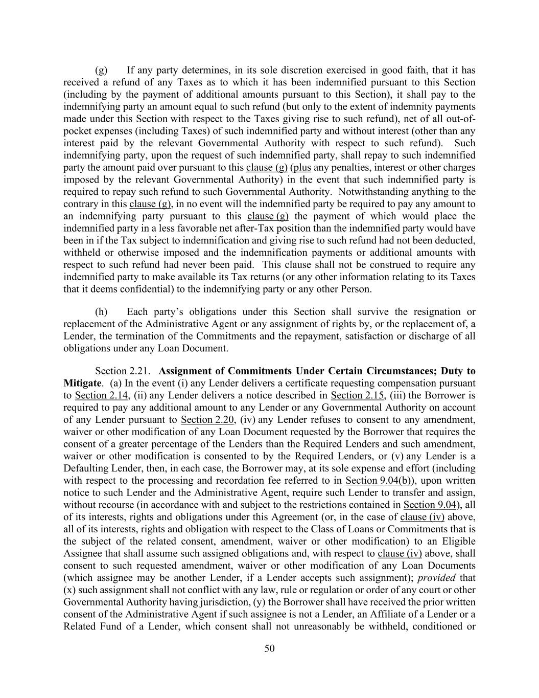 50 (g) If any party determines, in its sole discretion exercised in good faith, that it has received a refund of any Taxes as to which it has been indemnified pursuant to this Section (including by the payment of additional amounts pursuant to this Section), it shall pay to the indemnifying party an amount equal to such refund (but only to the extent of indemnity payments made under this Section with respect to the Taxes giving rise to such refund), net of all out-of- pocket expenses (including Taxes) of such indemnified party and without interest (other than any interest paid by the relevant Governmental Authority with respect to such refund). Such indemnifying party, upon the request of such indemnified party, shall repay to such indemnified party the amount paid over pursuant to this clause (g) (plus any penalties, interest or other charges imposed by the relevant Governmental Authority) in the event that such indemnified party is required to repay such refund to such Governmental Authority. Notwithstanding anything to the contrary in this clause (g), in no event will the indemnified party be required to pay any amount to an indemnifying party pursuant to this clause (g) the payment of which would place the indemnified party in a less favorable net after-Tax position than the indemnified party would have been in if the Tax subject to indemnification and giving rise to such refund had not been deducted, withheld or otherwise imposed and the indemnification payments or additional amounts with respect to such refund had never been paid. This clause shall not be construed to require any indemnified party to make available its Tax returns (or any other information relating to its Taxes that it deems confidential) to the indemnifying party or any other Person. (h) Each party’s obligations under this Section shall survive the resignation or replacement of the Administrative Agent or any assignment of rights by, or the replacement of, a Lender, the termination of the Commitments and the repayment, satisfaction or discharge of all obligations under any Loan Document. Section 2.21. Assignment of Commitments Under Certain Circumstances; Duty to Mitigate. (a) In the event (i) any Lender delivers a certificate requesting compensation pursuant to Section 2.14, (ii) any Lender delivers a notice described in Section 2.15, (iii) the Borrower is required to pay any additional amount to any Lender or any Governmental Authority on account of any Lender pursuant to Section 2.20, (iv) any Lender refuses to consent to any amendment, waiver or other modification of any Loan Document requested by the Borrower that requires the consent of a greater percentage of the Lenders than the Required Lenders and such amendment, waiver or other modification is consented to by the Required Lenders, or (v) any Lender is a Defaulting Lender, then, in each case, the Borrower may, at its sole expense and effort (including with respect to the processing and recordation fee referred to in Section 9.04(b)), upon written notice to such Lender and the Administrative Agent, require such Lender to transfer and assign, without recourse (in accordance with and subject to the restrictions contained in Section 9.04), all of its interests, rights and obligations under this Agreement (or, in the case of clause (iv) above, all of its interests, rights and obligation with respect to the Class of Loans or Commitments that is the subject of the related consent, amendment, waiver or other modification) to an Eligible Assignee that shall assume such assigned obligations and, with respect to clause (iv) above, shall consent to such requested amendment, waiver or other modification of any Loan Documents (which assignee may be another Lender, if a Lender accepts such assignment); provided that (x) such assignment shall not conflict with any law, rule or regulation or order of any court or other Governmental Authority having jurisdiction, (y) the Borrower shall have received the prior written consent of the Administrative Agent if such assignee is not a Lender, an Affiliate of a Lender or a Related Fund of a Lender, which consent shall not unreasonably be withheld, conditioned or