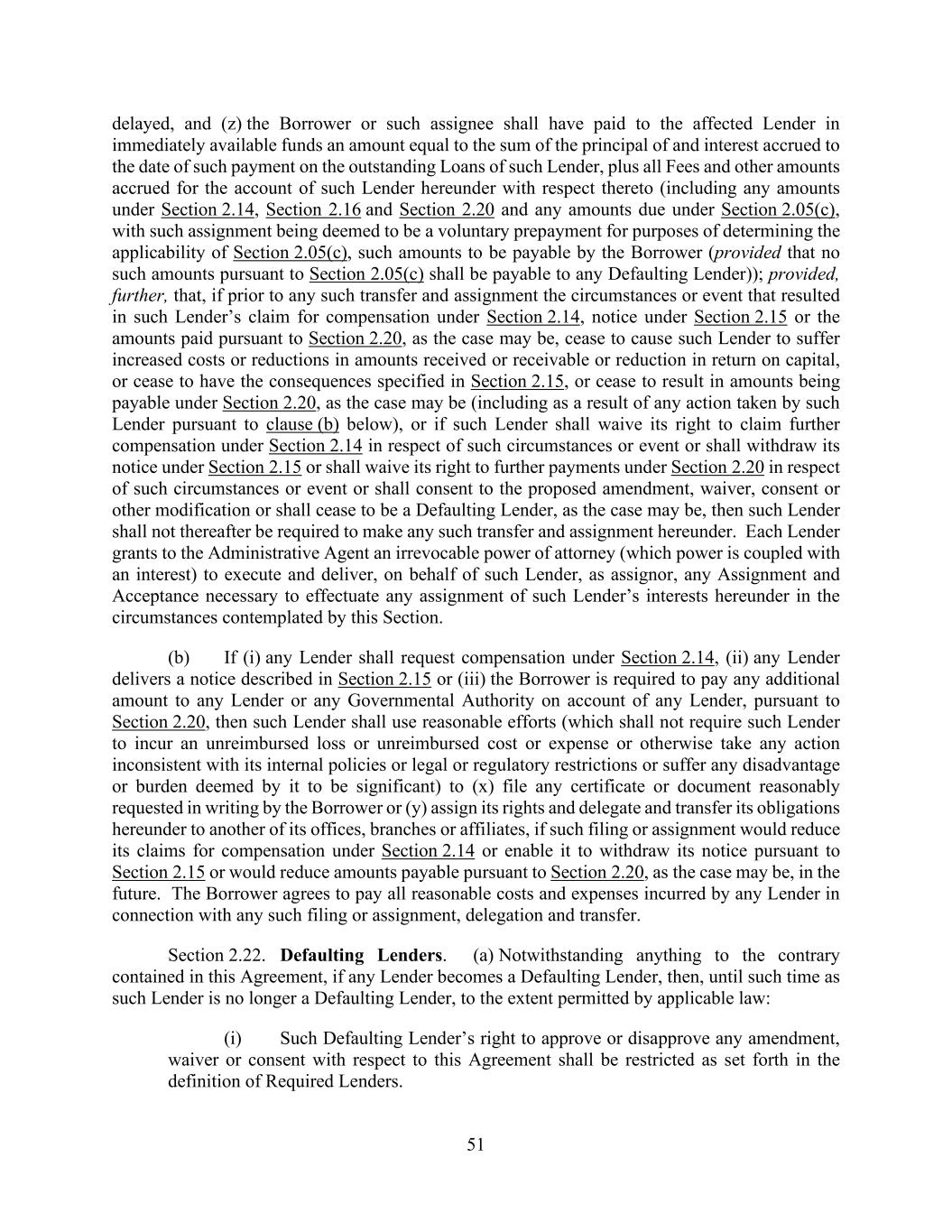 51 delayed, and (z) the Borrower or such assignee shall have paid to the affected Lender in immediately available funds an amount equal to the sum of the principal of and interest accrued to the date of such payment on the outstanding Loans of such Lender, plus all Fees and other amounts accrued for the account of such Lender hereunder with respect thereto (including any amounts under Section 2.14, Section 2.16 and Section 2.20 and any amounts due under Section 2.05(c), with such assignment being deemed to be a voluntary prepayment for purposes of determining the applicability of Section 2.05(c), such amounts to be payable by the Borrower (provided that no such amounts pursuant to Section 2.05(c) shall be payable to any Defaulting Lender)); provided, further, that, if prior to any such transfer and assignment the circumstances or event that resulted in such Lender’s claim for compensation under Section 2.14, notice under Section 2.15 or the amounts paid pursuant to Section 2.20, as the case may be, cease to cause such Lender to suffer increased costs or reductions in amounts received or receivable or reduction in return on capital, or cease to have the consequences specified in Section 2.15, or cease to result in amounts being payable under Section 2.20, as the case may be (including as a result of any action taken by such Lender pursuant to clause (b) below), or if such Lender shall waive its right to claim further compensation under Section 2.14 in respect of such circumstances or event or shall withdraw its notice under Section 2.15 or shall waive its right to further payments under Section 2.20 in respect of such circumstances or event or shall consent to the proposed amendment, waiver, consent or other modification or shall cease to be a Defaulting Lender, as the case may be, then such Lender shall not thereafter be required to make any such transfer and assignment hereunder. Each Lender grants to the Administrative Agent an irrevocable power of attorney (which power is coupled with an interest) to execute and deliver, on behalf of such Lender, as assignor, any Assignment and Acceptance necessary to effectuate any assignment of such Lender’s interests hereunder in the circumstances contemplated by this Section. (b) If (i) any Lender shall request compensation under Section 2.14, (ii) any Lender delivers a notice described in Section 2.15 or (iii) the Borrower is required to pay any additional amount to any Lender or any Governmental Authority on account of any Lender, pursuant to Section 2.20, then such Lender shall use reasonable efforts (which shall not require such Lender to incur an unreimbursed loss or unreimbursed cost or expense or otherwise take any action inconsistent with its internal policies or legal or regulatory restrictions or suffer any disadvantage or burden deemed by it to be significant) to (x) file any certificate or document reasonably requested in writing by the Borrower or (y) assign its rights and delegate and transfer its obligations hereunder to another of its offices, branches or affiliates, if such filing or assignment would reduce its claims for compensation under Section 2.14 or enable it to withdraw its notice pursuant to Section 2.15 or would reduce amounts payable pursuant to Section 2.20, as the case may be, in the future. The Borrower agrees to pay all reasonable costs and expenses incurred by any Lender in connection with any such filing or assignment, delegation and transfer. Section 2.22. Defaulting Lenders. (a) Notwithstanding anything to the contrary contained in this Agreement, if any Lender becomes a Defaulting Lender, then, until such time as such Lender is no longer a Defaulting Lender, to the extent permitted by applicable law: (i) Such Defaulting Lender’s right to approve or disapprove any amendment, waiver or consent with respect to this Agreement shall be restricted as set forth in the definition of Required Lenders.