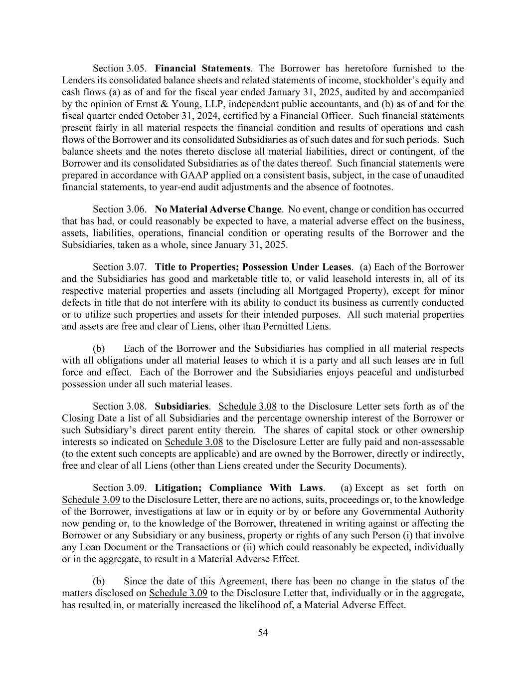 54 Section 3.05. Financial Statements. The Borrower has heretofore furnished to the Lenders its consolidated balance sheets and related statements of income, stockholder’s equity and cash flows (a) as of and for the fiscal year ended January 31, 2025, audited by and accompanied by the opinion of Ernst & Young, LLP, independent public accountants, and (b) as of and for the fiscal quarter ended October 31, 2024, certified by a Financial Officer. Such financial statements present fairly in all material respects the financial condition and results of operations and cash flows of the Borrower and its consolidated Subsidiaries as of such dates and for such periods. Such balance sheets and the notes thereto disclose all material liabilities, direct or contingent, of the Borrower and its consolidated Subsidiaries as of the dates thereof. Such financial statements were prepared in accordance with GAAP applied on a consistent basis, subject, in the case of unaudited financial statements, to year-end audit adjustments and the absence of footnotes. Section 3.06. No Material Adverse Change. No event, change or condition has occurred that has had, or could reasonably be expected to have, a material adverse effect on the business, assets, liabilities, operations, financial condition or operating results of the Borrower and the Subsidiaries, taken as a whole, since January 31, 2025. Section 3.07. Title to Properties; Possession Under Leases. (a) Each of the Borrower and the Subsidiaries has good and marketable title to, or valid leasehold interests in, all of its respective material properties and assets (including all Mortgaged Property), except for minor defects in title that do not interfere with its ability to conduct its business as currently conducted or to utilize such properties and assets for their intended purposes. All such material properties and assets are free and clear of Liens, other than Permitted Liens. (b) Each of the Borrower and the Subsidiaries has complied in all material respects with all obligations under all material leases to which it is a party and all such leases are in full force and effect. Each of the Borrower and the Subsidiaries enjoys peaceful and undisturbed possession under all such material leases. Section 3.08. Subsidiaries. Schedule 3.08 to the Disclosure Letter sets forth as of the Closing Date a list of all Subsidiaries and the percentage ownership interest of the Borrower or such Subsidiary’s direct parent entity therein. The shares of capital stock or other ownership interests so indicated on Schedule 3.08 to the Disclosure Letter are fully paid and non-assessable (to the extent such concepts are applicable) and are owned by the Borrower, directly or indirectly, free and clear of all Liens (other than Liens created under the Security Documents). Section 3.09. Litigation; Compliance With Laws. (a) Except as set forth on Schedule 3.09 to the Disclosure Letter, there are no actions, suits, proceedings or, to the knowledge of the Borrower, investigations at law or in equity or by or before any Governmental Authority now pending or, to the knowledge of the Borrower, threatened in writing against or affecting the Borrower or any Subsidiary or any business, property or rights of any such Person (i) that involve any Loan Document or the Transactions or (ii) which could reasonably be expected, individually or in the aggregate, to result in a Material Adverse Effect. (b) Since the date of this Agreement, there has been no change in the status of the matters disclosed on Schedule 3.09 to the Disclosure Letter that, individually or in the aggregate, has resulted in, or materially increased the likelihood of, a Material Adverse Effect.