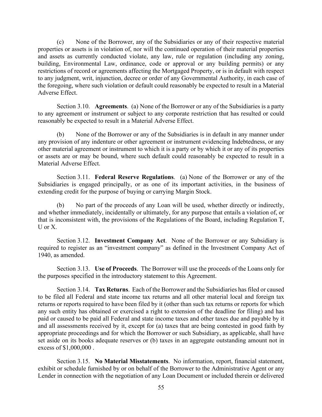 55 (c) None of the Borrower, any of the Subsidiaries or any of their respective material properties or assets is in violation of, nor will the continued operation of their material properties and assets as currently conducted violate, any law, rule or regulation (including any zoning, building, Environmental Law, ordinance, code or approval or any building permits) or any restrictions of record or agreements affecting the Mortgaged Property, or is in default with respect to any judgment, writ, injunction, decree or order of any Governmental Authority, in each case of the foregoing, where such violation or default could reasonably be expected to result in a Material Adverse Effect. Section 3.10. Agreements. (a) None of the Borrower or any of the Subsidiaries is a party to any agreement or instrument or subject to any corporate restriction that has resulted or could reasonably be expected to result in a Material Adverse Effect. (b) None of the Borrower or any of the Subsidiaries is in default in any manner under any provision of any indenture or other agreement or instrument evidencing Indebtedness, or any other material agreement or instrument to which it is a party or by which it or any of its properties or assets are or may be bound, where such default could reasonably be expected to result in a Material Adverse Effect. Section 3.11. Federal Reserve Regulations. (a) None of the Borrower or any of the Subsidiaries is engaged principally, or as one of its important activities, in the business of extending credit for the purpose of buying or carrying Margin Stock. (b) No part of the proceeds of any Loan will be used, whether directly or indirectly, and whether immediately, incidentally or ultimately, for any purpose that entails a violation of, or that is inconsistent with, the provisions of the Regulations of the Board, including Regulation T, U or X. Section 3.12. Investment Company Act. None of the Borrower or any Subsidiary is required to register as an “investment company” as defined in the Investment Company Act of 1940, as amended. Section 3.13. Use of Proceeds. The Borrower will use the proceeds of the Loans only for the purposes specified in the introductory statement to this Agreement. Section 3.14. Tax Returns. Each of the Borrower and the Subsidiaries has filed or caused to be filed all Federal and state income tax returns and all other material local and foreign tax returns or reports required to have been filed by it (other than such tax returns or reports for which any such entity has obtained or exercised a right to extension of the deadline for filing) and has paid or caused to be paid all Federal and state income taxes and other taxes due and payable by it and all assessments received by it, except for (a) taxes that are being contested in good faith by appropriate proceedings and for which the Borrower or such Subsidiary, as applicable, shall have set aside on its books adequate reserves or (b) taxes in an aggregate outstanding amount not in excess of $1,000,000 . Section 3.15. No Material Misstatements. No information, report, financial statement, exhibit or schedule furnished by or on behalf of the Borrower to the Administrative Agent or any Lender in connection with the negotiation of any Loan Document or included therein or delivered