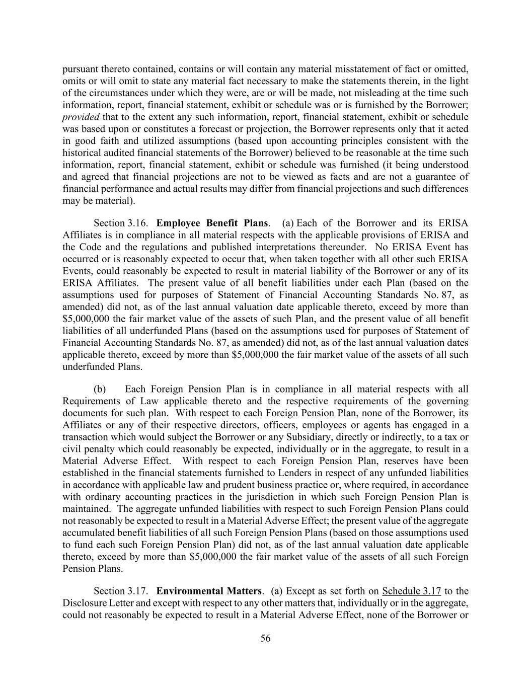 56 pursuant thereto contained, contains or will contain any material misstatement of fact or omitted, omits or will omit to state any material fact necessary to make the statements therein, in the light of the circumstances under which they were, are or will be made, not misleading at the time such information, report, financial statement, exhibit or schedule was or is furnished by the Borrower; provided that to the extent any such information, report, financial statement, exhibit or schedule was based upon or constitutes a forecast or projection, the Borrower represents only that it acted in good faith and utilized assumptions (based upon accounting principles consistent with the historical audited financial statements of the Borrower) believed to be reasonable at the time such information, report, financial statement, exhibit or schedule was furnished (it being understood and agreed that financial projections are not to be viewed as facts and are not a guarantee of financial performance and actual results may differ from financial projections and such differences may be material). Section 3.16. Employee Benefit Plans. (a) Each of the Borrower and its ERISA Affiliates is in compliance in all material respects with the applicable provisions of ERISA and the Code and the regulations and published interpretations thereunder. No ERISA Event has occurred or is reasonably expected to occur that, when taken together with all other such ERISA Events, could reasonably be expected to result in material liability of the Borrower or any of its ERISA Affiliates. The present value of all benefit liabilities under each Plan (based on the assumptions used for purposes of Statement of Financial Accounting Standards No. 87, as amended) did not, as of the last annual valuation date applicable thereto, exceed by more than $5,000,000 the fair market value of the assets of such Plan, and the present value of all benefit liabilities of all underfunded Plans (based on the assumptions used for purposes of Statement of Financial Accounting Standards No. 87, as amended) did not, as of the last annual valuation dates applicable thereto, exceed by more than $5,000,000 the fair market value of the assets of all such underfunded Plans. (b) Each Foreign Pension Plan is in compliance in all material respects with all Requirements of Law applicable thereto and the respective requirements of the governing documents for such plan. With respect to each Foreign Pension Plan, none of the Borrower, its Affiliates or any of their respective directors, officers, employees or agents has engaged in a transaction which would subject the Borrower or any Subsidiary, directly or indirectly, to a tax or civil penalty which could reasonably be expected, individually or in the aggregate, to result in a Material Adverse Effect. With respect to each Foreign Pension Plan, reserves have been established in the financial statements furnished to Lenders in respect of any unfunded liabilities in accordance with applicable law and prudent business practice or, where required, in accordance with ordinary accounting practices in the jurisdiction in which such Foreign Pension Plan is maintained. The aggregate unfunded liabilities with respect to such Foreign Pension Plans could not reasonably be expected to result in a Material Adverse Effect; the present value of the aggregate accumulated benefit liabilities of all such Foreign Pension Plans (based on those assumptions used to fund each such Foreign Pension Plan) did not, as of the last annual valuation date applicable thereto, exceed by more than $5,000,000 the fair market value of the assets of all such Foreign Pension Plans. Section 3.17. Environmental Matters. (a) Except as set forth on Schedule 3.17 to the Disclosure Letter and except with respect to any other matters that, individually or in the aggregate, could not reasonably be expected to result in a Material Adverse Effect, none of the Borrower or